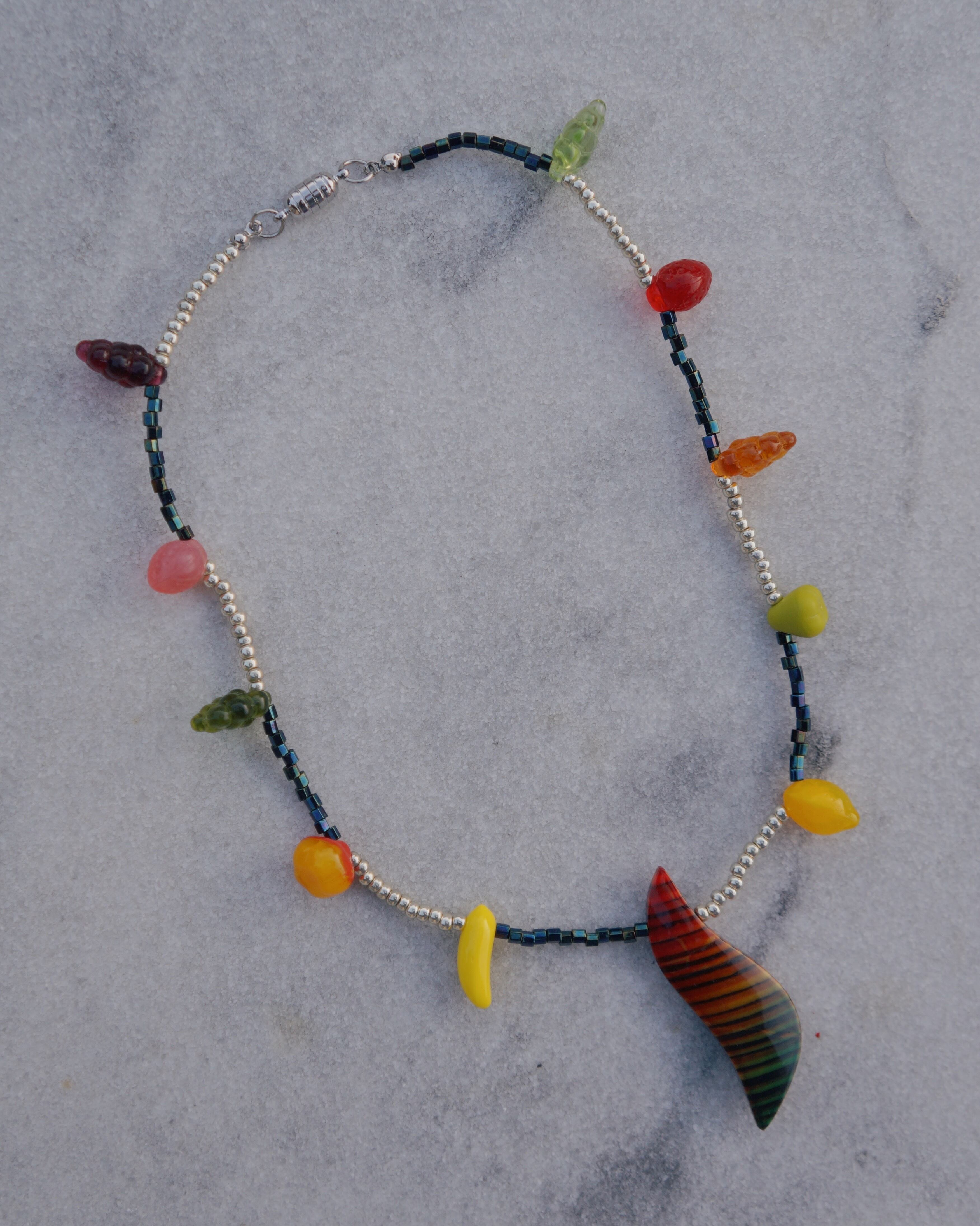 様々なフルーツのパーツと真ん中にはビンテージのレインボーカラーが可愛いウッドビーズをあしらったトロピカルなネックレスです。常夏の島で過ごすハッピーな時間を思い浮かべデザインしました。どのようなスタイリングも一気に首元が華やかで鮮やかになり気分も上がってしまうような一点です。(留め具はマグネットタイプです。)