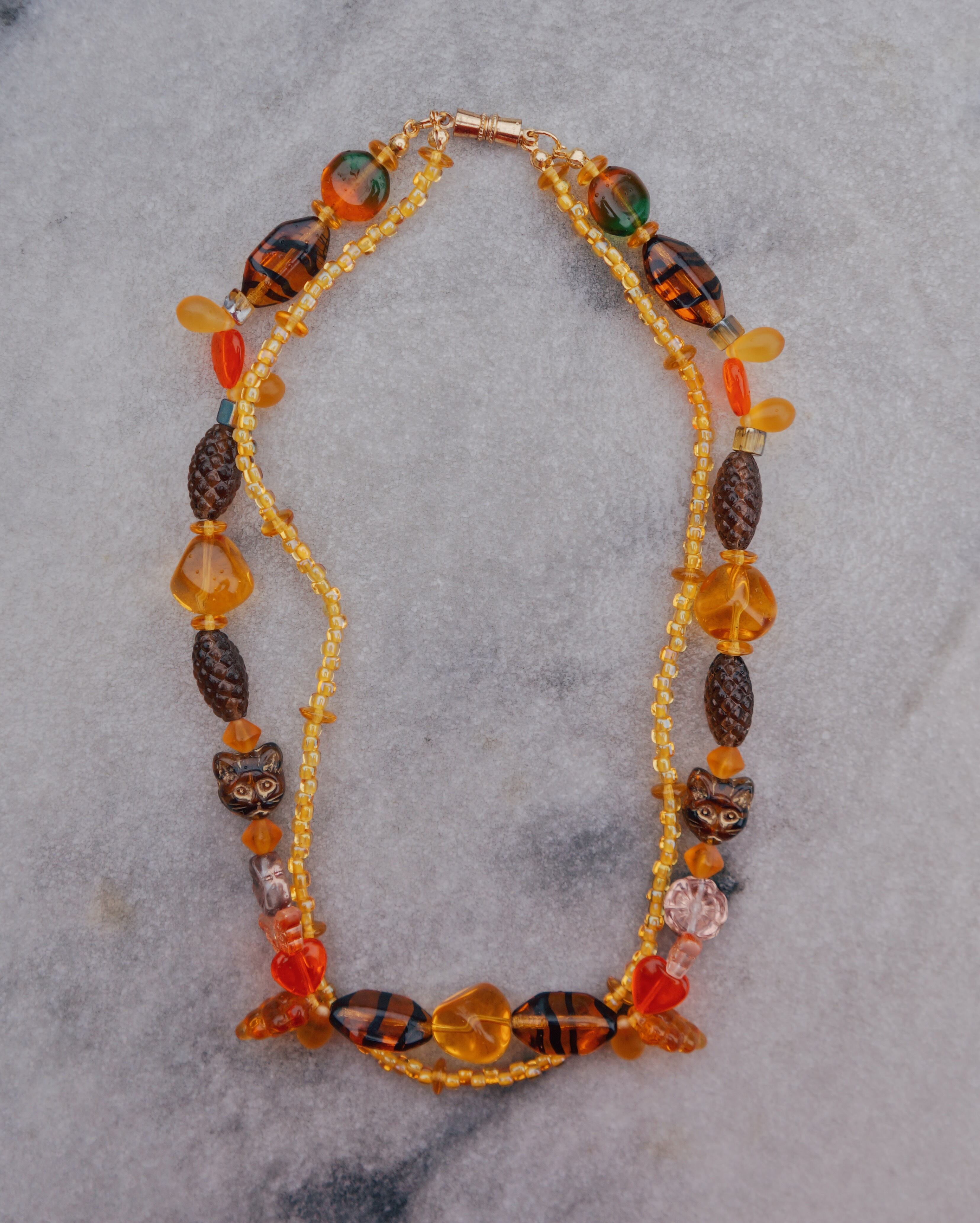 様々なシェープのビーズを選びデザインしたユニークなネックレスです。2連で存在感もあり、スタイリングの主役になるような一点です。猫のパーツが特に可愛く、猫好きさんに是非身につけてほしいなと思っています。(留め具はマグネットタイプです。)