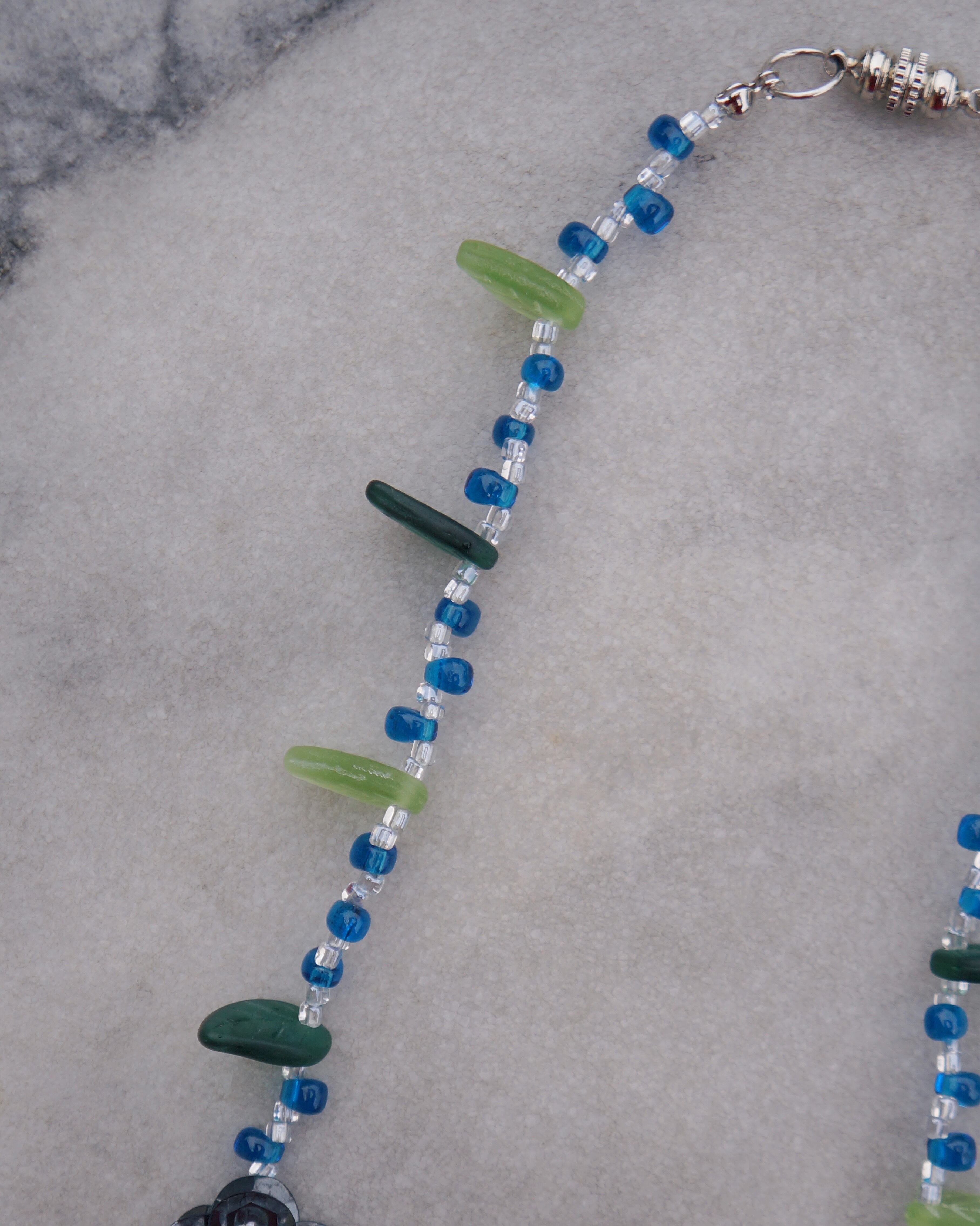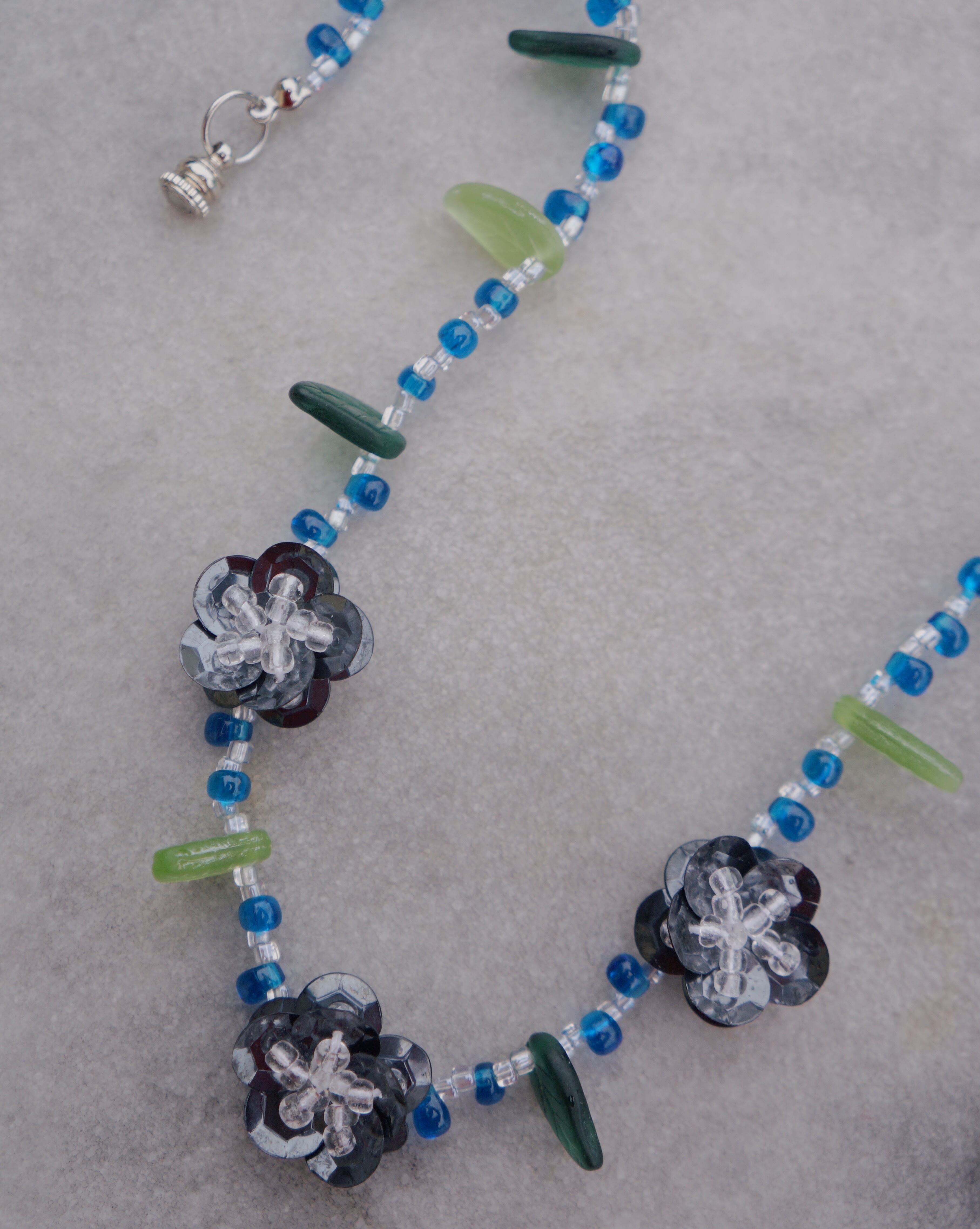 葉っぱのパーツとスパンコールでできているお花のパーツが素敵なネックレスです。ドレッシーなスタイルにも合わせれるようなエレガントさもあり、沢山のシーンで引き立つネックレスだと思います。長さはデザインに合わせ短めですが、ちょうど鎖骨あたりにくる使いやすい長さです。(留め具はマグネットタイプです。)