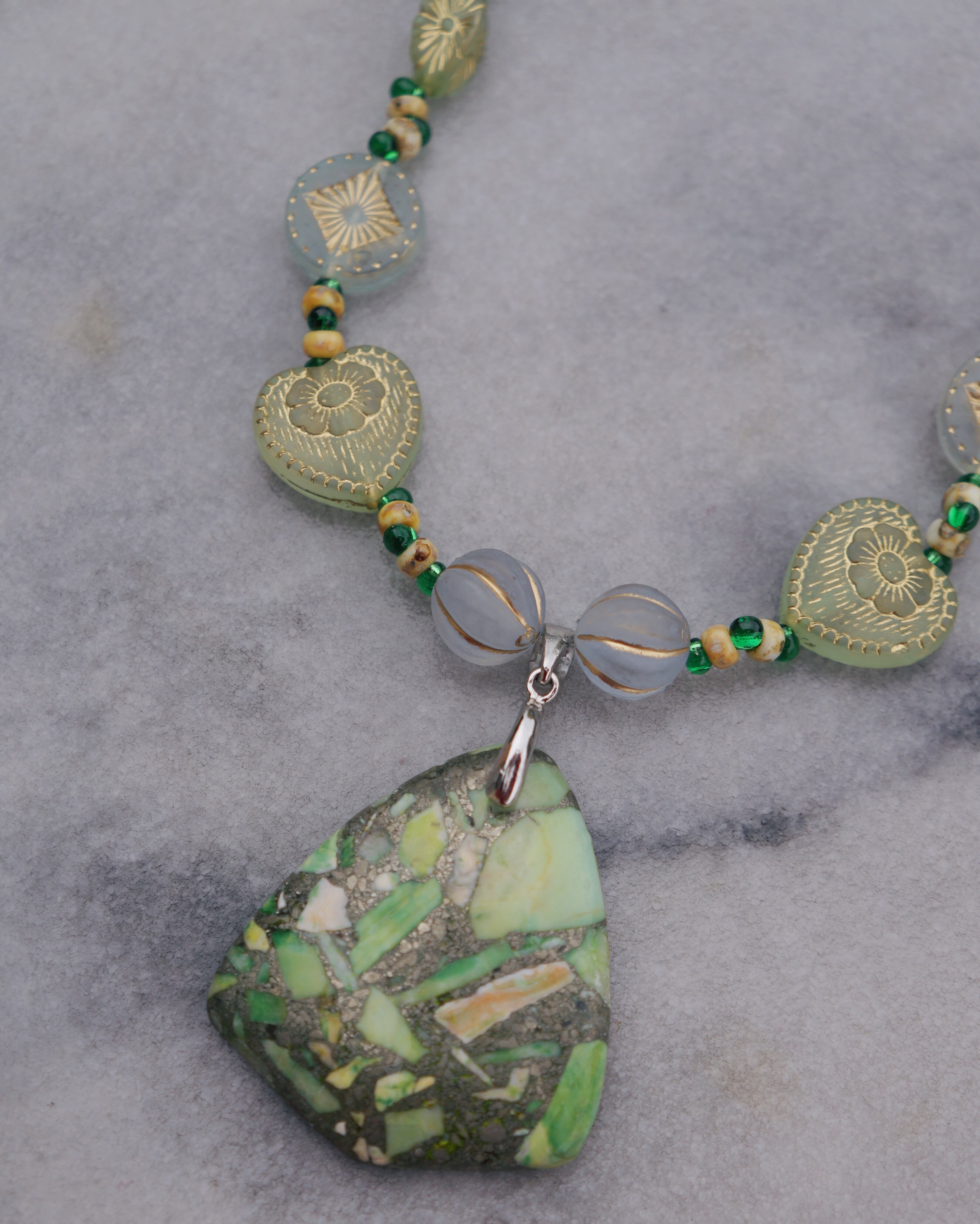 とても珍しいシーセディメントジャスパー(斑点のある石)をデザインのメインに美しいネックレスをデザインしました。チェコビーズでキュートさもありながらとてもエレガントな一点です。珍しいデザインで他とは被らないあなただけのスペシャルなネックレスです。(留め具はマグネットタイプです。)