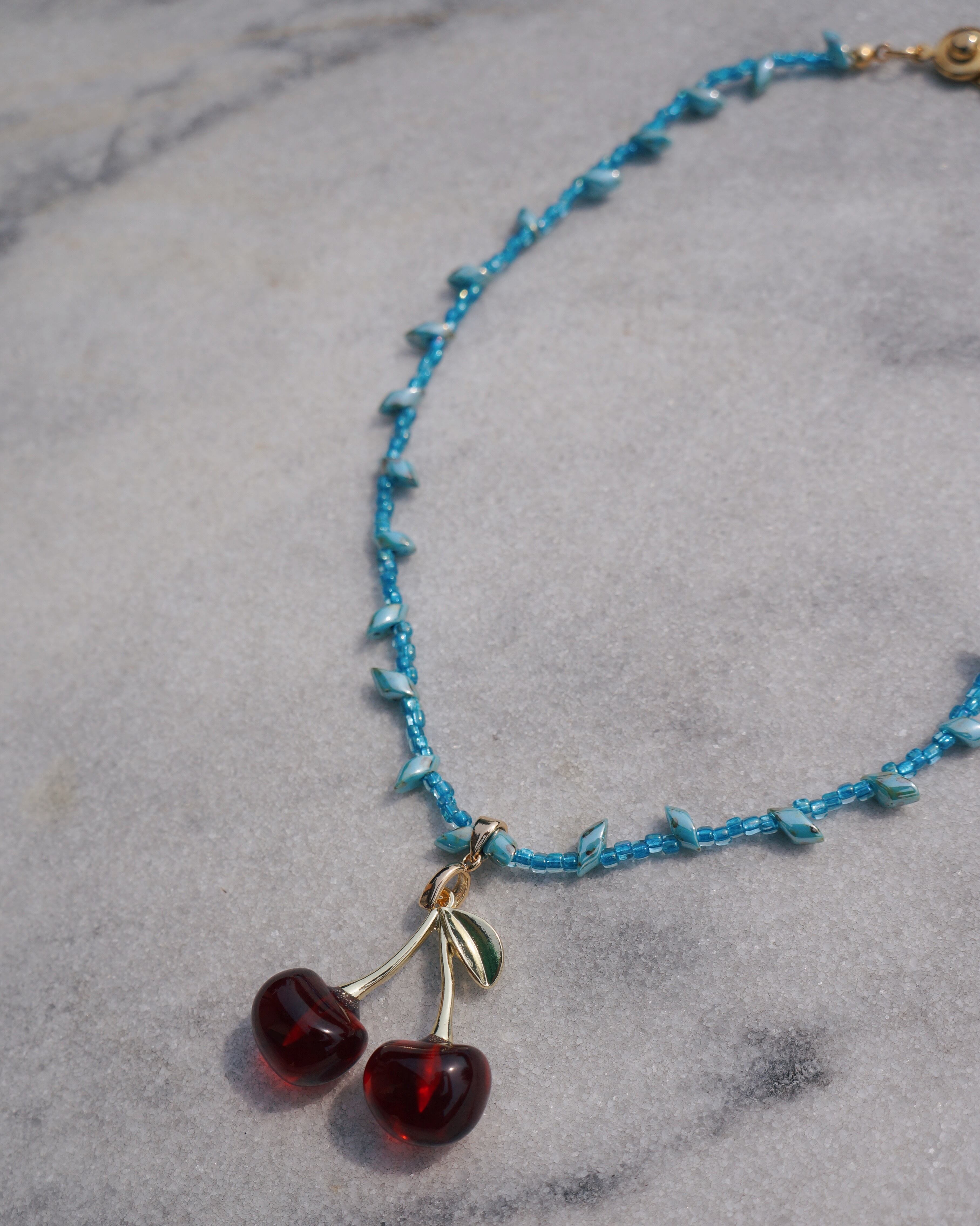 大ぶりのぽてっとしたディテールが可愛いチェリーのパーツと、水色のビーズが女心をくすぐる一点です。インパクトはありながらどのようなスタイリングにも合わせやすいです。アメリカンダイナーにいるようなキュートな女の子をイメージしてデザインしたネックレスです。Tシャツは勿論、タンクトップやキャミソールなどとの相性が抜群なのでこれからの季節におすすめです。