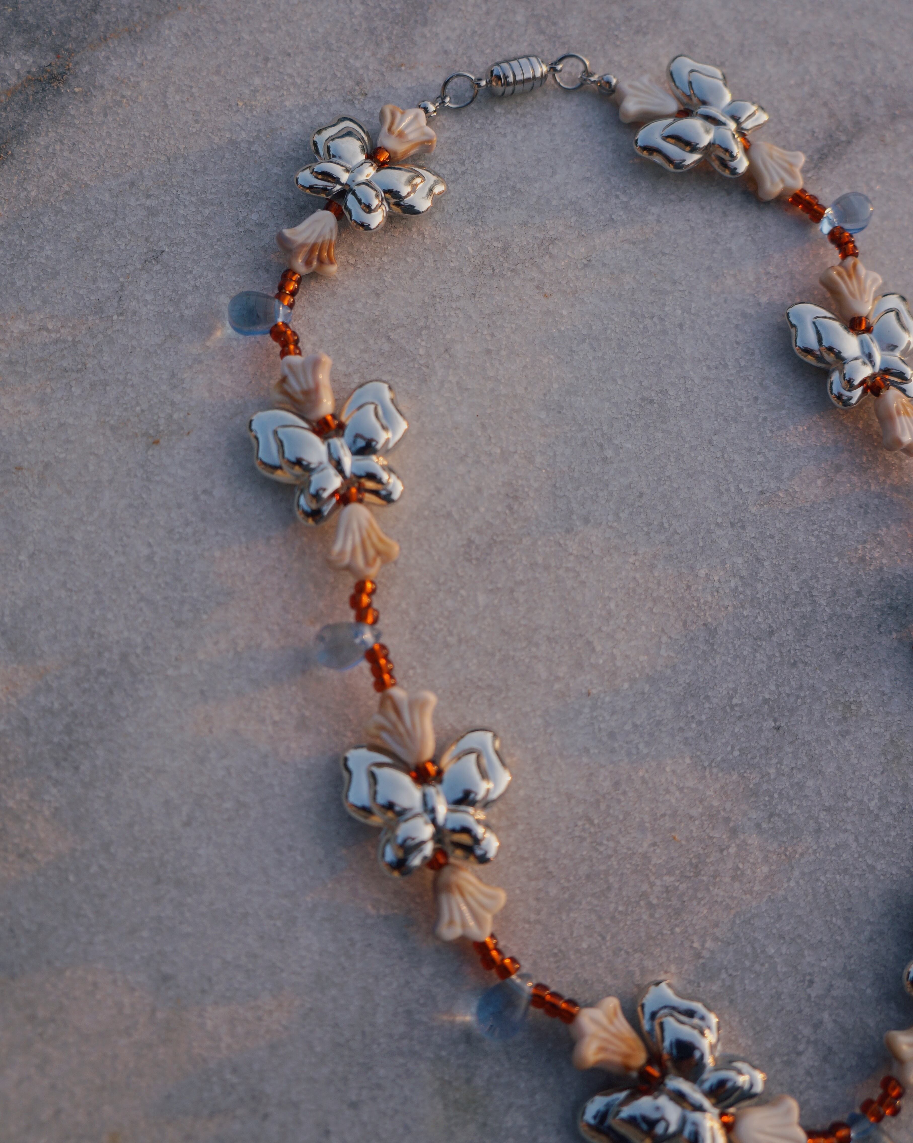 スタイリングの主役になるような存在感があるネックレスです。パーツ一つ一つに拘り、美しく舞い輝く蝶をイメージしてデザインしました。2連のブレスレットとして使うのもおすすめです。(留め具はマグネットタイプです。)