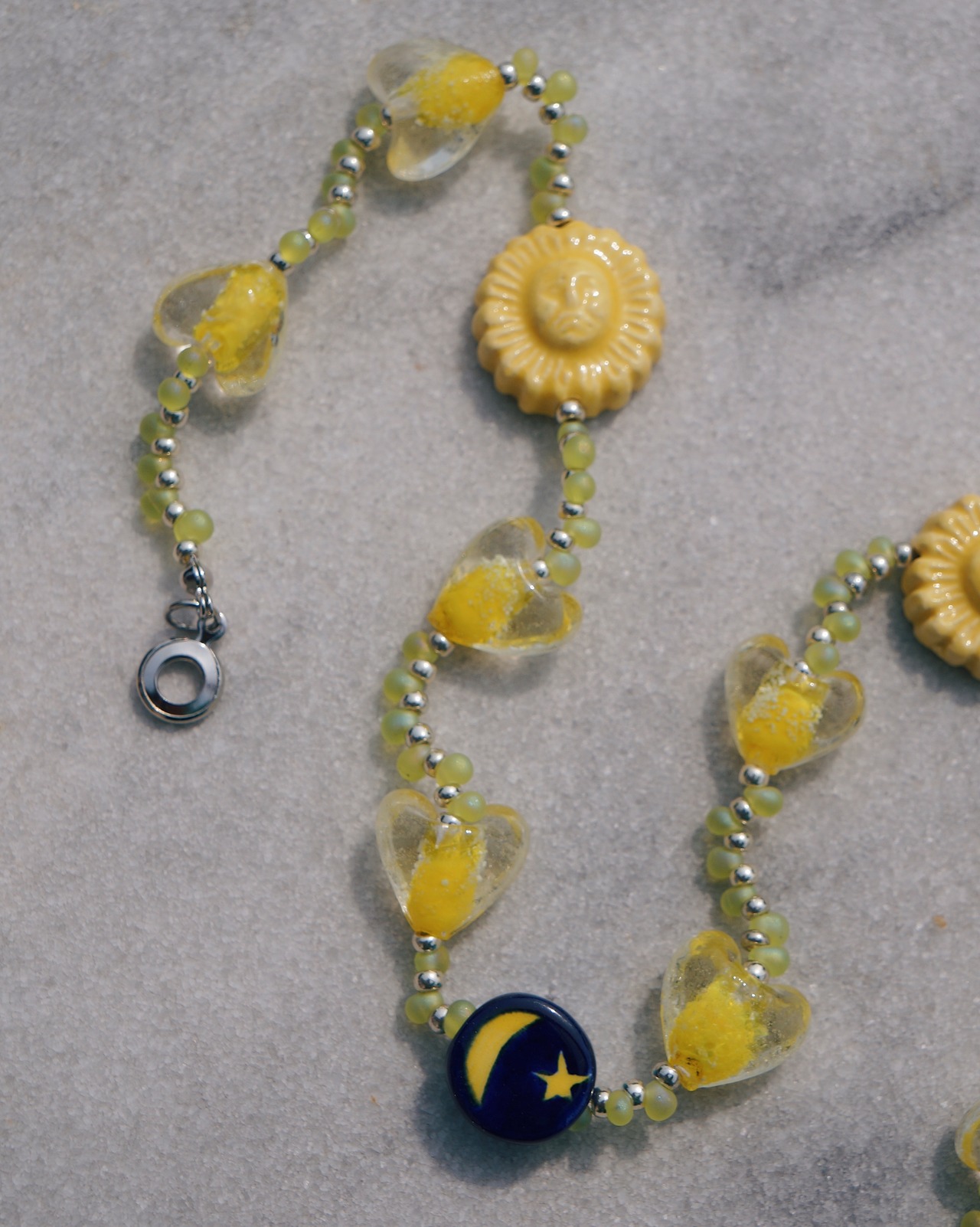 ハートのランプワークビーズと、セラミックのパーツがキュートでポップな一点です。身につけると一日元気で過ごせるような気分になってほしいと願いデザインしました。Tシャツは勿論、タンクトップやキャミソールなどとの相性が抜群なのでこれからの季節におすすめです。
