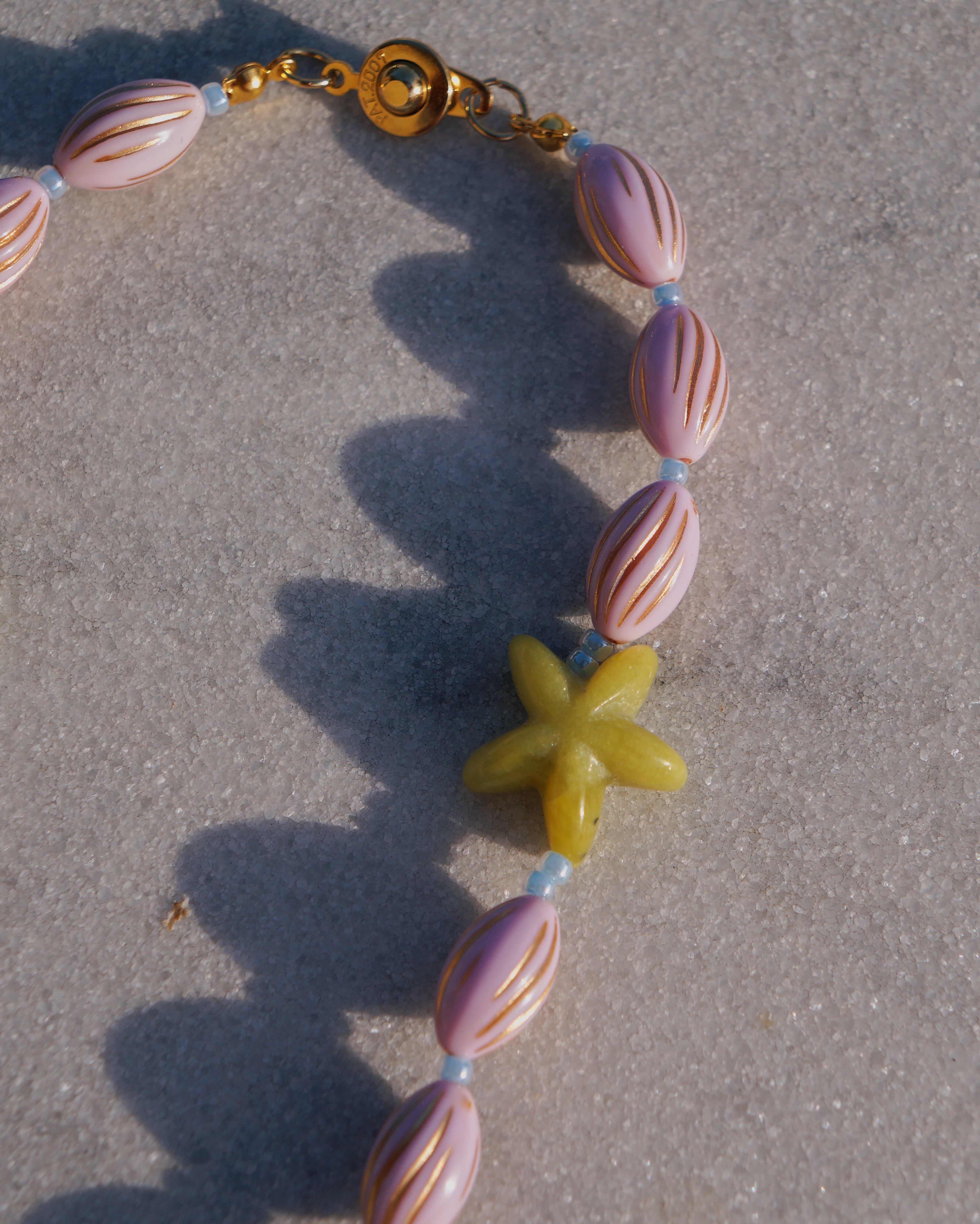 レモンストーンでできたヒトデのパーツやベネチアンガラスのチャームが珍しい一点です。ボッティチェリの絵画をイメージしてデザインしました。カジュアルなスタイリングにもドレスアップしたスタイリングにもぴったりです。