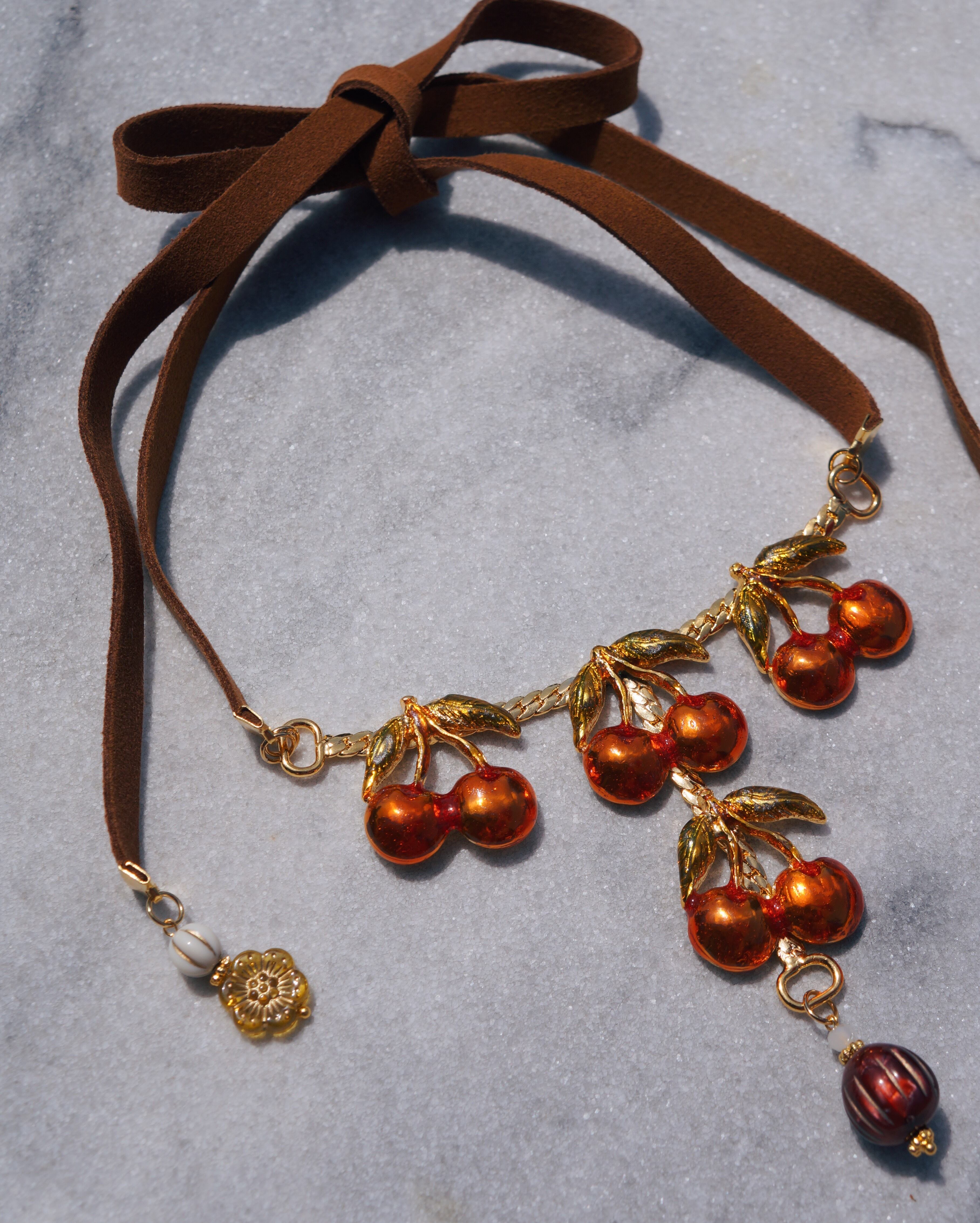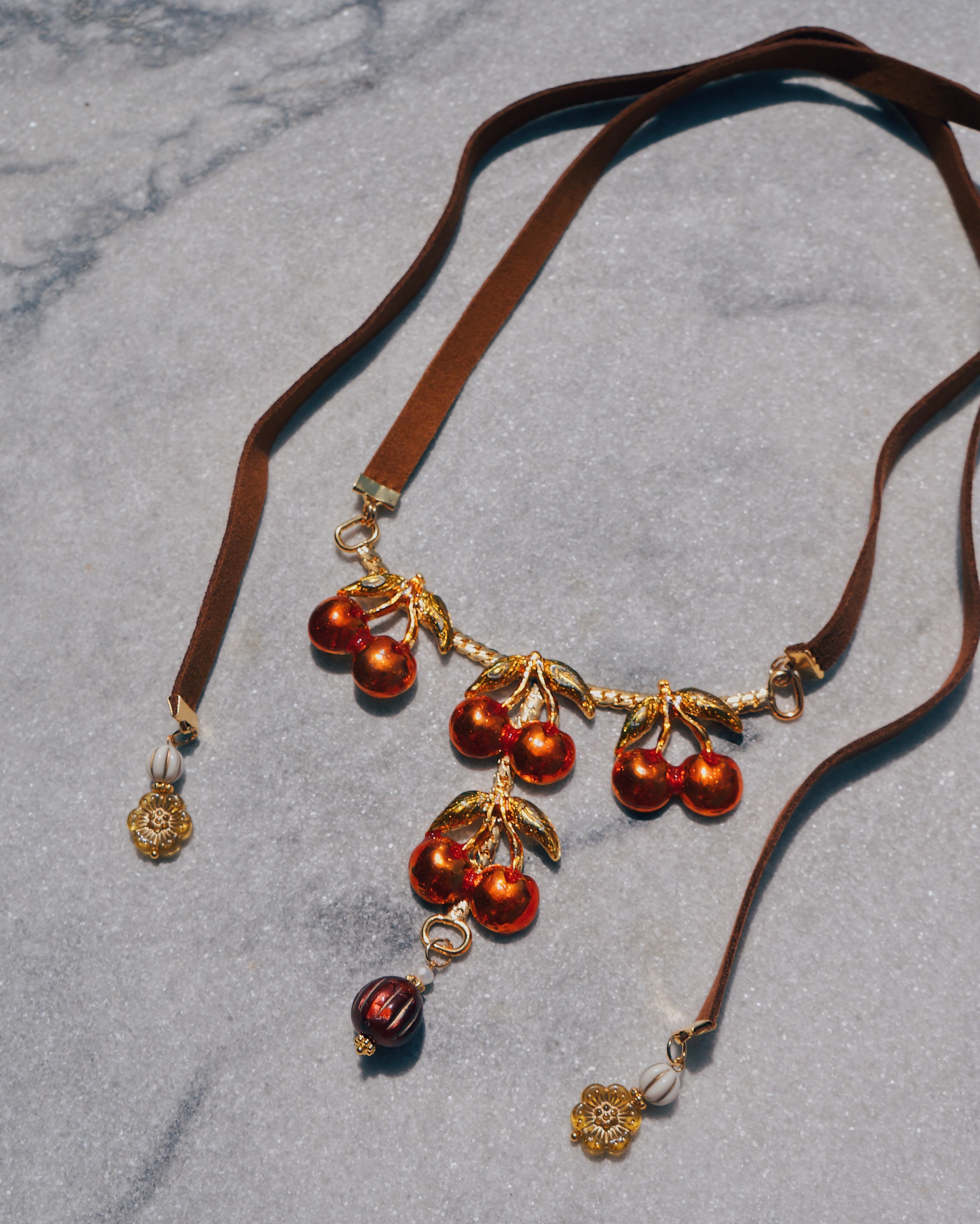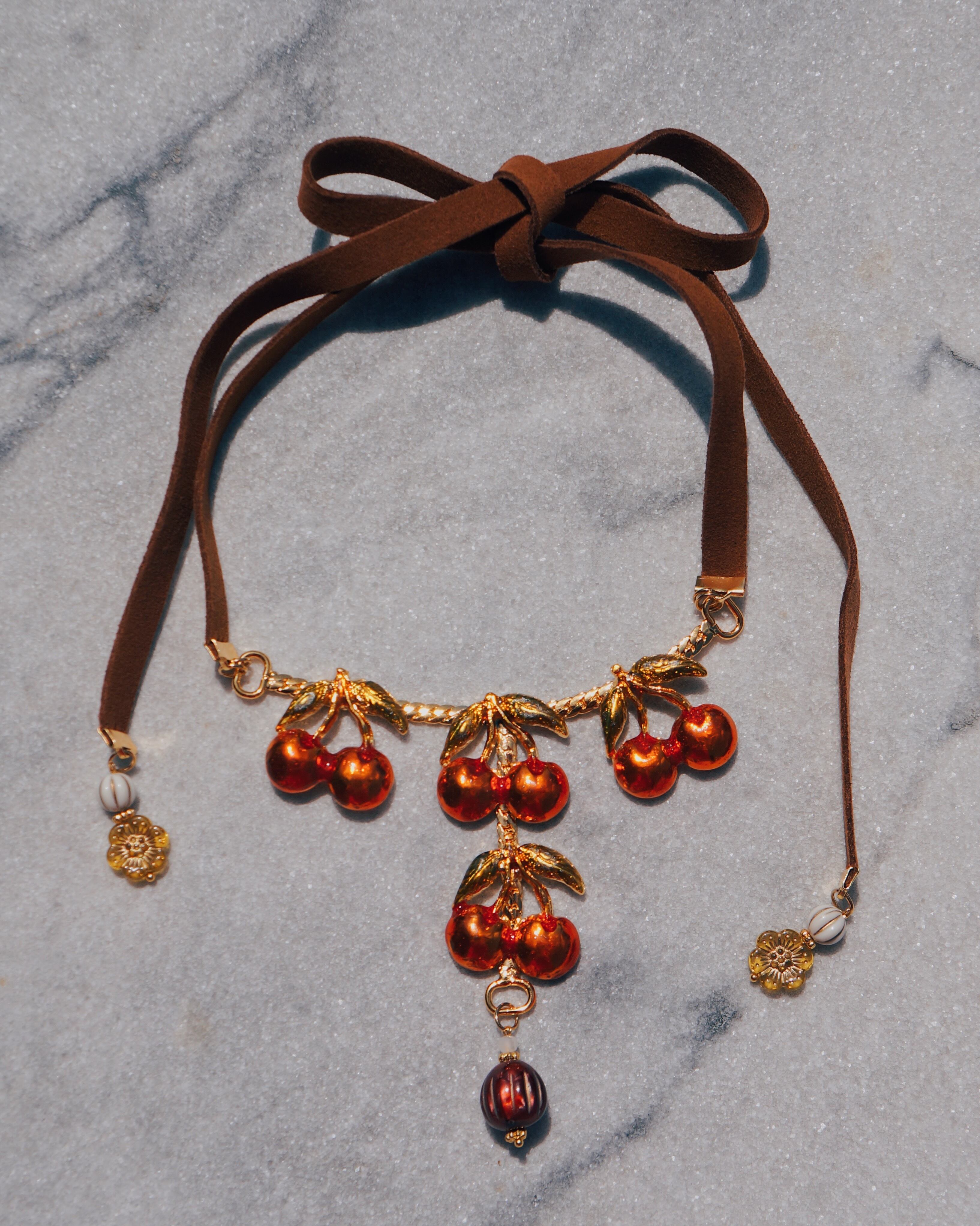 とても珍しいイタリア製のビンテージのパーツ(チェリーモチーフ)を使った美しい一点です。後ろで結ぶタイプのネックレスなので、後ろ姿もとってもキュートです。コーディネートの主役になるようなスペシャルなネックレスです。結ぶタイプなので腰に巻いたり、カバンにつけたりと様々な使い方も楽しんでもらえます。