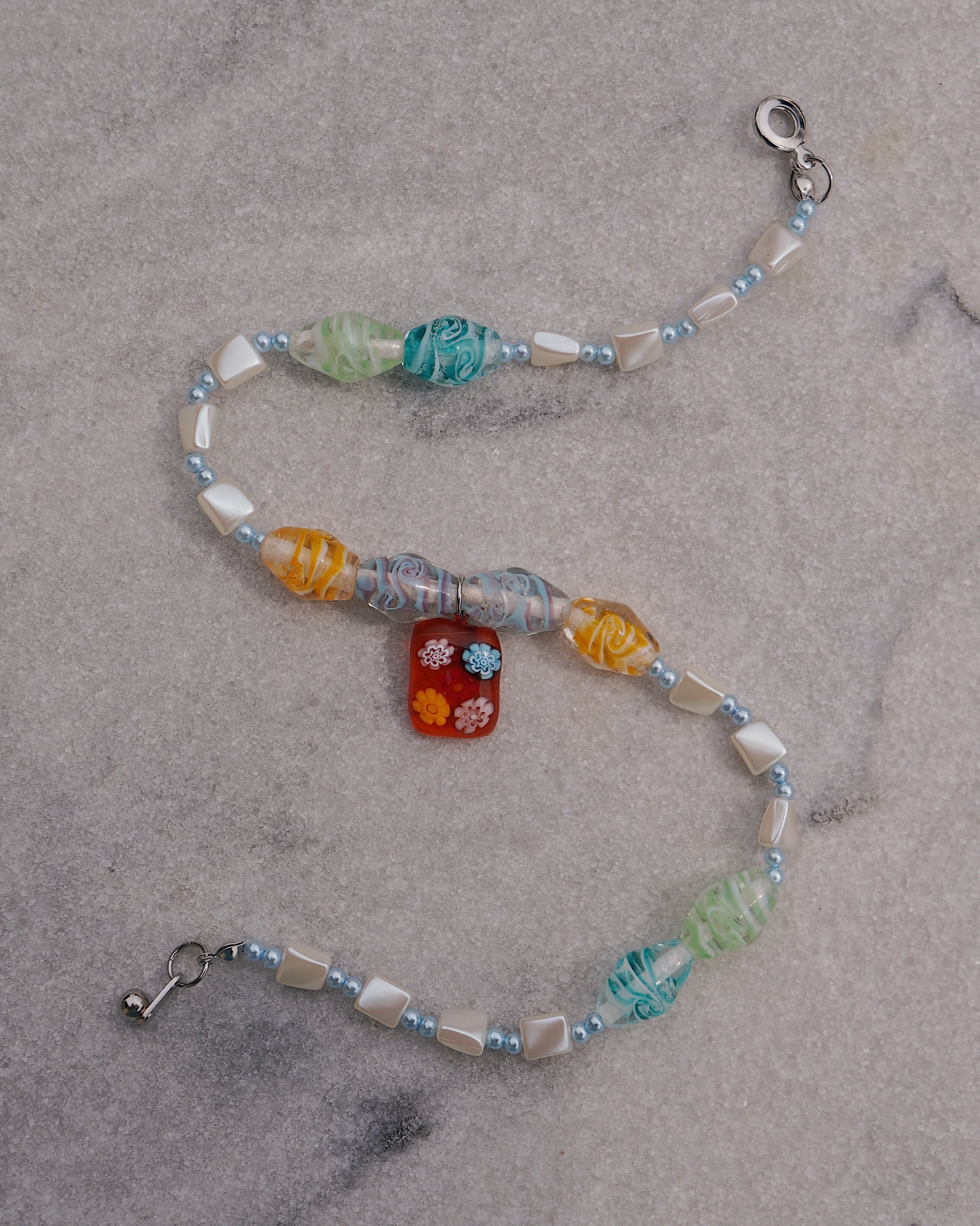 淡い色でまとめた美しい一点です。様々なカラーのガラスビーズと珍しいミルフィオリのチャームがとっても素敵です。メキシコの街並みや教会からインスピレーションをうけデザインをしました。長さはデザインに合わせ短めですが、ちょうど鎖骨あたりにくる使いやすい長さです。