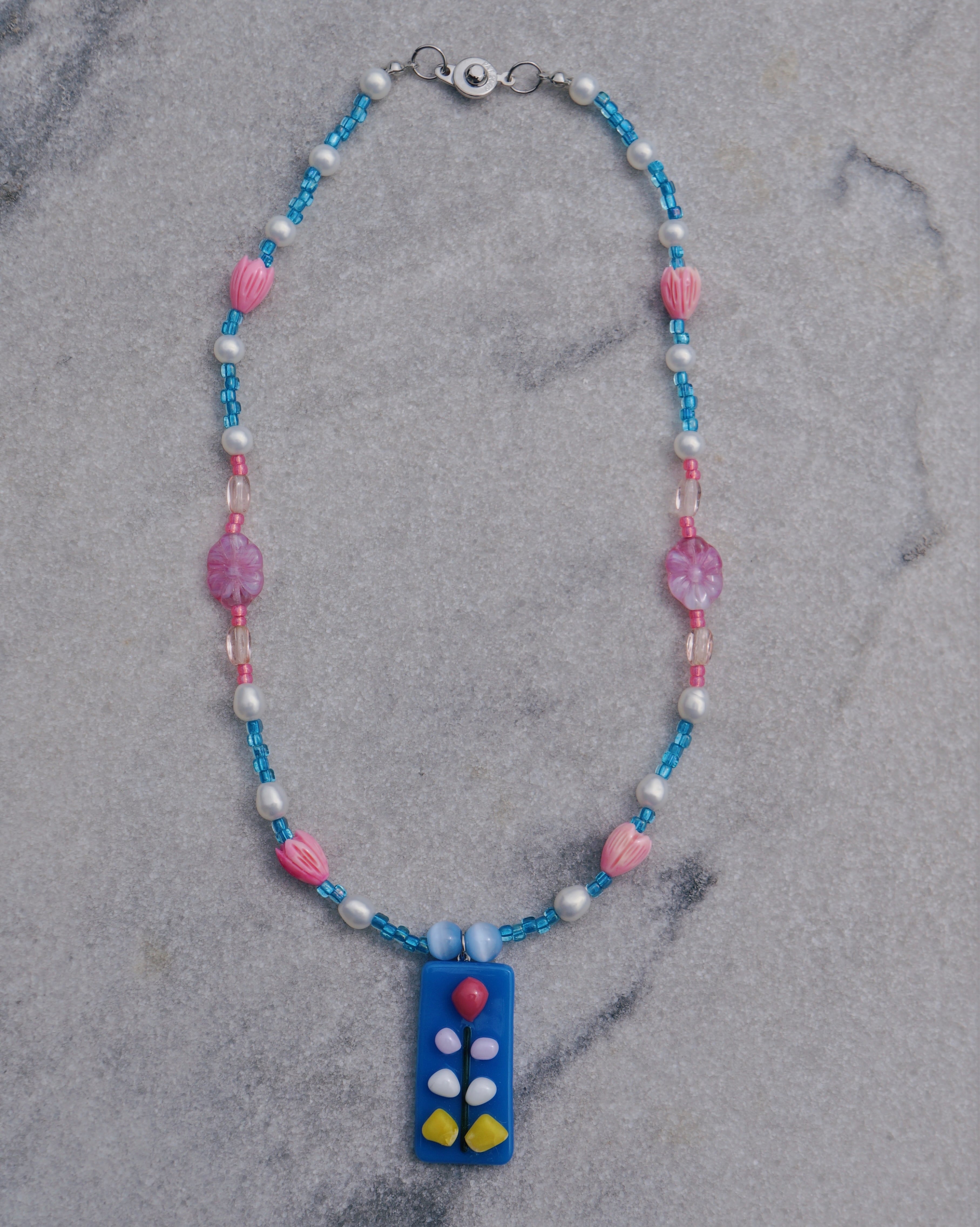 青とピンクのカラーコンビネーションと珍しいガラスチャームがとっても素敵な一点です。ですが、JBCGらしいユニークさもあります。メキシコの街並みや教会からインスピレーションをうけデザインをしました。Tシャツは勿論、タンクトップやキャミソールなどとの相性が抜群なのでこれからの季節におすすめです。