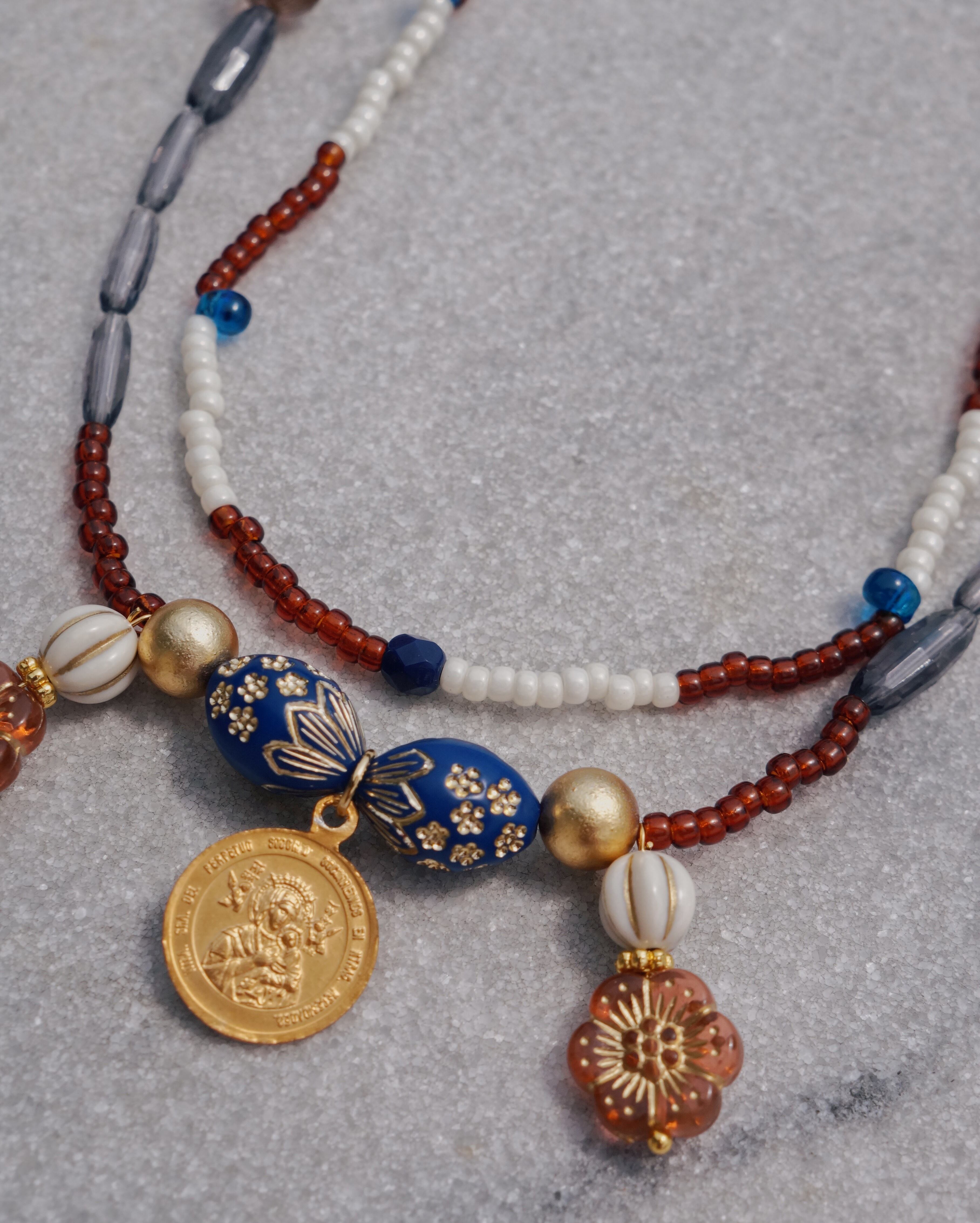 ユニークでありながらシックな雰囲気もある美しい2連のネックレスです。カラーコンビネーションやパーツにこだわりとても存在感のある一点ができました。メダイチャームはメキシコ製のものを使っています。メキシコの街並みや教会からインスピレーションをうけデザインをしました。