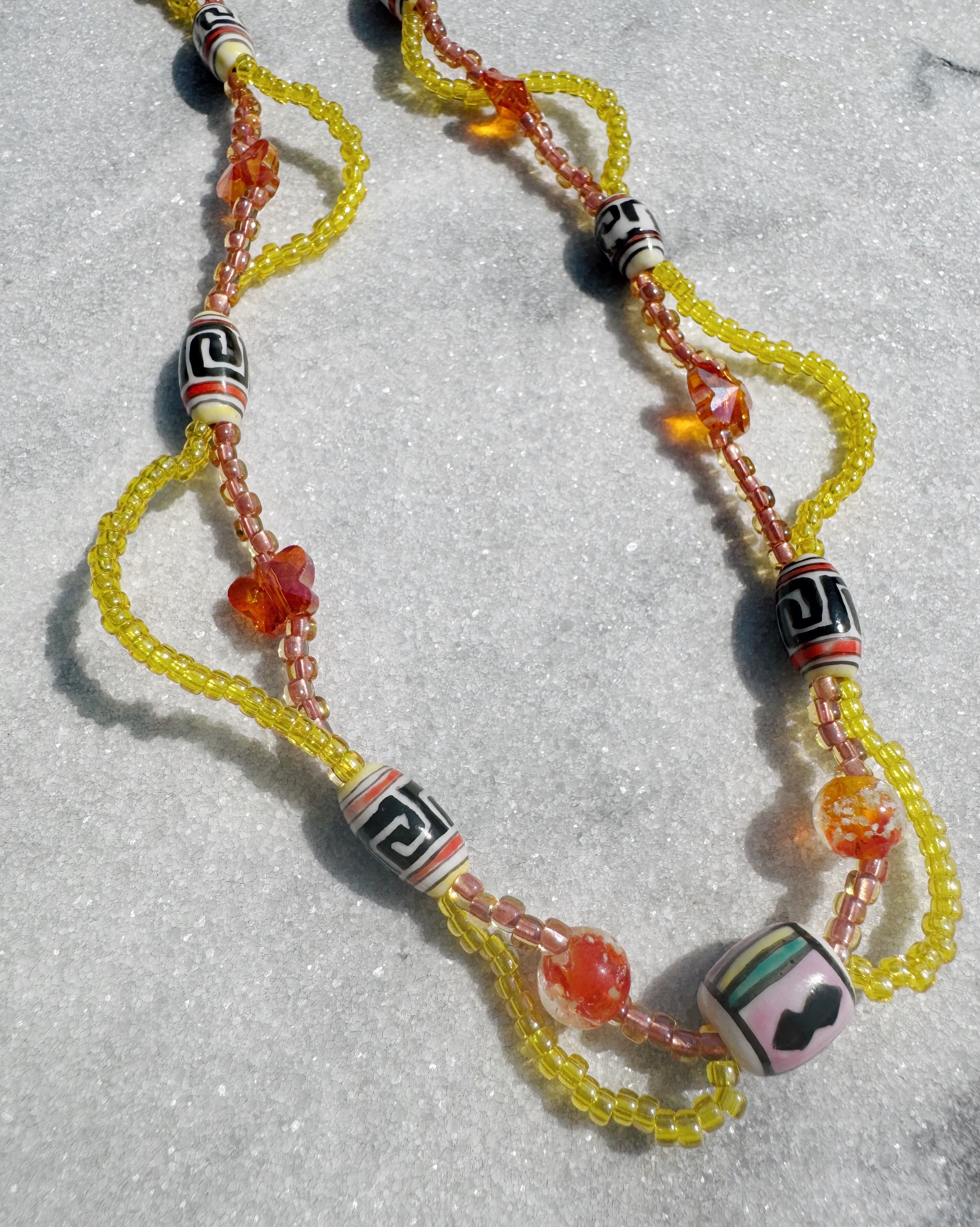 ビンテージのセラミックビーズとクネクネしたデザインが可愛い一点です。カラーコンビネーションもとっても素敵でJBCGらしいユニークなデザインです。蝶が太陽の光に照らされるとさらにキラキラ光りつけているだけで元気になれそうなネックレスです。
