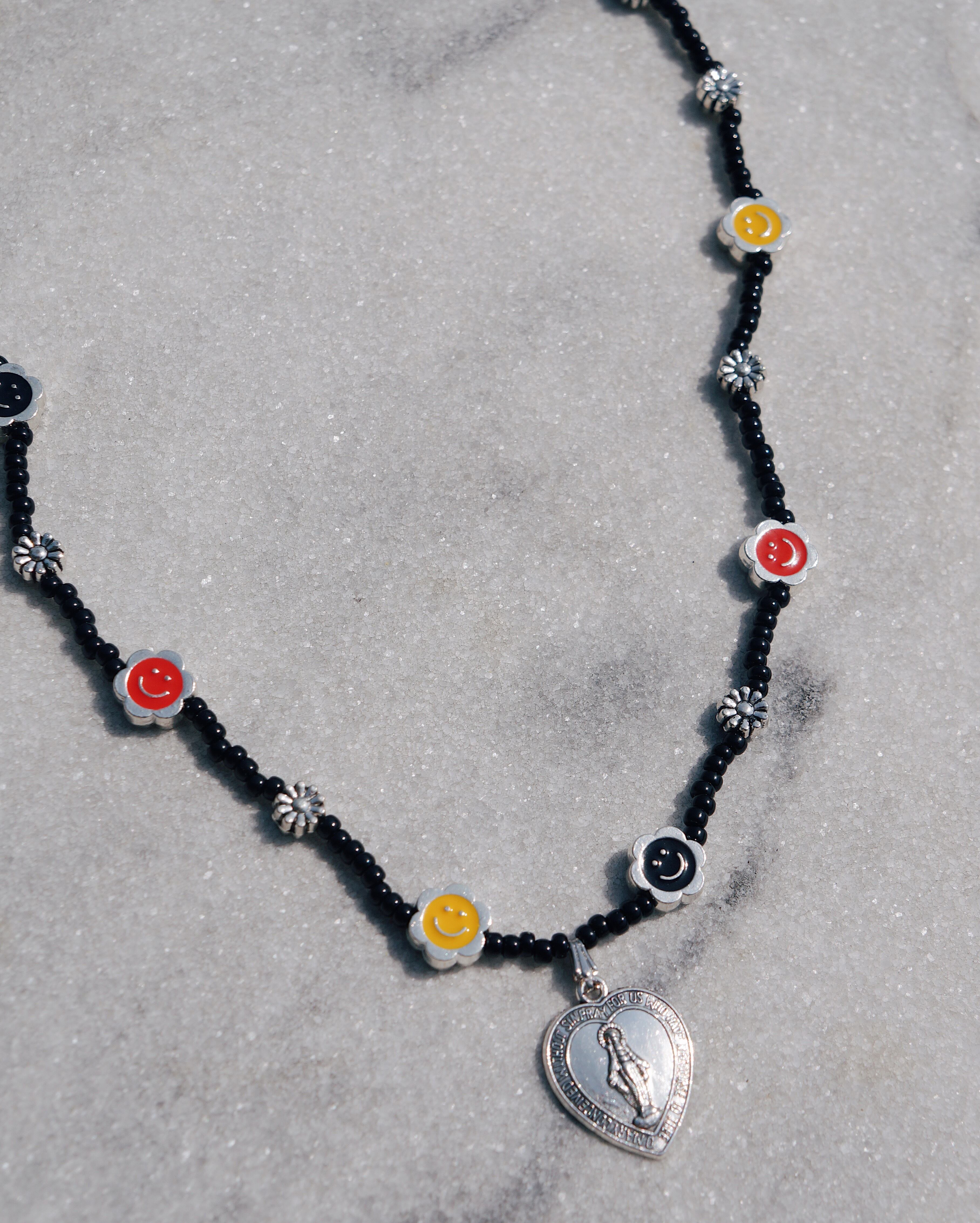 お花とニコちゃんマークのビーズがキュートなシンプルだけどポップなネックレス。他のネックレスとの重ね付けにもおすすめです。ブラックがベースなのでどんなお洋服にも合わせやすくとっても使いやすい一点です。