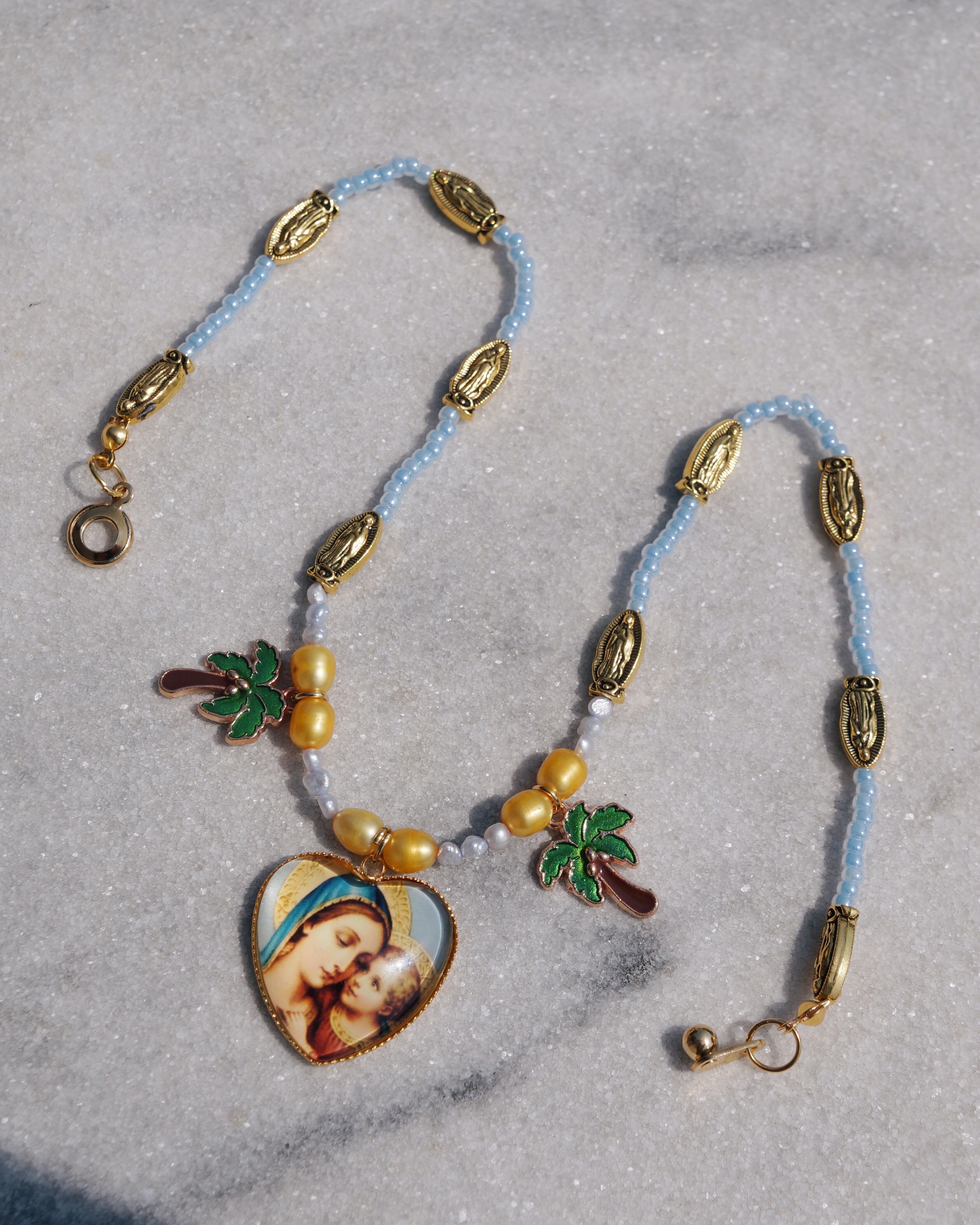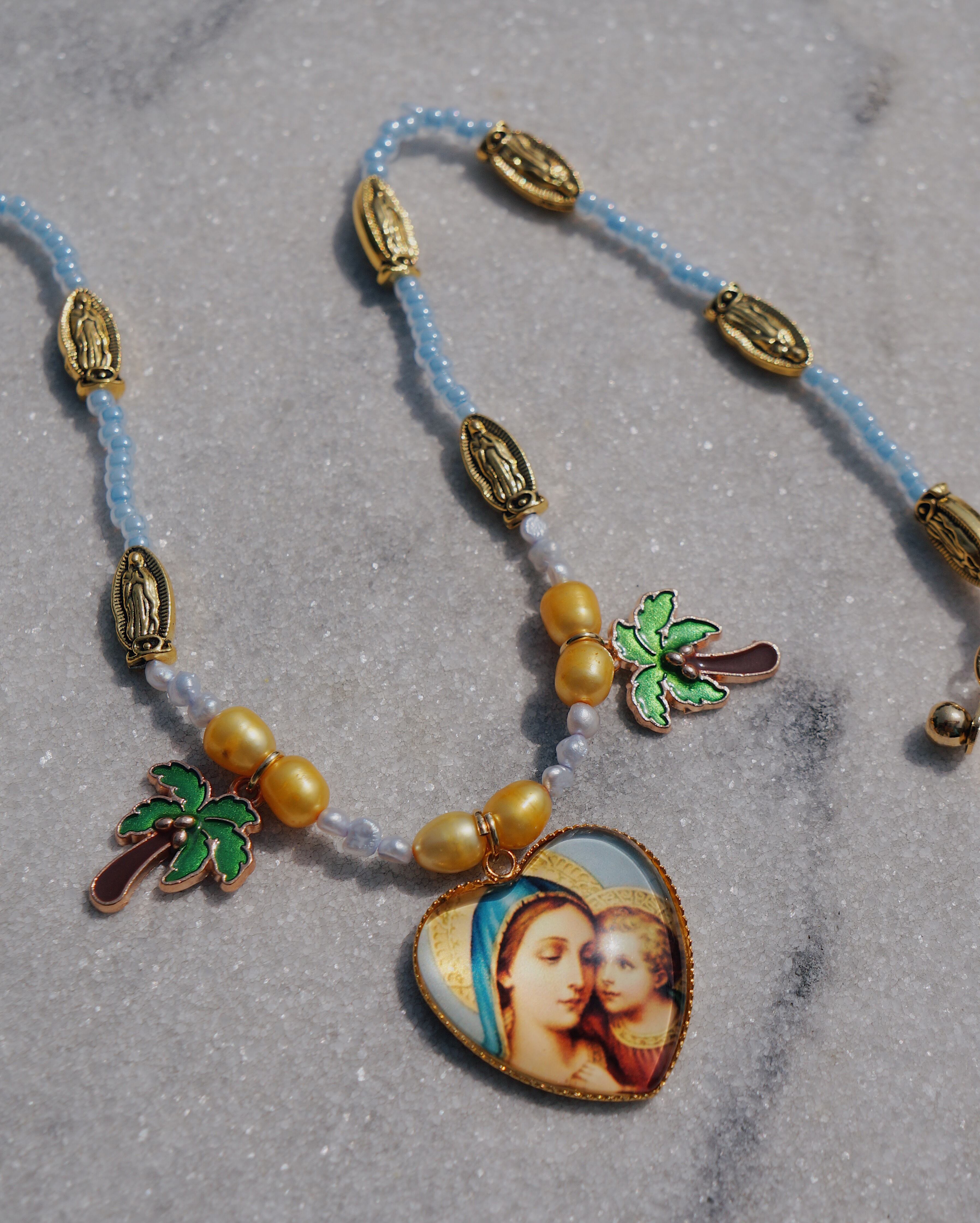 南米の海沿いに建つ教会を思い浮かべデザインした美しい一点です。合わせやすい色ですのでどんなお洋服にも使いやすいですが、しっかりと存在感あり他とは被らないユニークなデザインのネックレスです。淡水パールと3つの素敵なチャームが首元を明るくしてくれます。