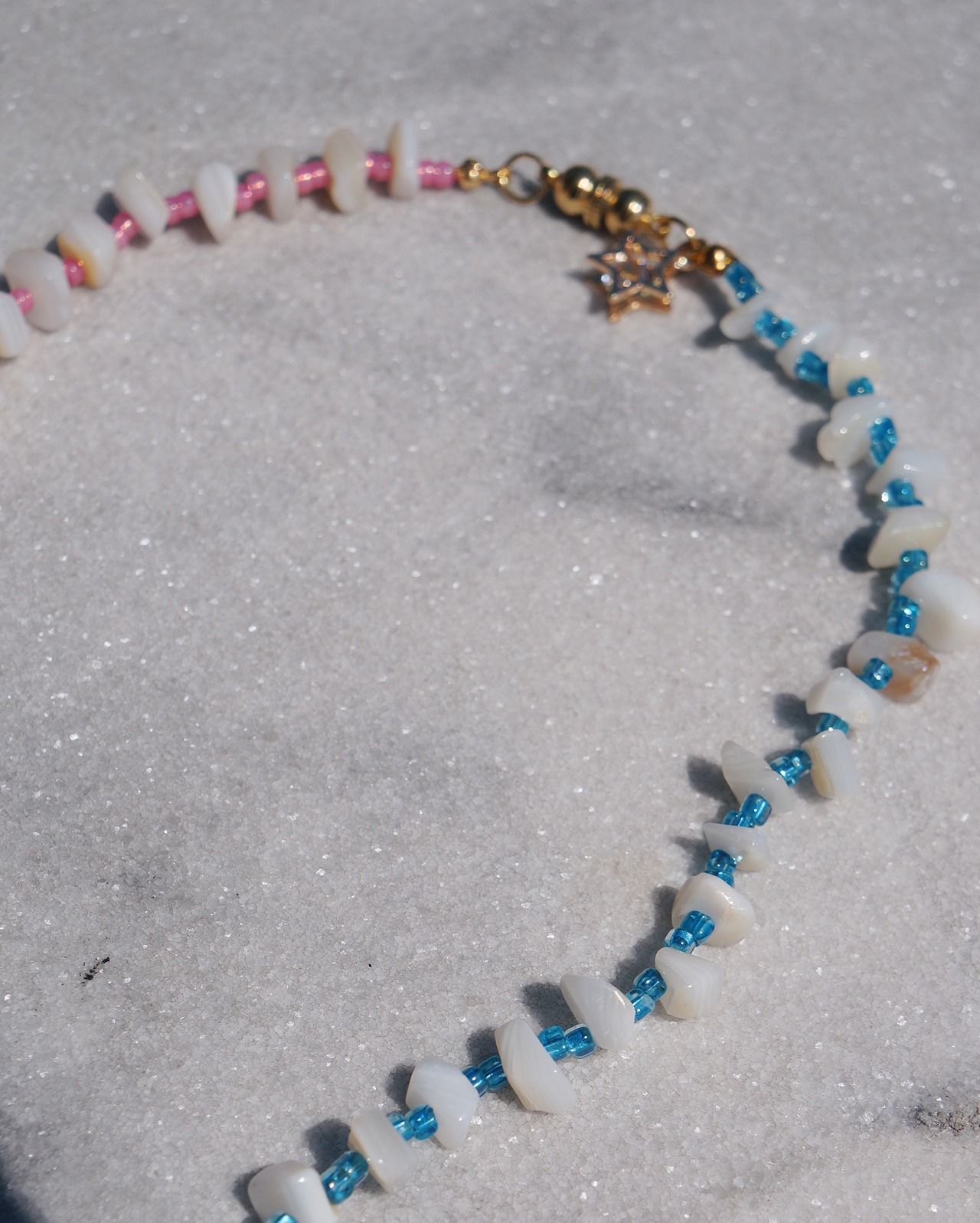 カラフルでキラキラしたお花でできた十字架のパーツがキュートなネックレスです。敢えて左右非対称のカラーにしてユニークさや遊び心を出しました。シェルビーズが夏らしさもあり、コーディネートを華やかに明るくしてくれる一点です。(留め具はマグネットタイプです)