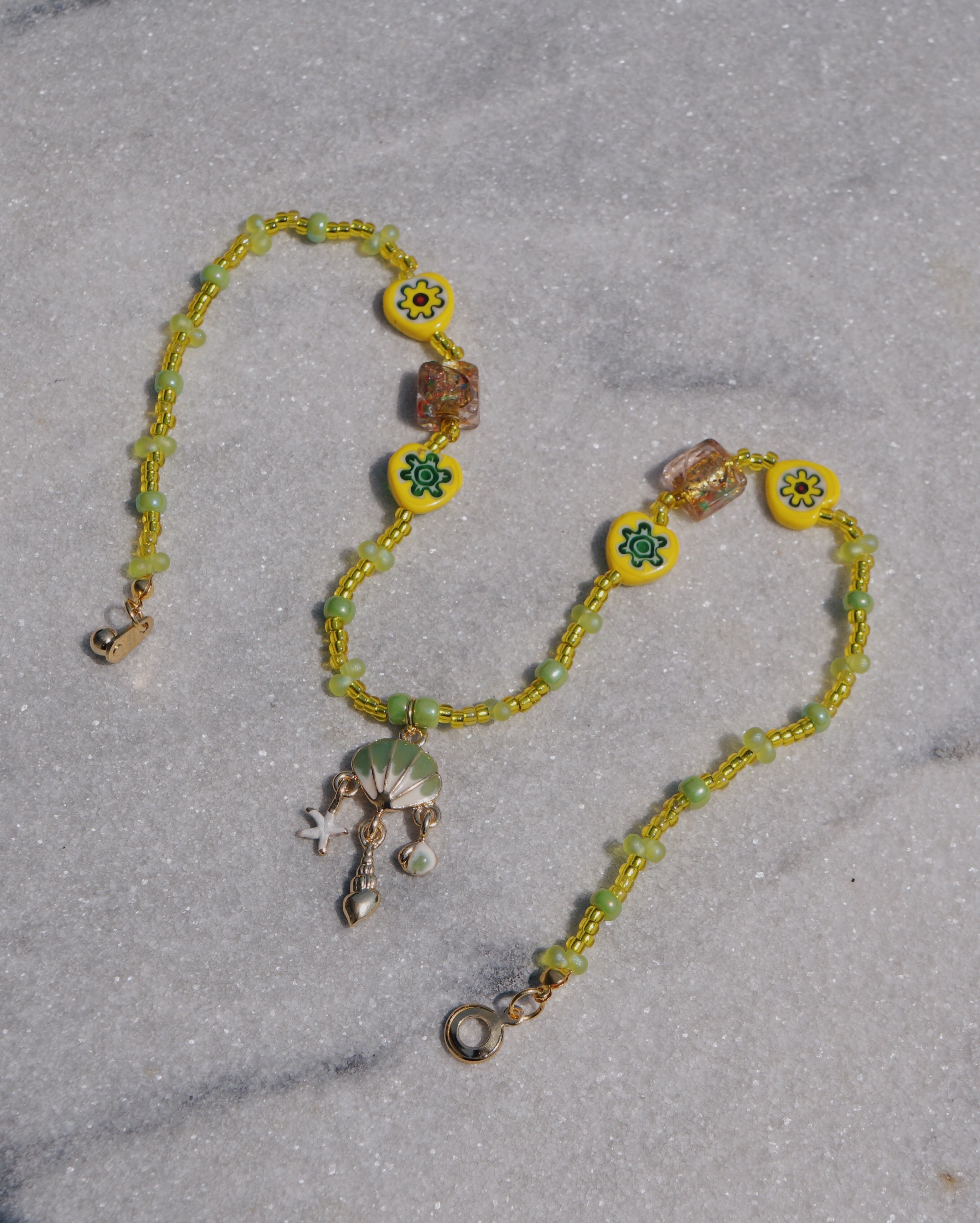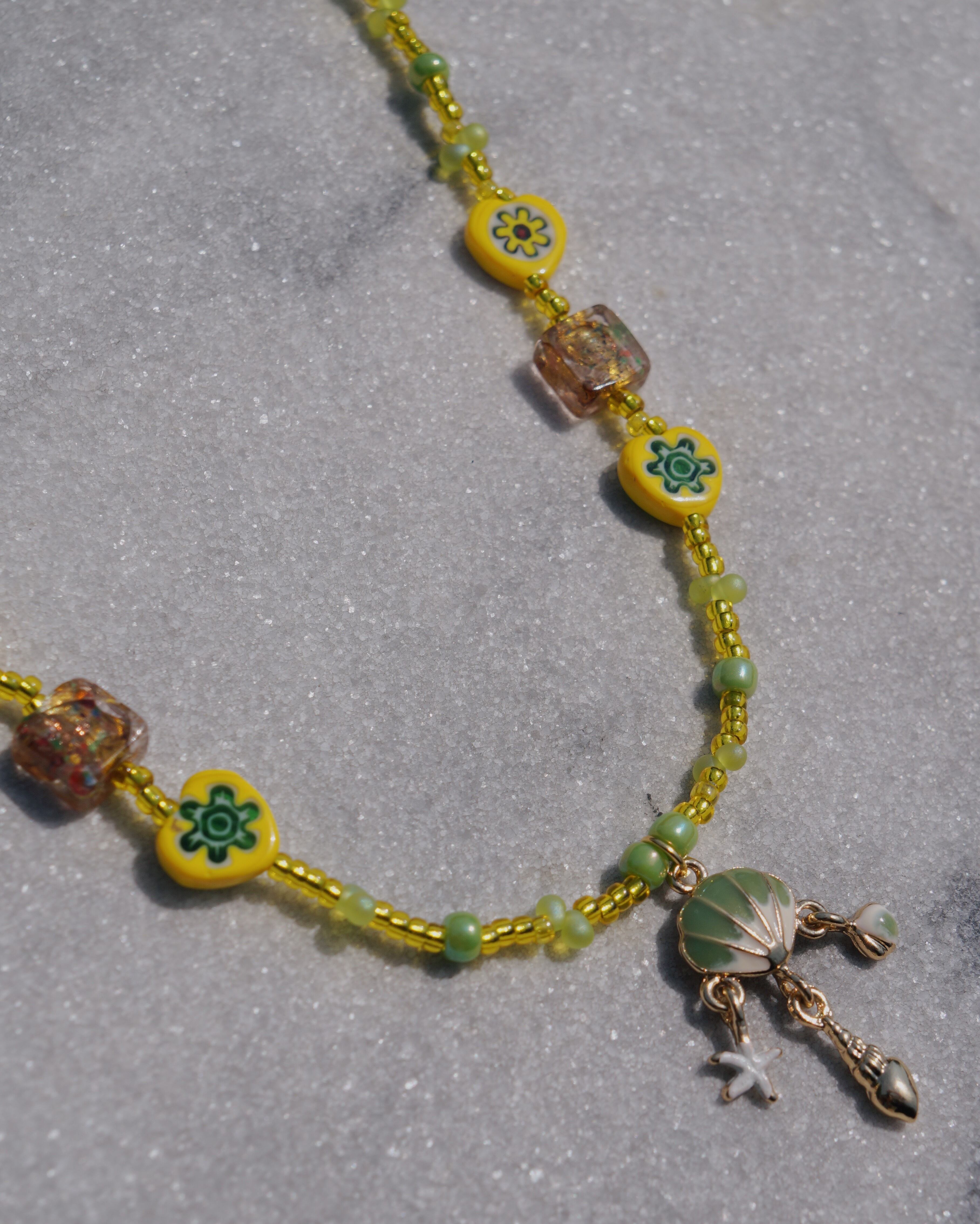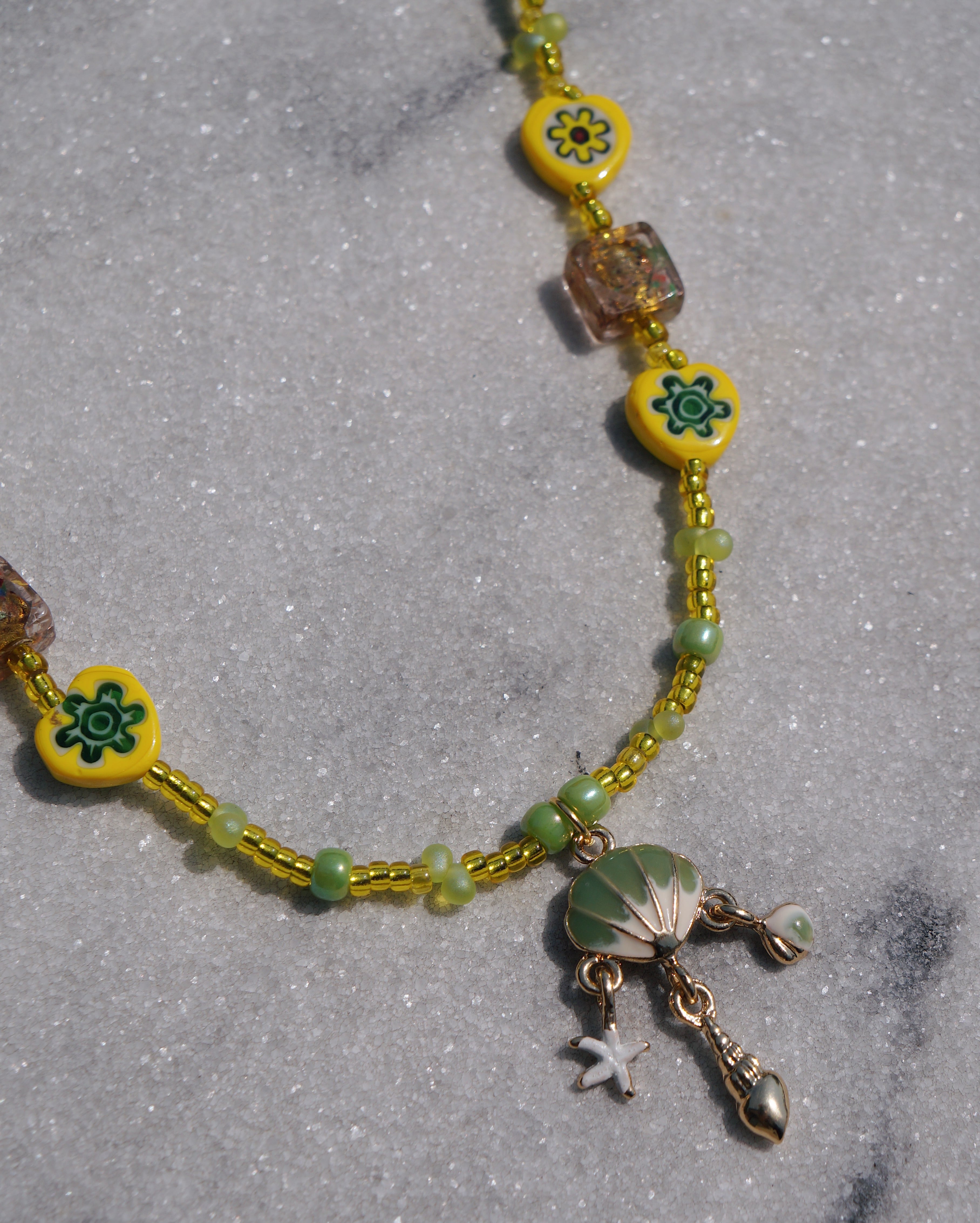 黄色と黄緑のカラーコンビネーションが夏らしいネックレスです。ゆらゆら揺れる貝のチャームとガラスのビーズでユニークさを出し、JBCGらしい一点にデザインしました。
