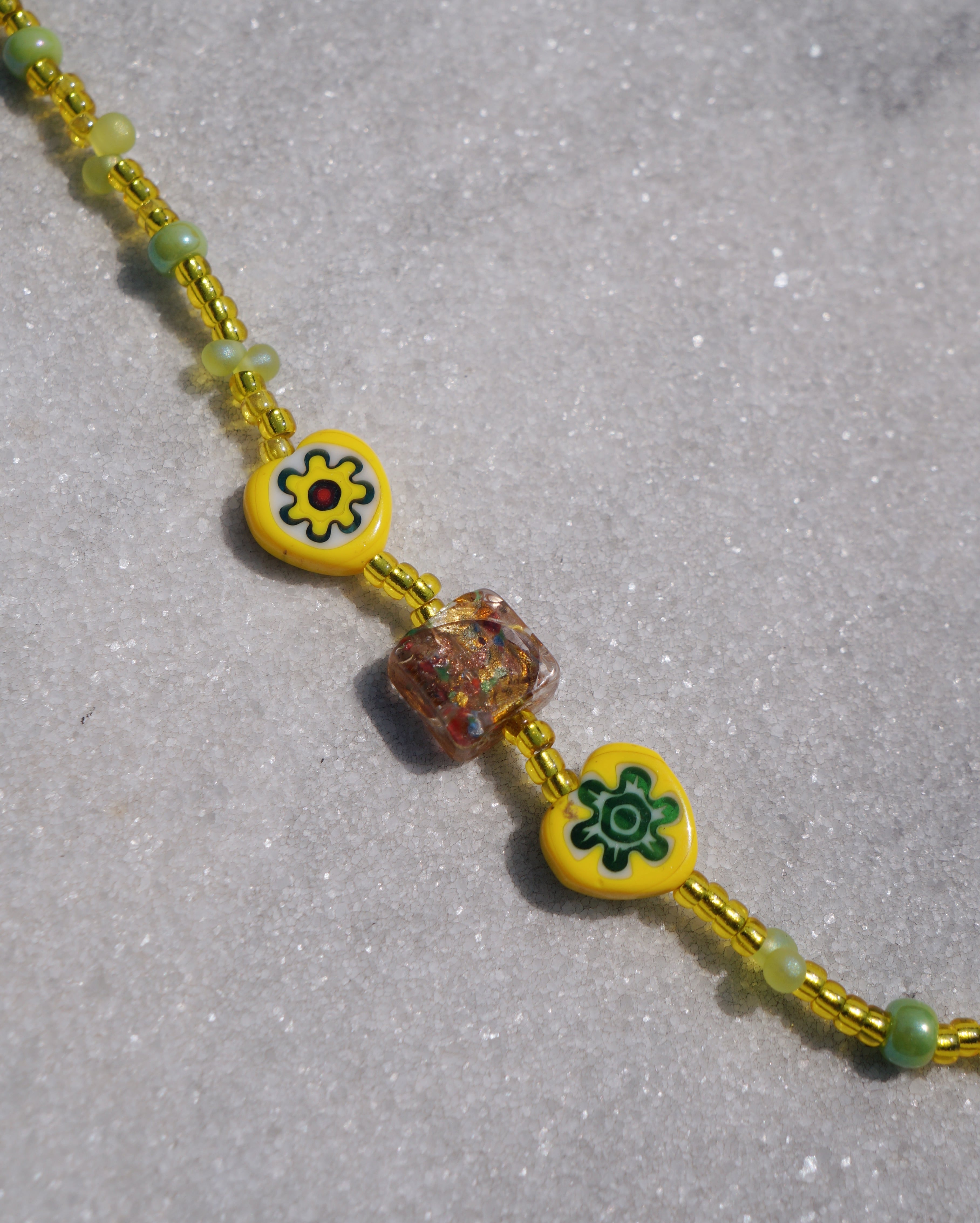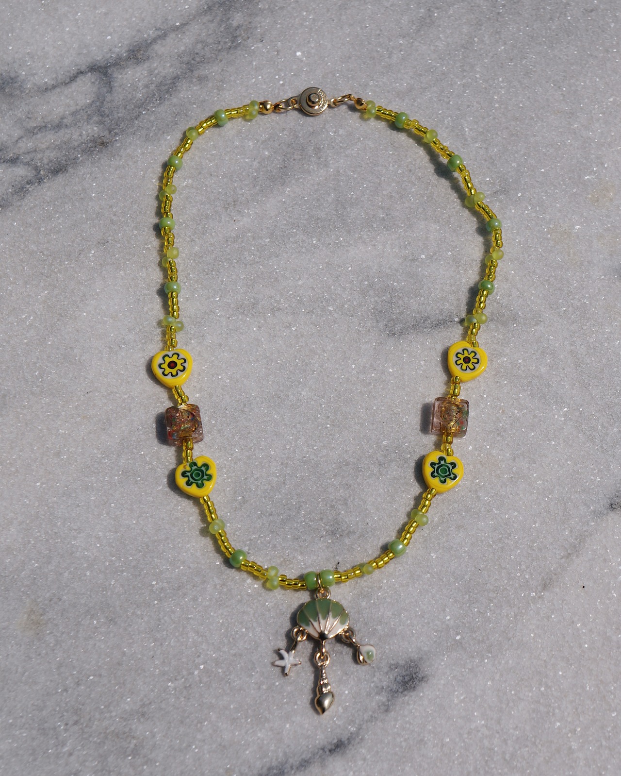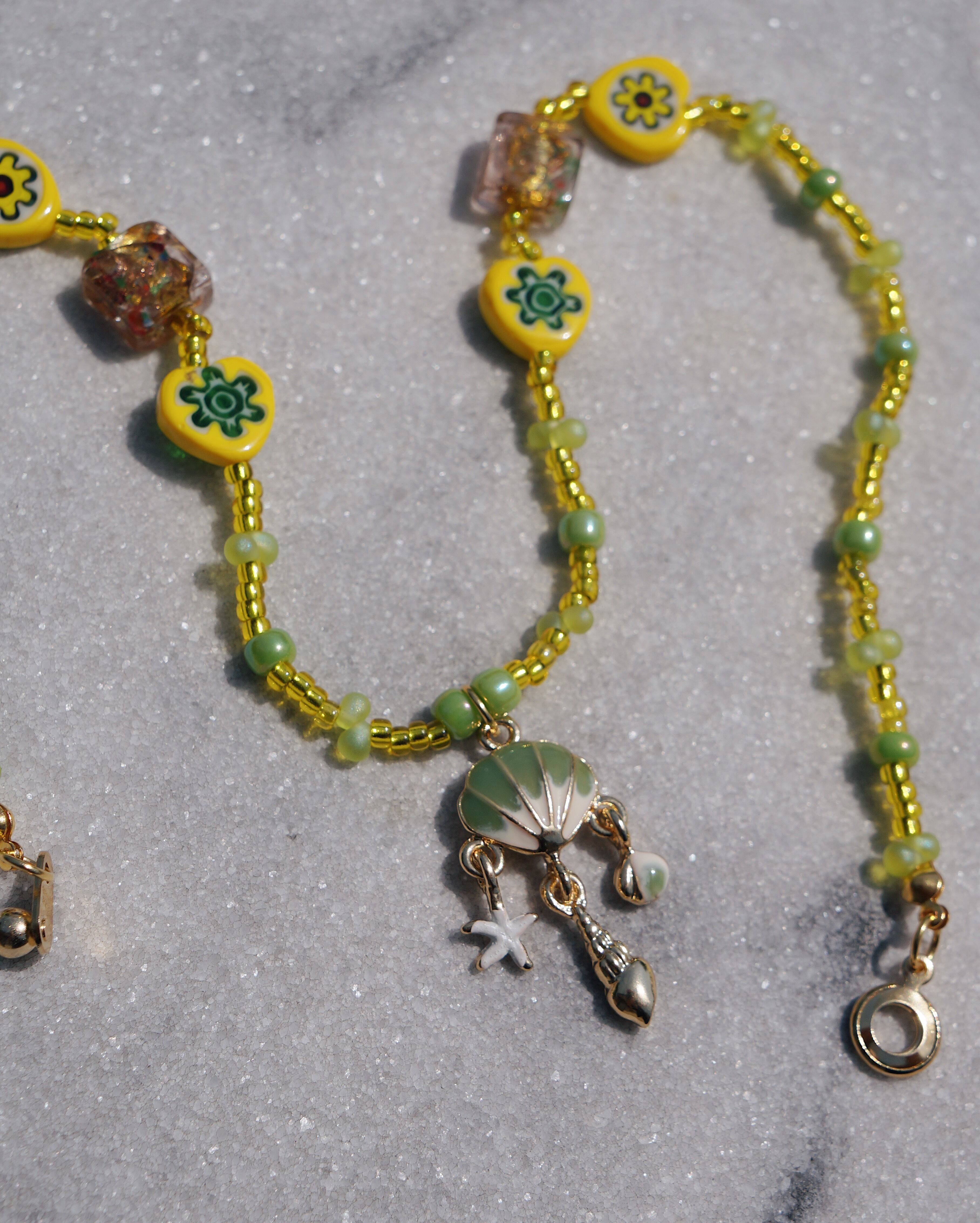 黄色と黄緑のカラーコンビネーションが夏らしいネックレスです。ゆらゆら揺れる貝のチャームとガラスのビーズでユニークさを出し、JBCGらしい一点にデザインしました。