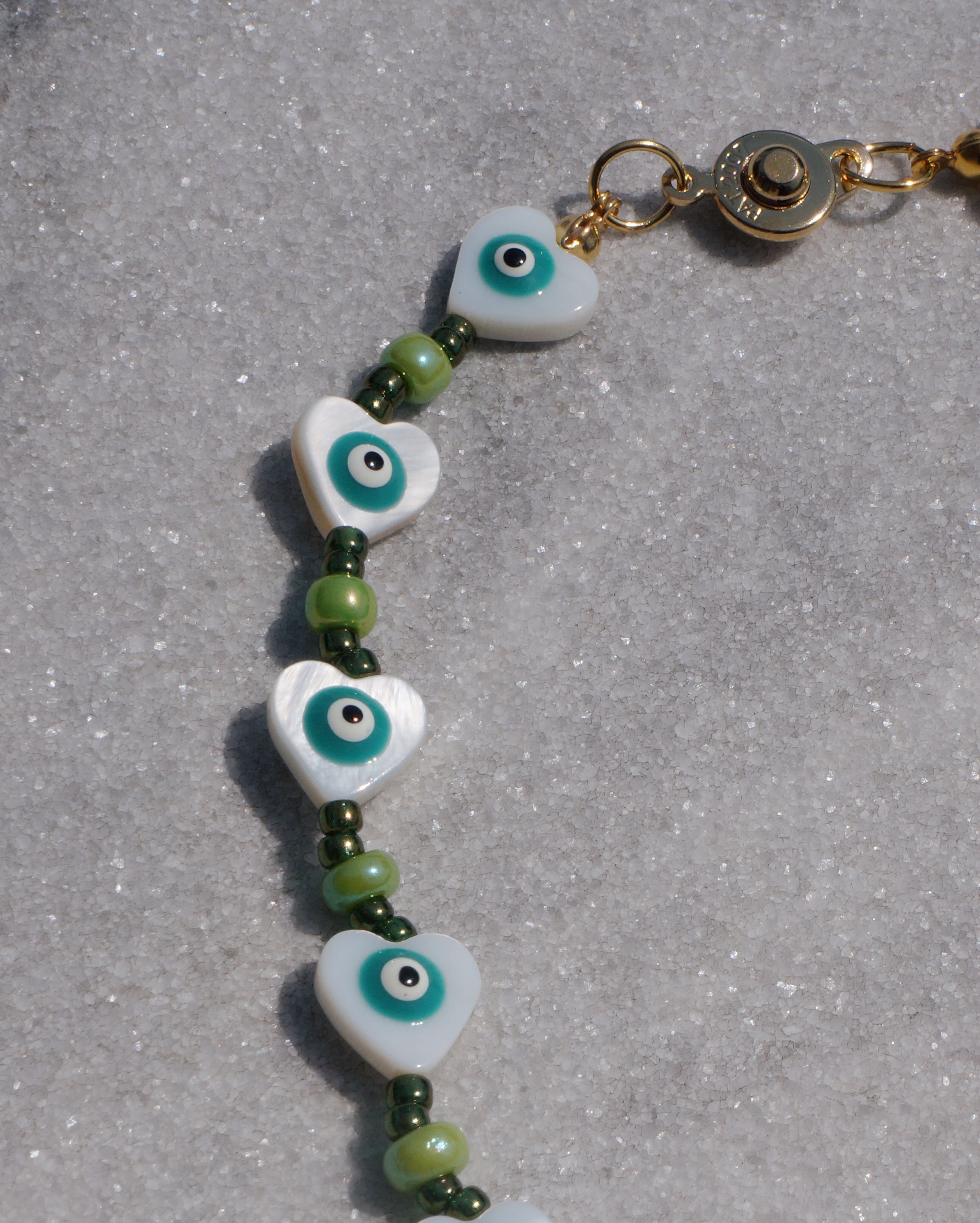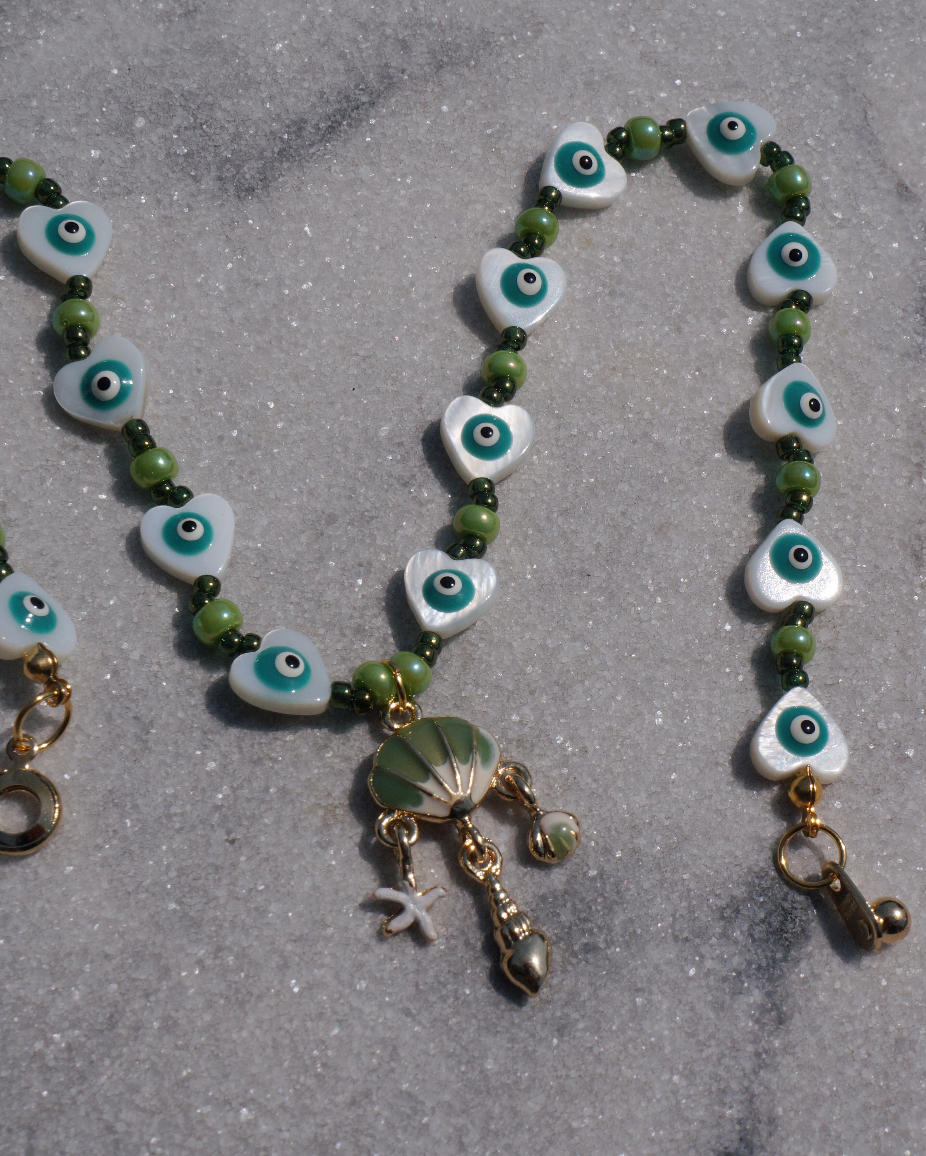 トルコのお守り”ナザールボンジュ”のデザインのビーズが印象的なネックレスです。ユニークなデザインでありながら、全体的な色味を緑で統一し、意外とどのようなお洋服にも合わせやすい一点です。