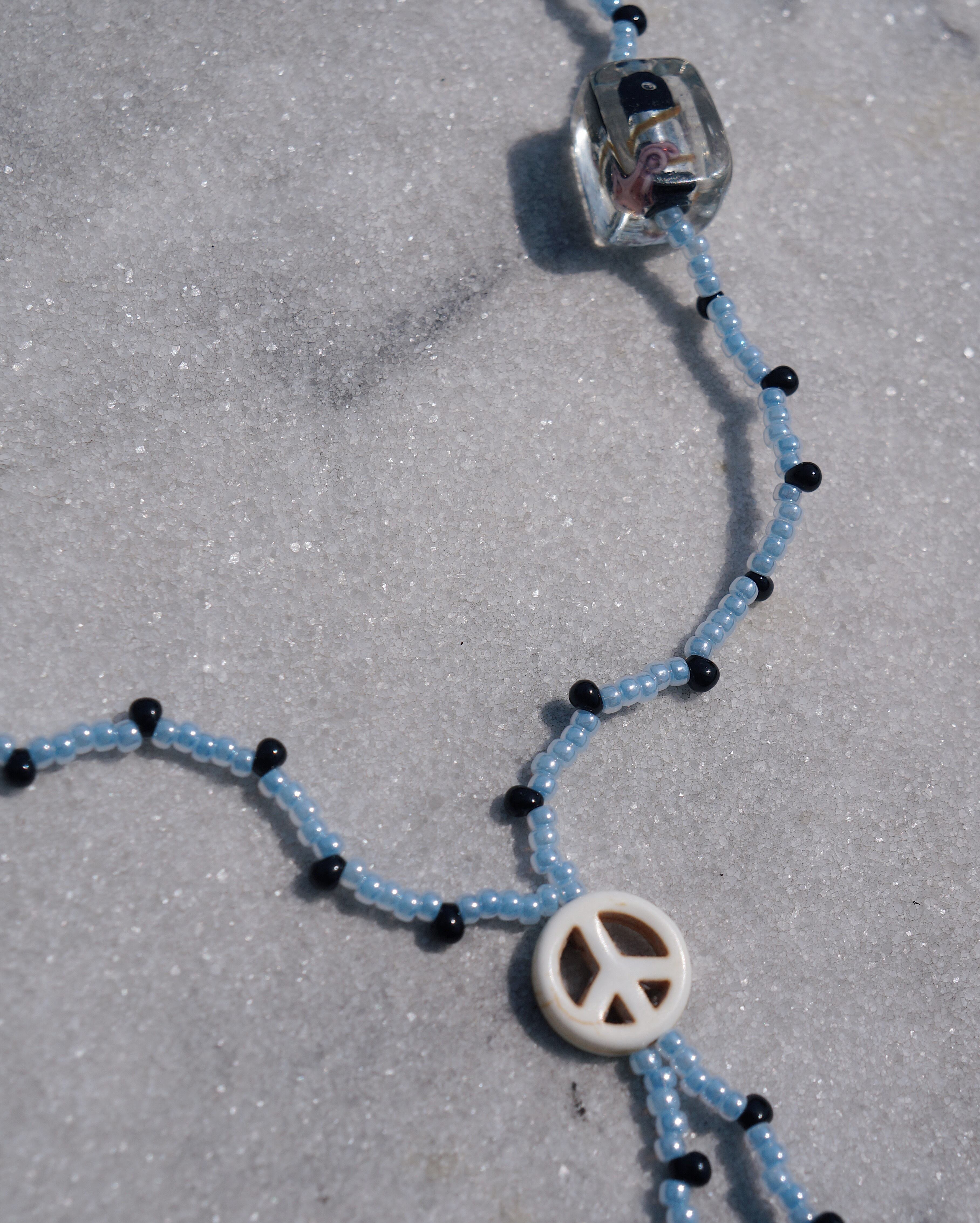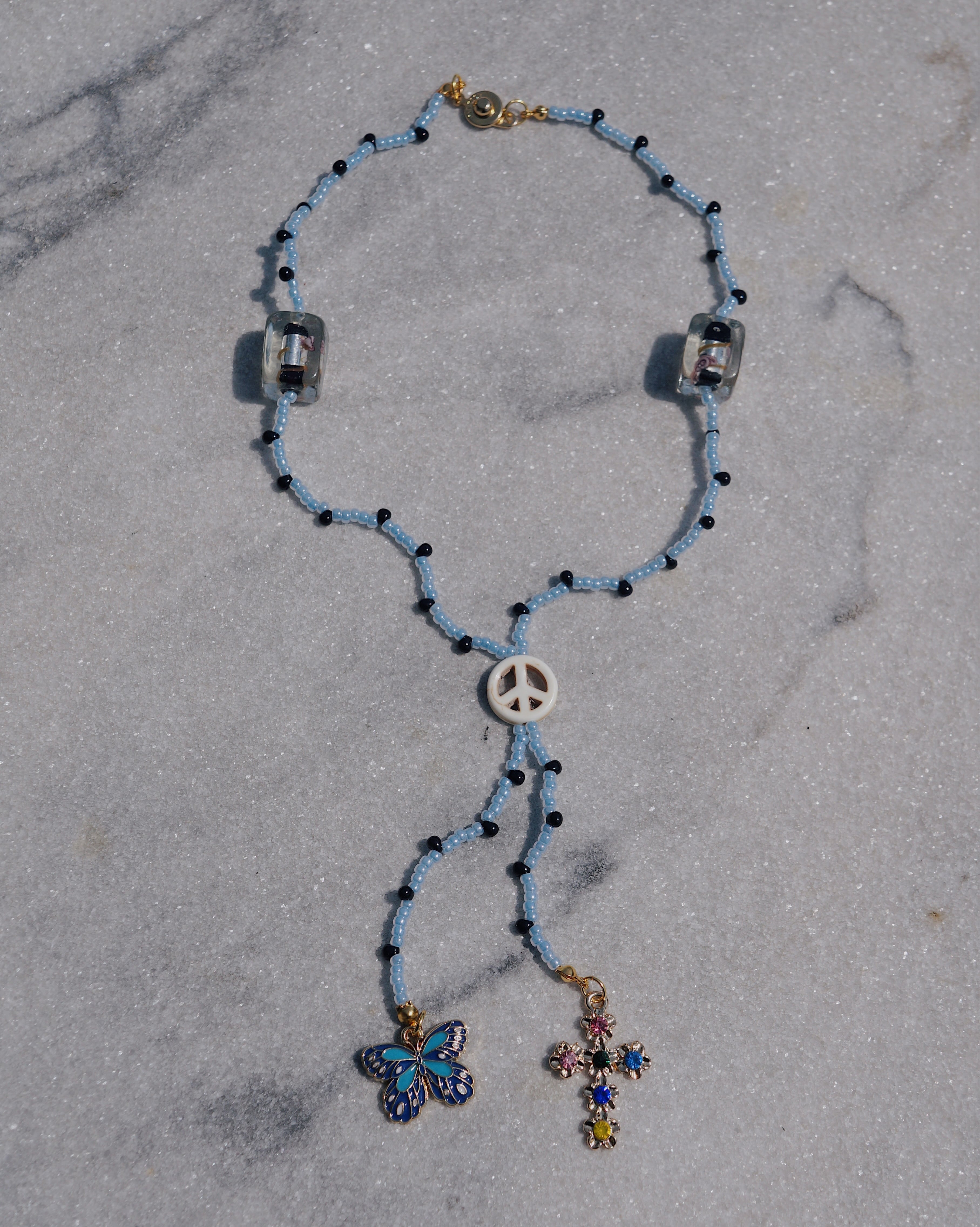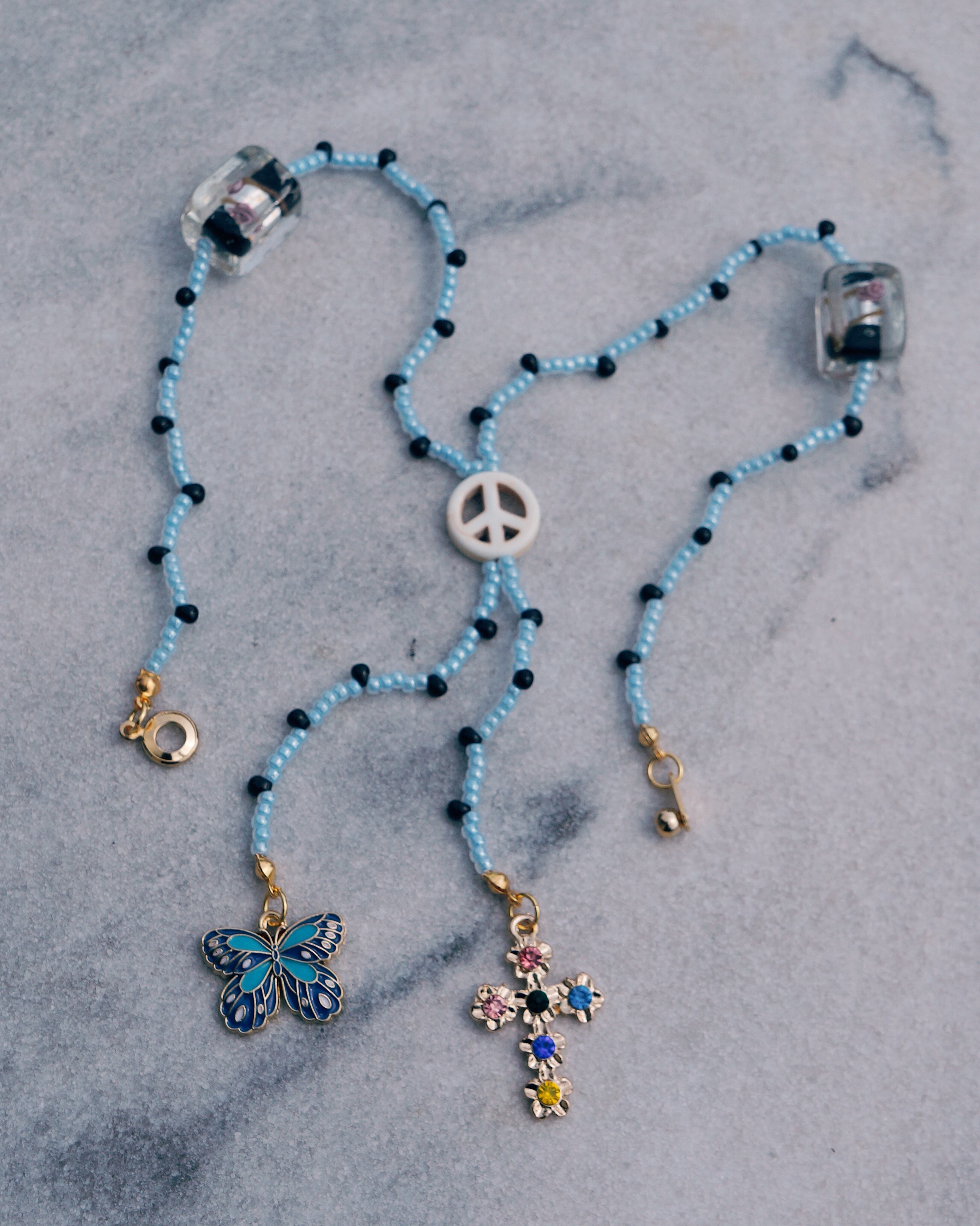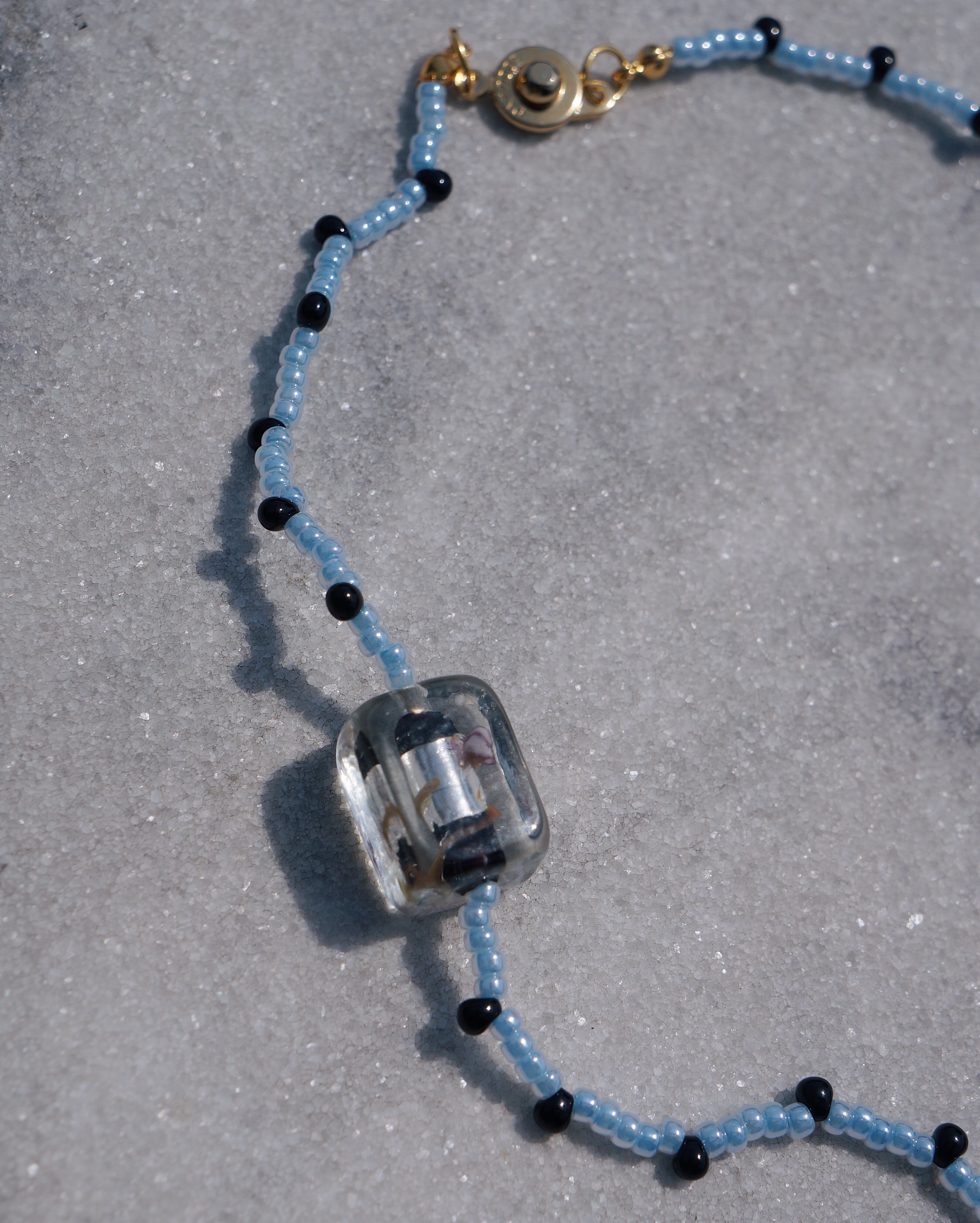 垂れ下がるデザインが素敵なネックレスです。カラーコンビネーションやパーツ一つ一つに拘りをもち、JBCGらしいユニークでポップなネックレスにデザインしました。コーディネートの主役になるような一点です。