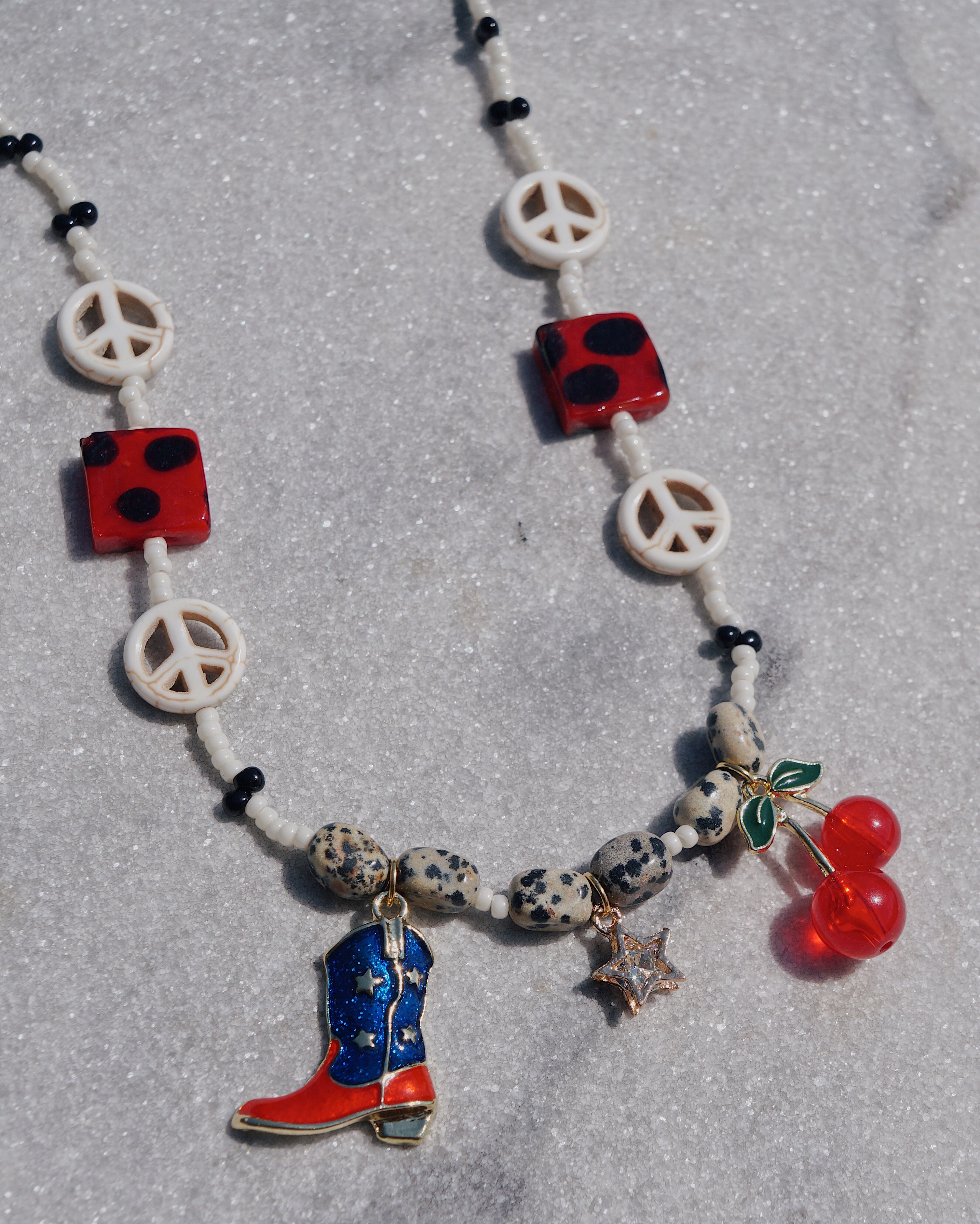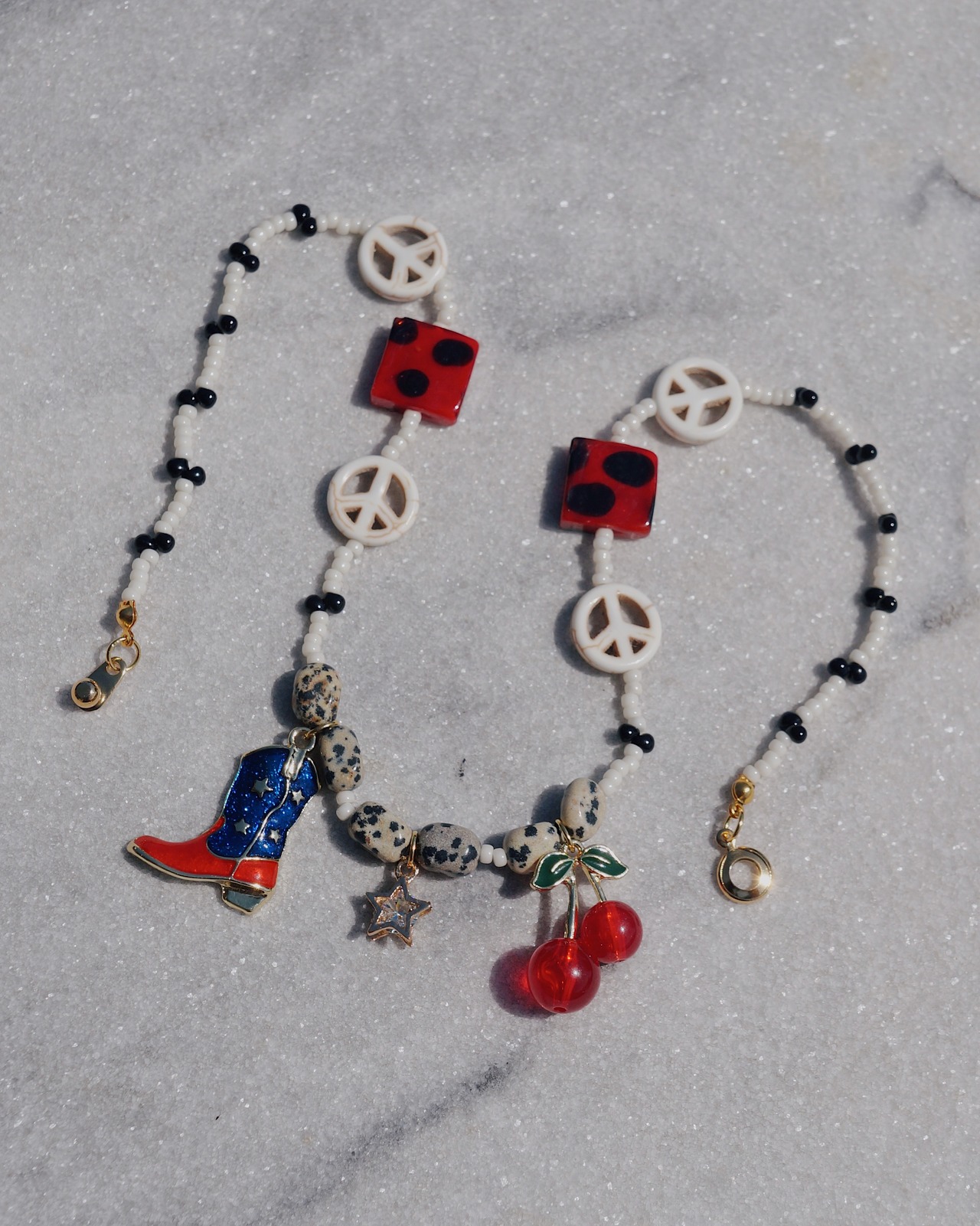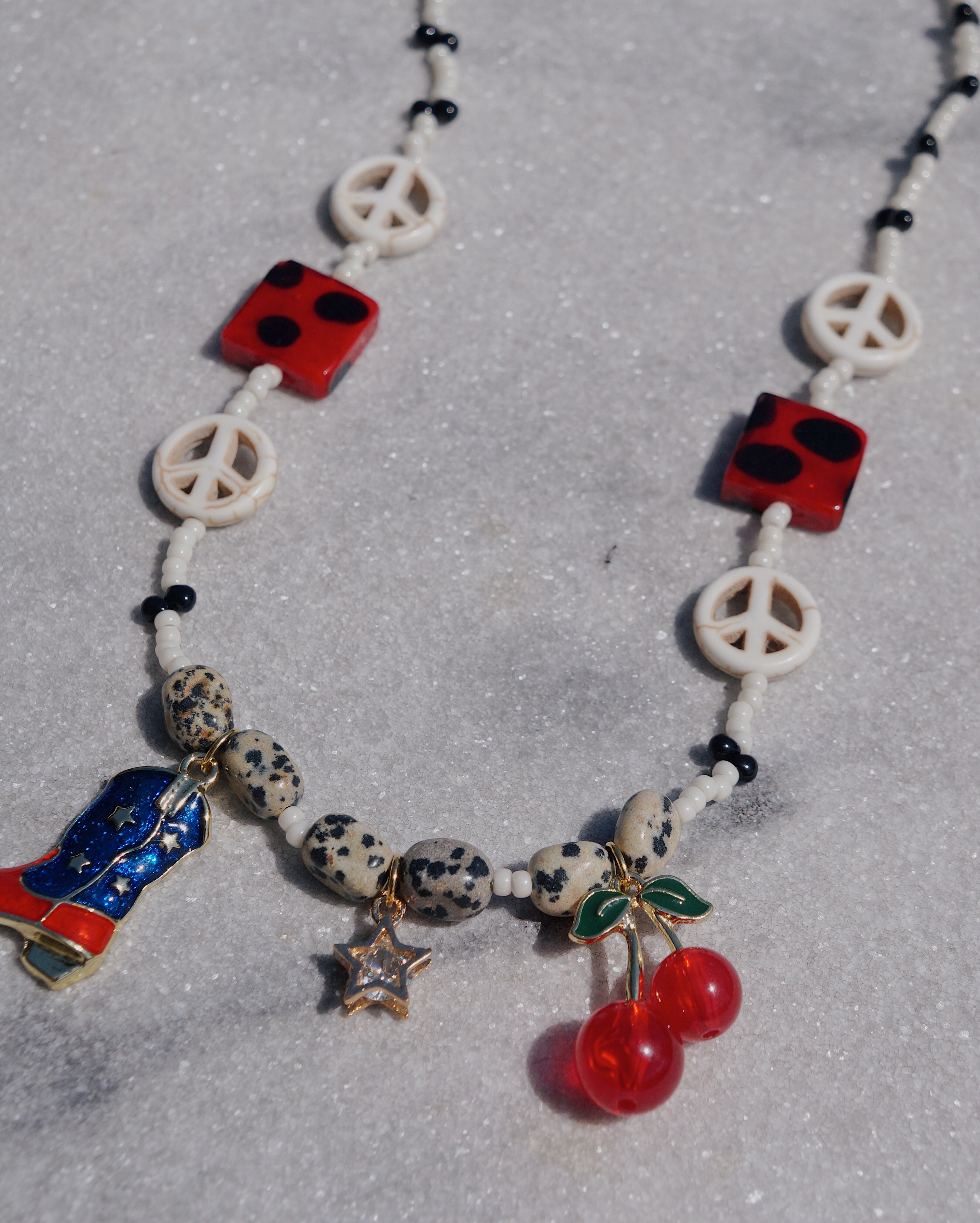 ポップでキュートなJBCGらしいネックレスです。3個のチャームが印象的でコーディネートを一気に華やかにしてくれるような一点です。