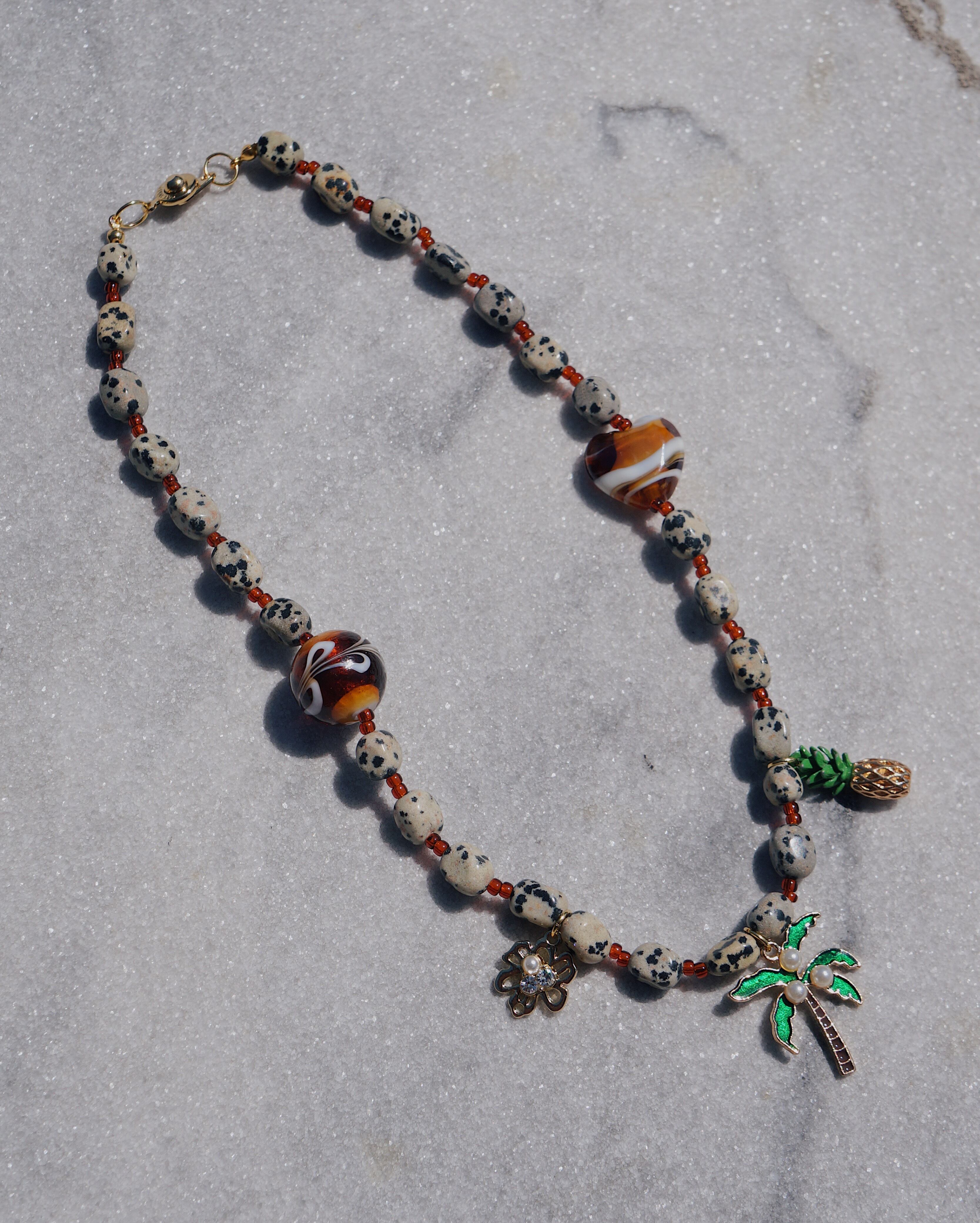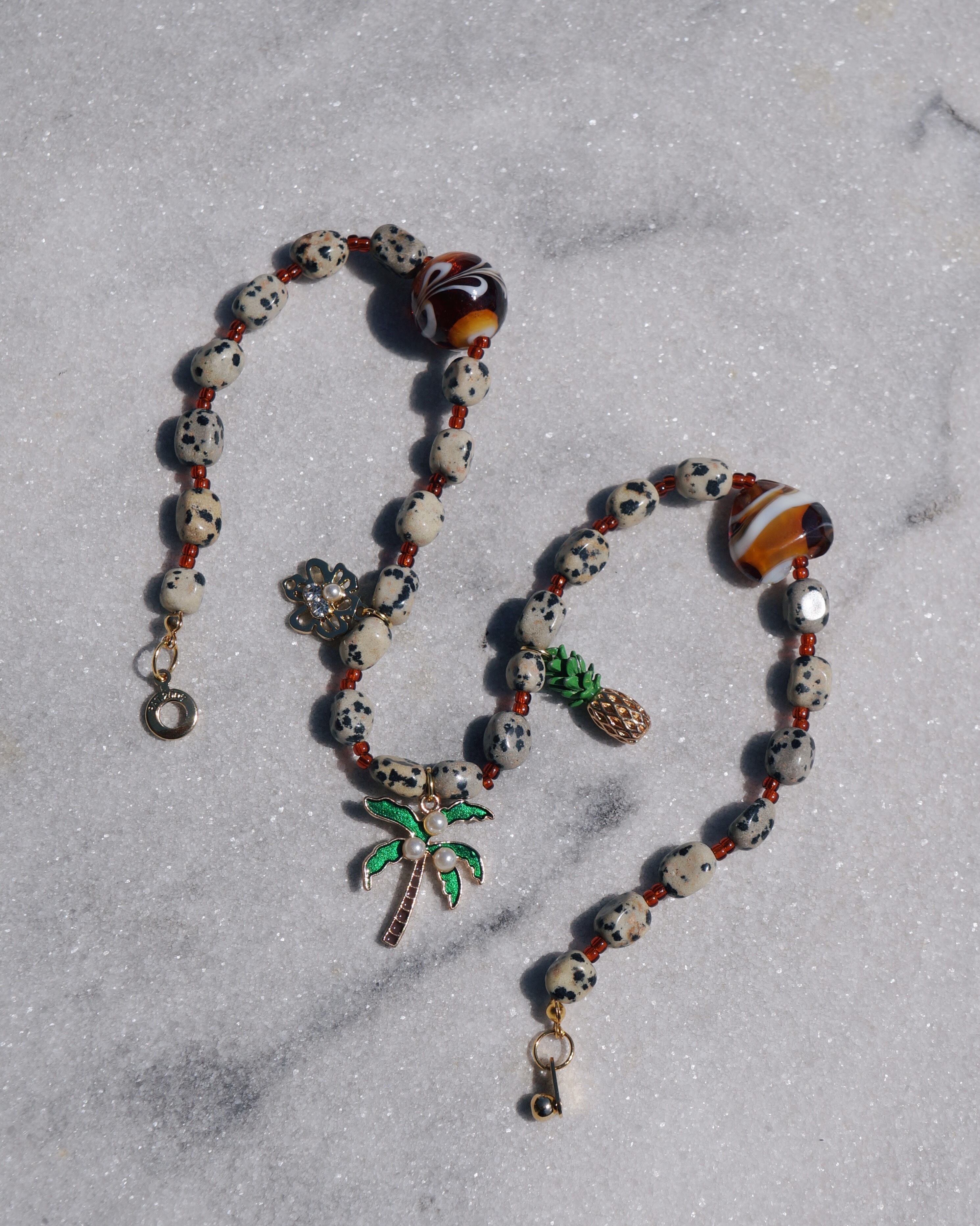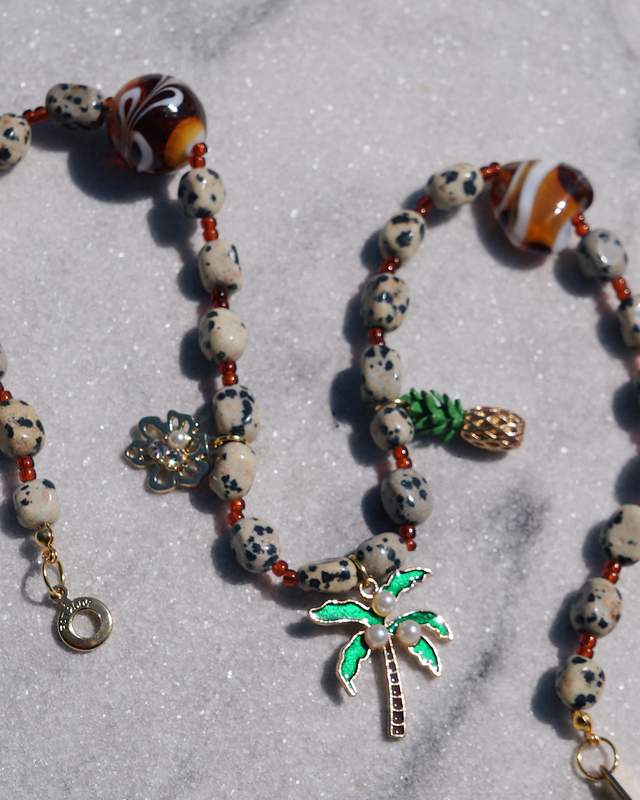 ポップでキュートなJBCGらしいネックレスです。3個のチャームが印象的でコーディネートを一気に華やかにしてくれるような一点です。ダルメシアンジャスパー(天然石)のビーズを使用しています。