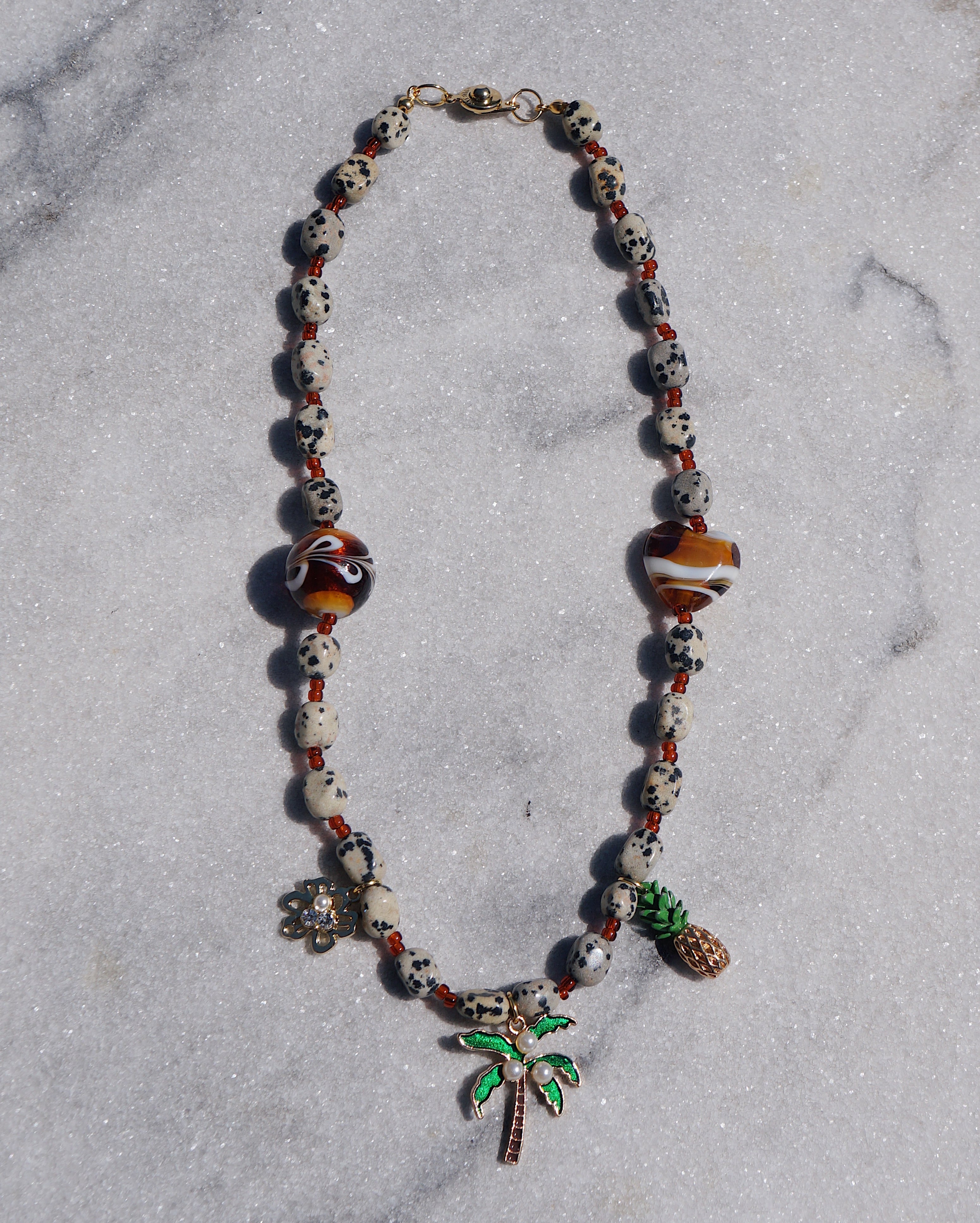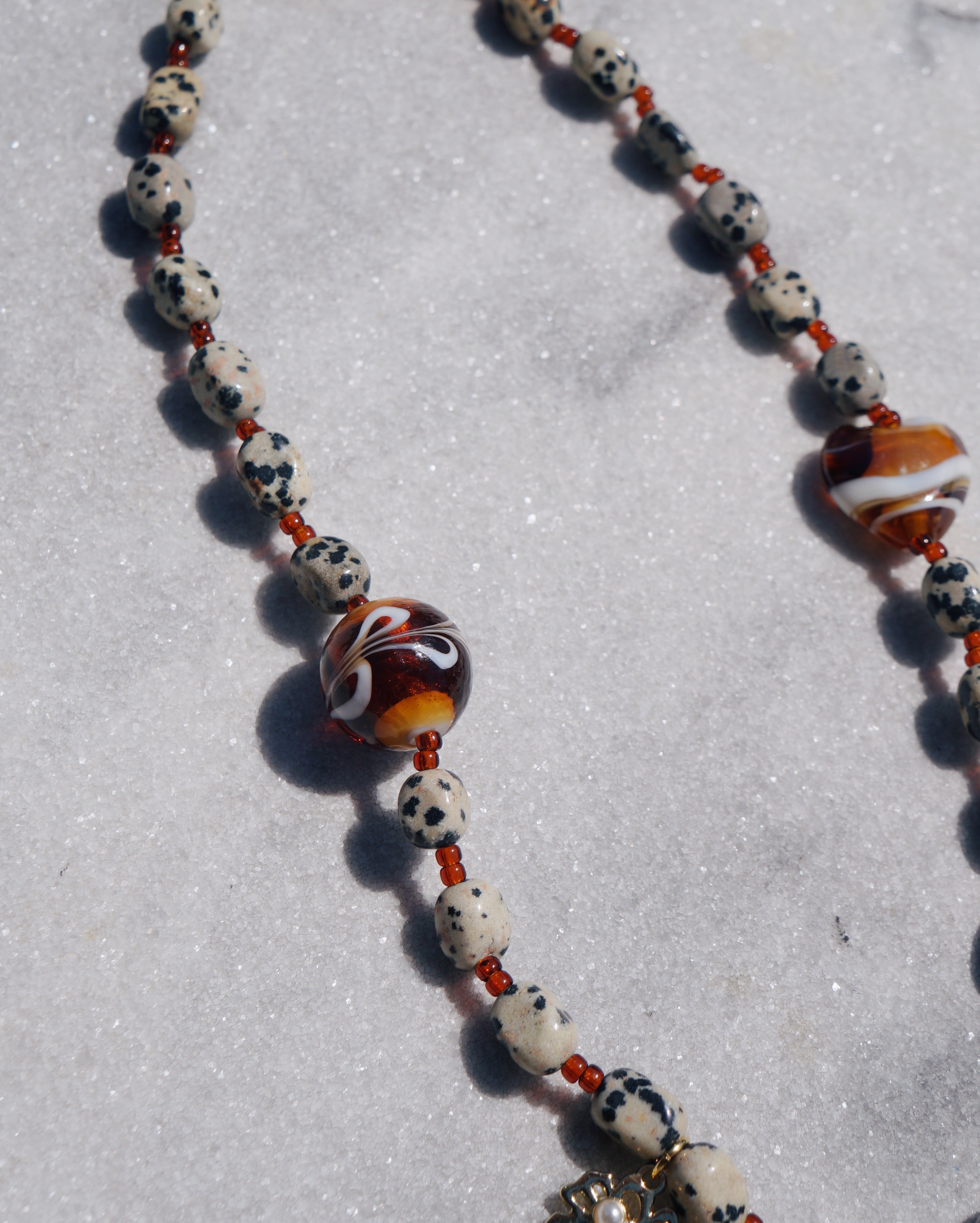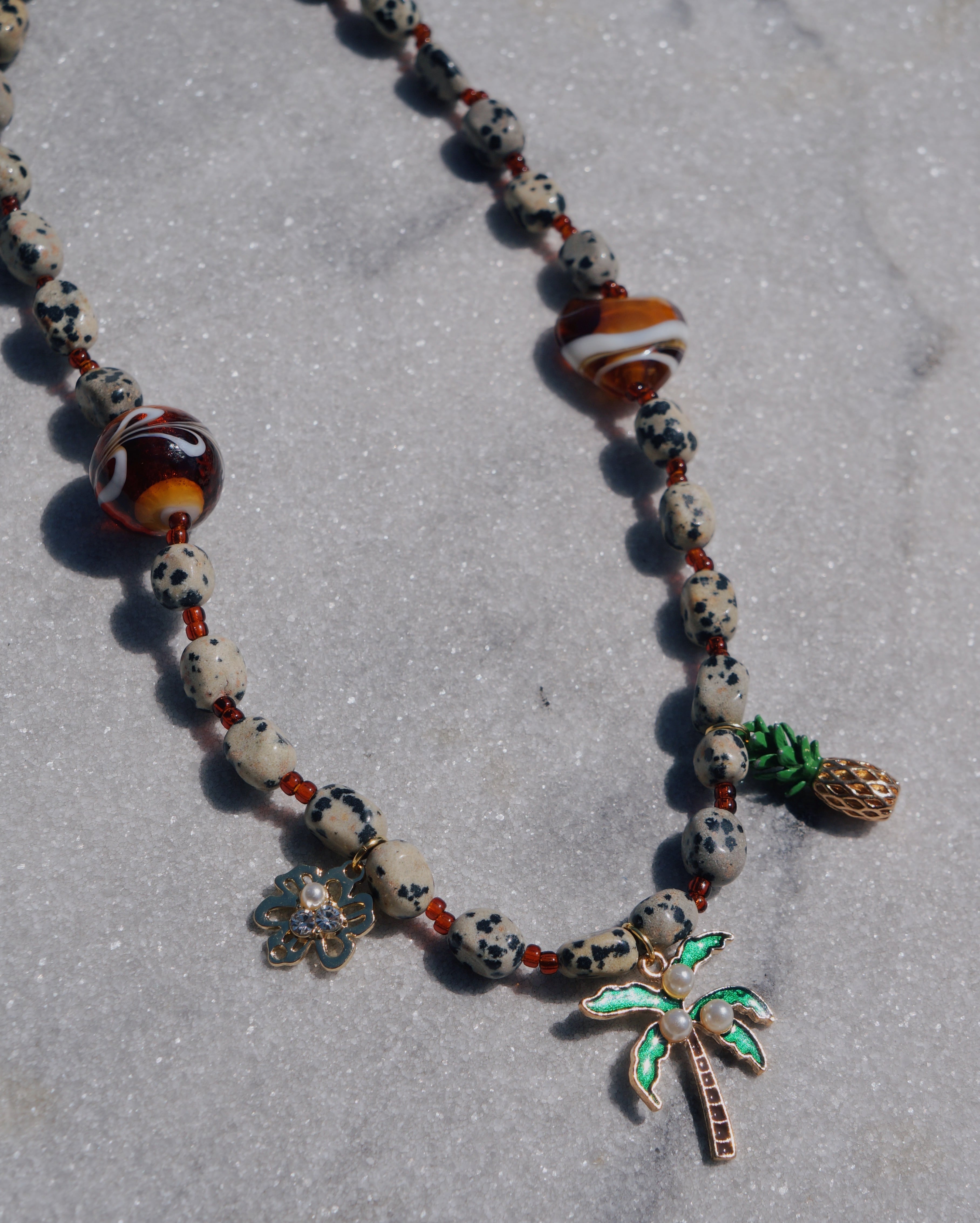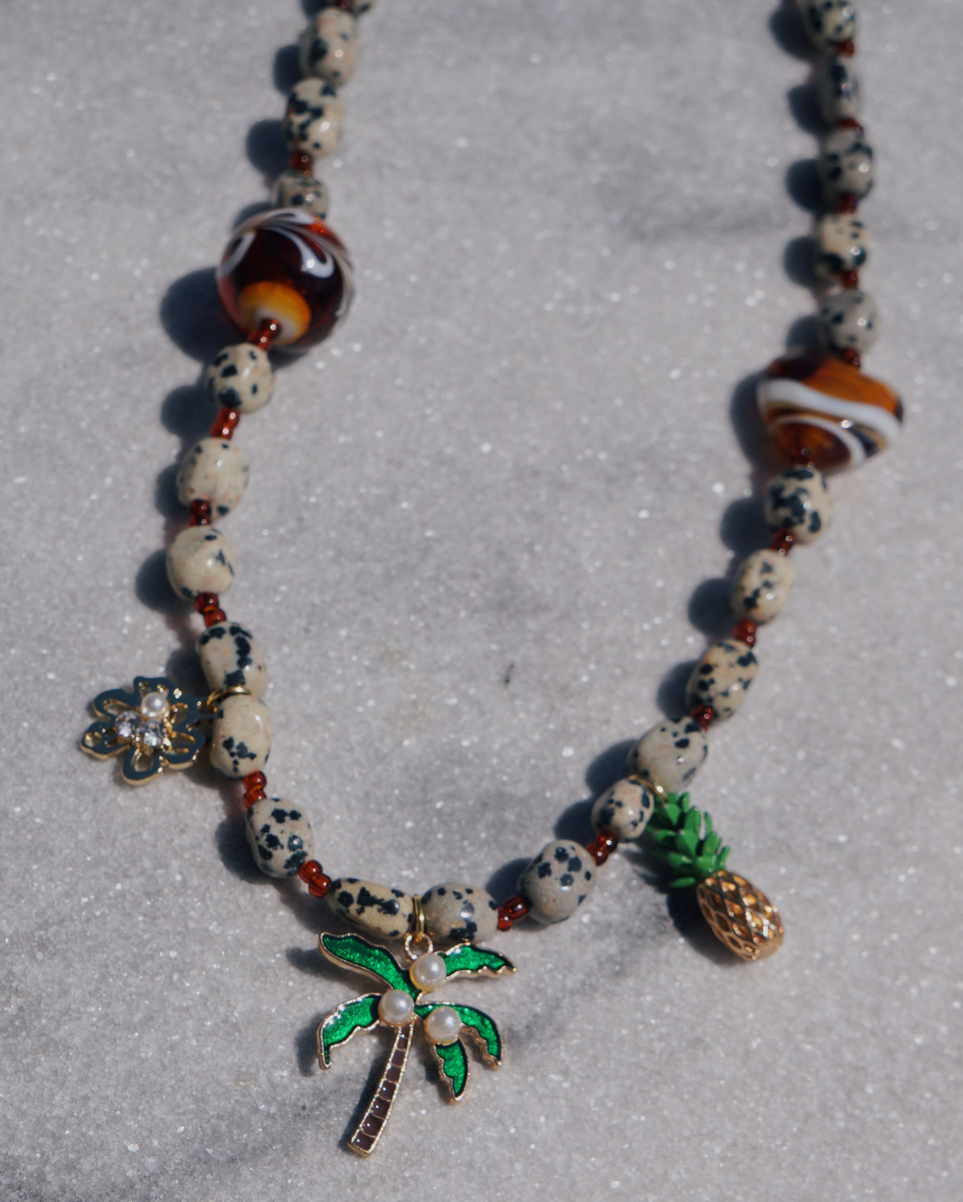 ポップでキュートなJBCGらしいネックレスです。3個のチャームが印象的でコーディネートを一気に華やかにしてくれるような一点です。ダルメシアンジャスパー(天然石)のビーズを使用しています。