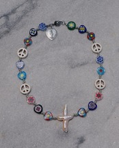ピースマークとミルフィオリのビーズが華やかで美しいネックレスです。中央には希少なクロス型の淡水パールをもってきて、あなたのお守りのようなネックレスになってほしいという願いを込めました。夏のコーディネートにピッタリあう一点です。