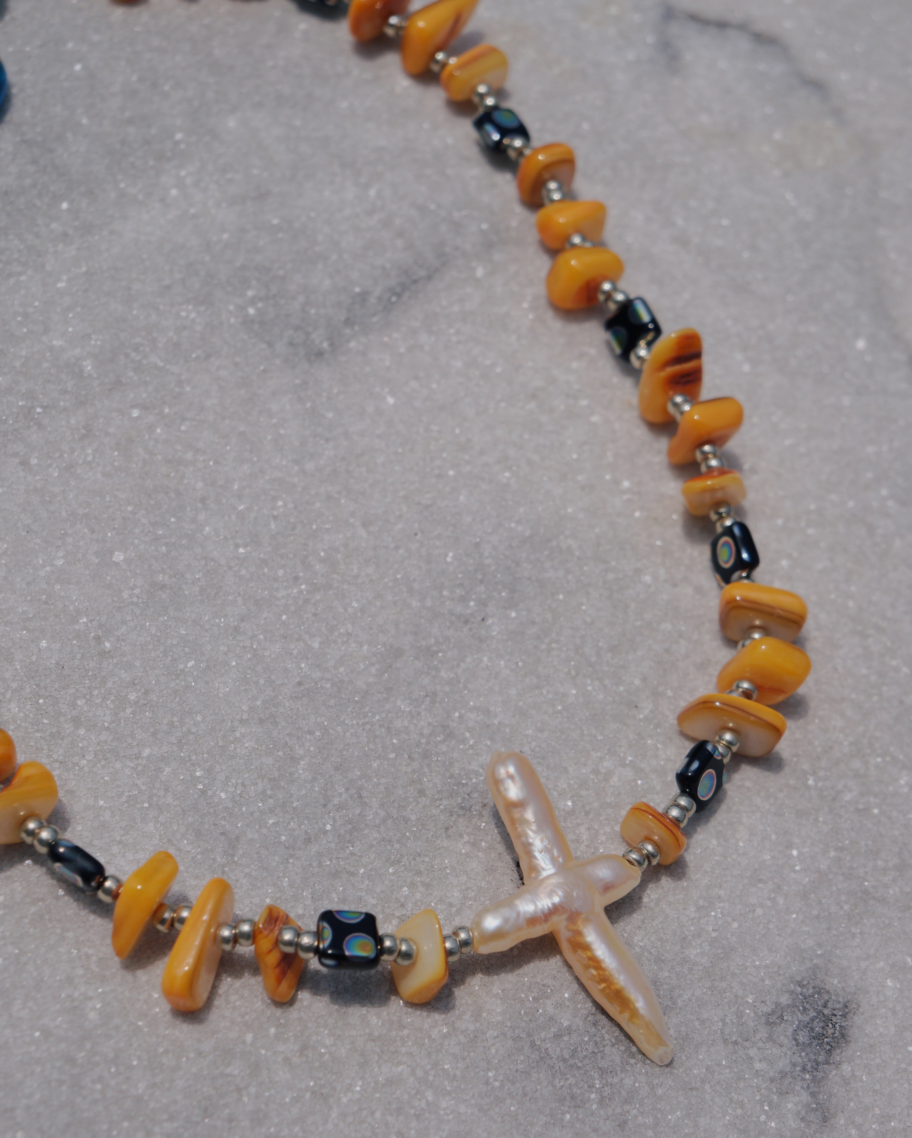 オレンジのシェルビーズとユニークな柄のチェコビーズが美しいネックレスです。中央には希少なクロス型の淡水パールをもってきて、あなたのお守りのようなネックレスになってほしいという願いを込めました。夏のコーディネートにピッタリあう一点です。