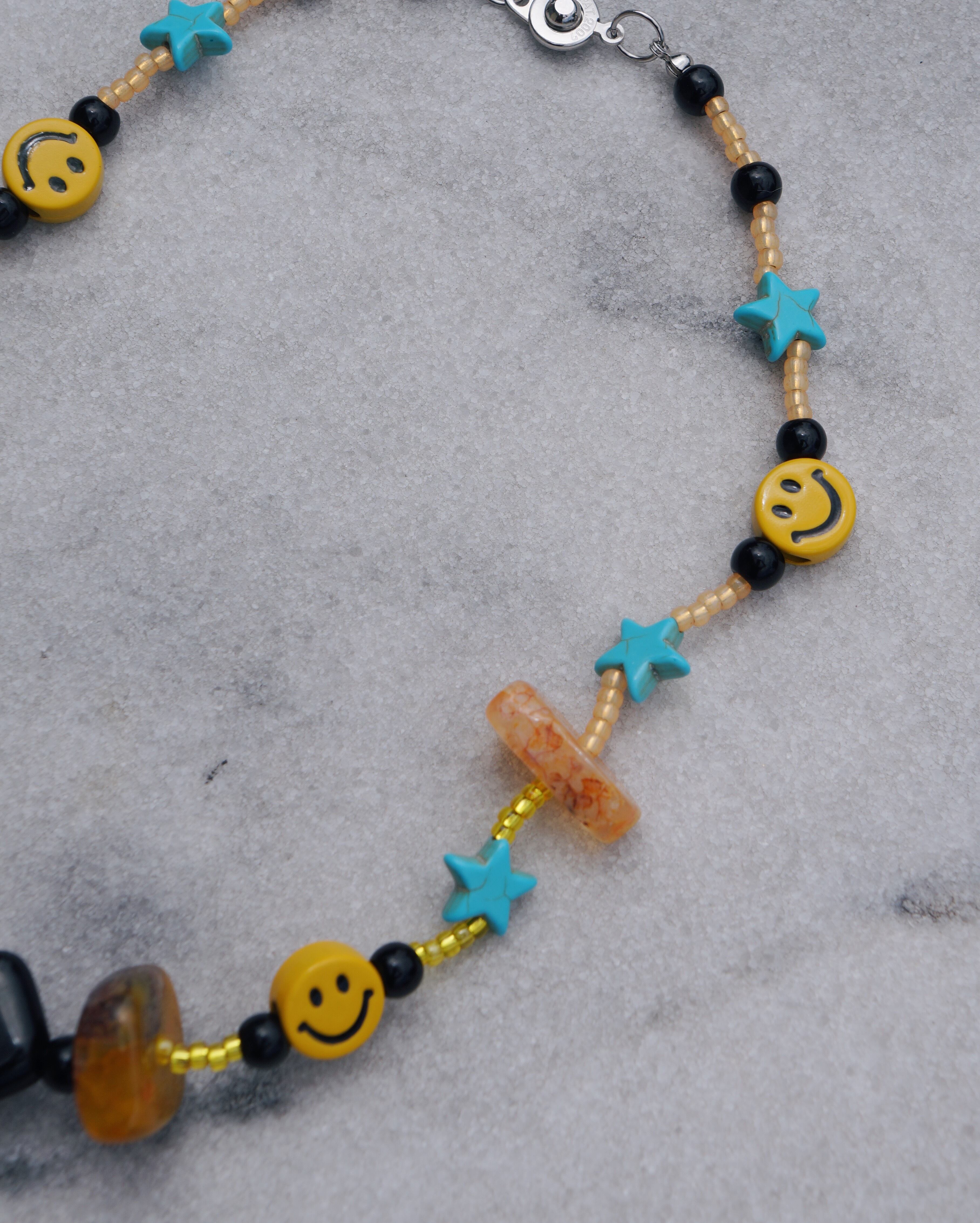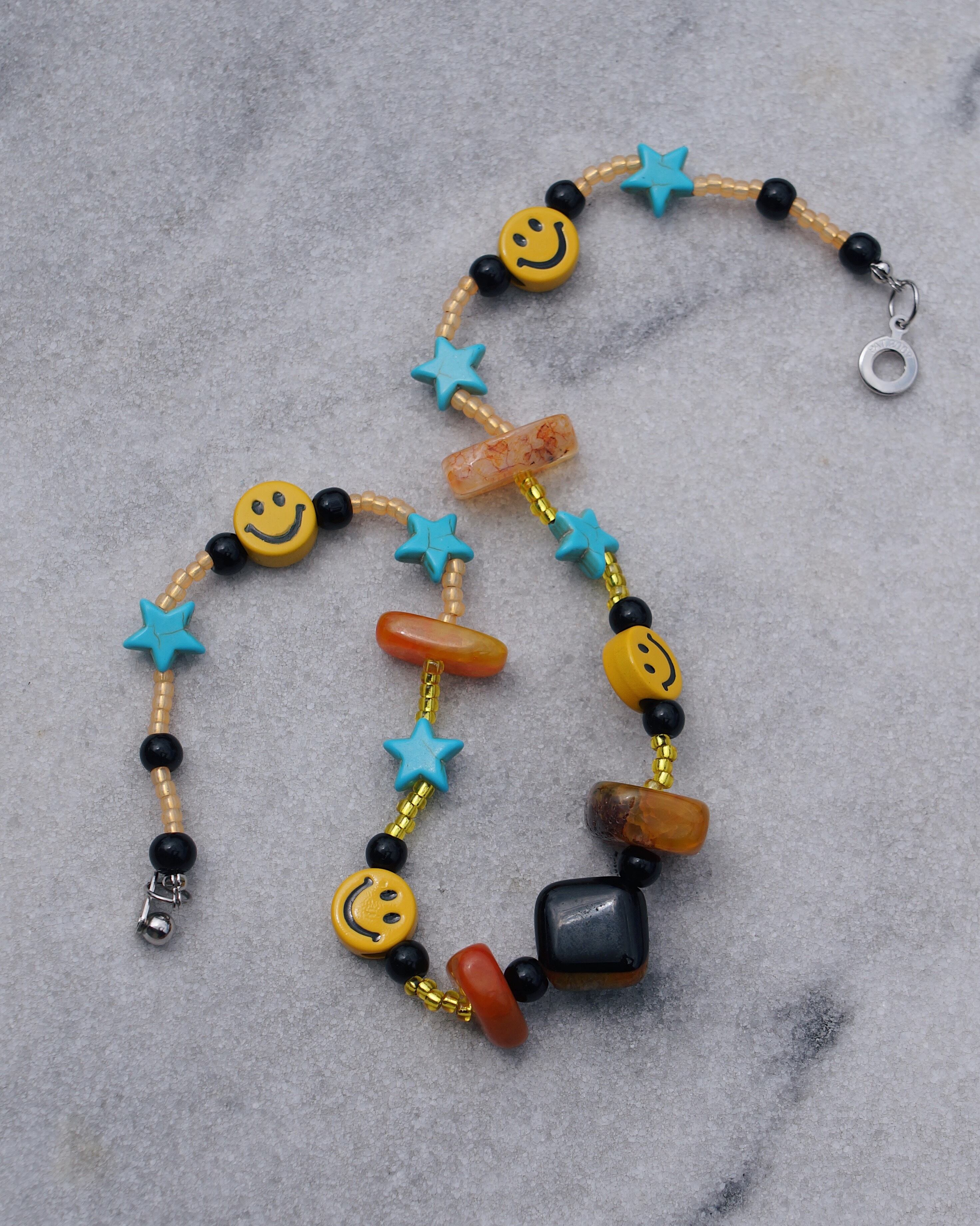 ニコちゃんやターコイズの星ビーズ、そして天然石のオレンジアゲートを使った見ているだけでHAPPYになれそうなキュートなネックレスです。白Tやタンクトップに映えること間違いなしの一点です。