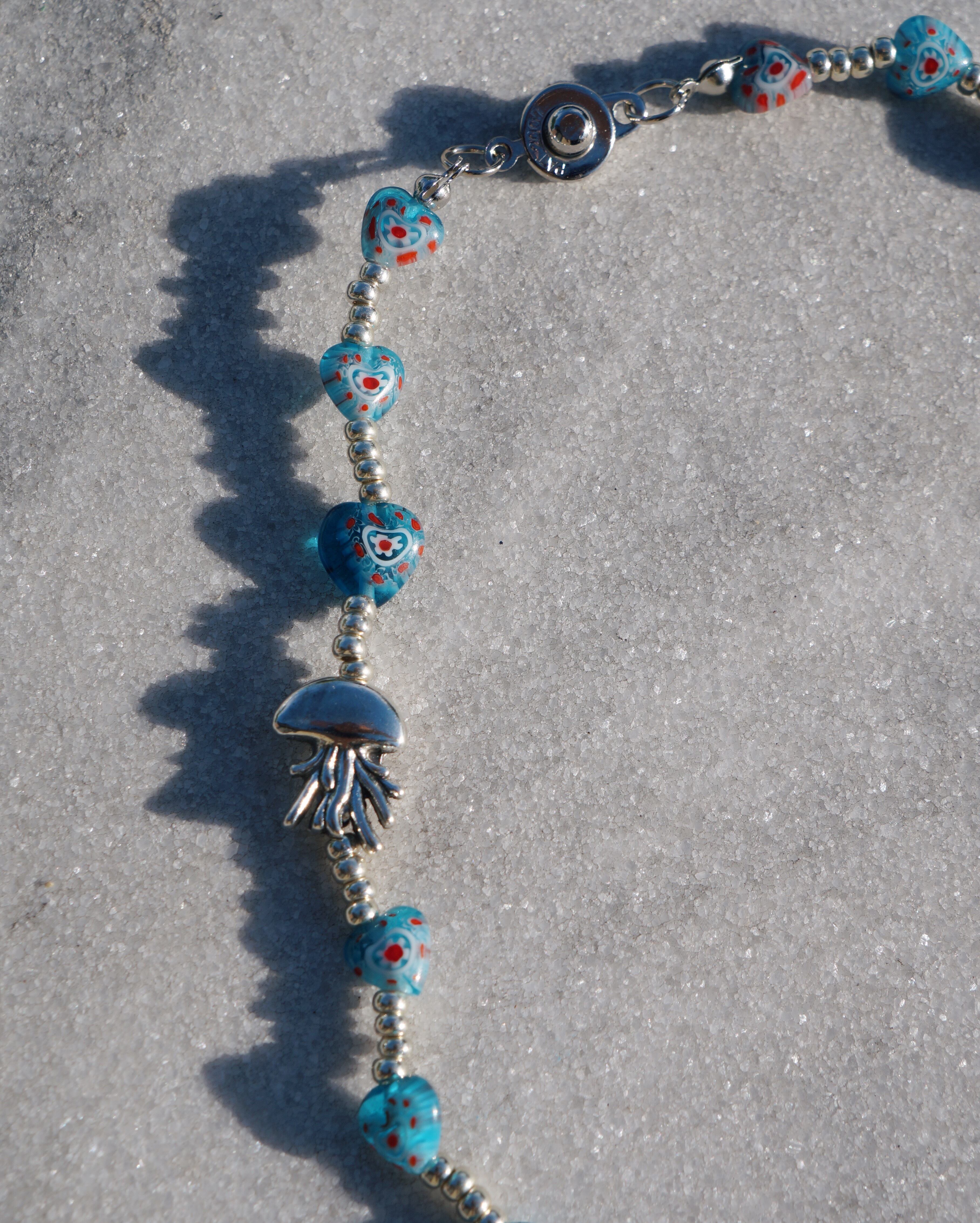クラゲのビーズとミルフィオリのガラスビーズが少し不思議な世界観でその絶妙さがとっても美しく可愛い一点です。十字架はイタリア製のパーツを使って今ます。スタイルに溶け込みやすいデザインでありながら他とは被らない素敵なネックレスです。