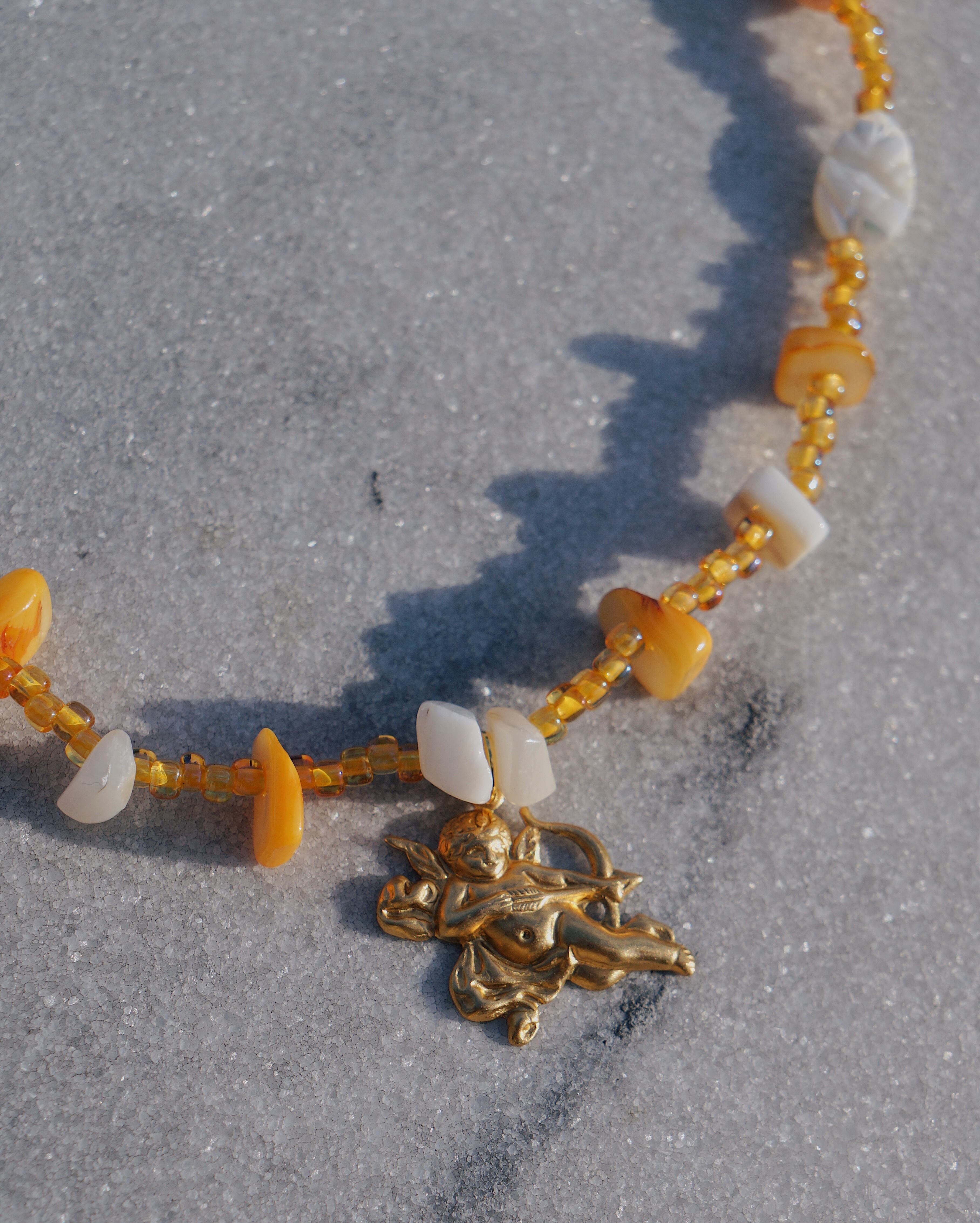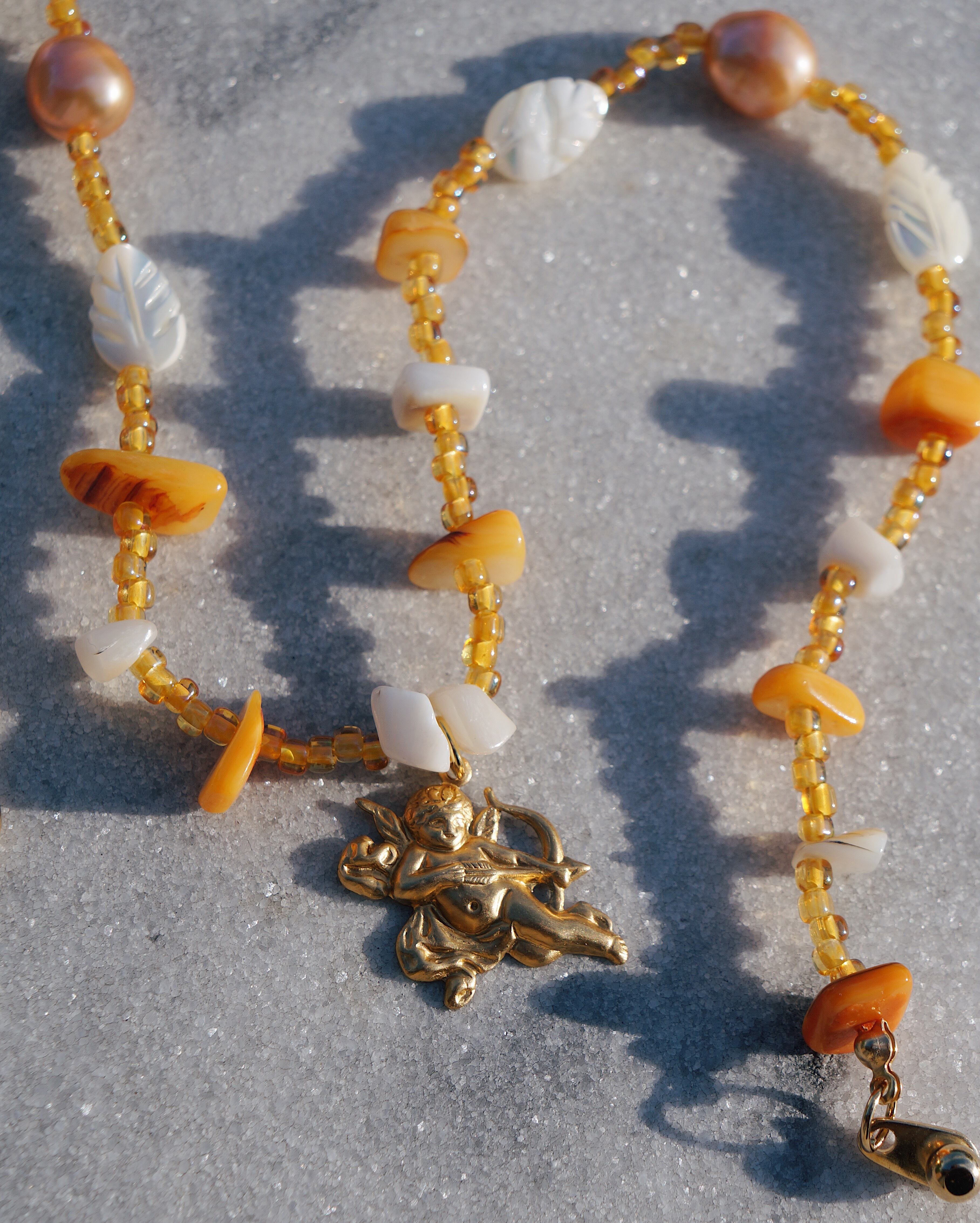 オレンジや白のシェルビーズや、シェルでできた葉っぱのビーズ、そして天使のチャームが美しく洗練された一点です。