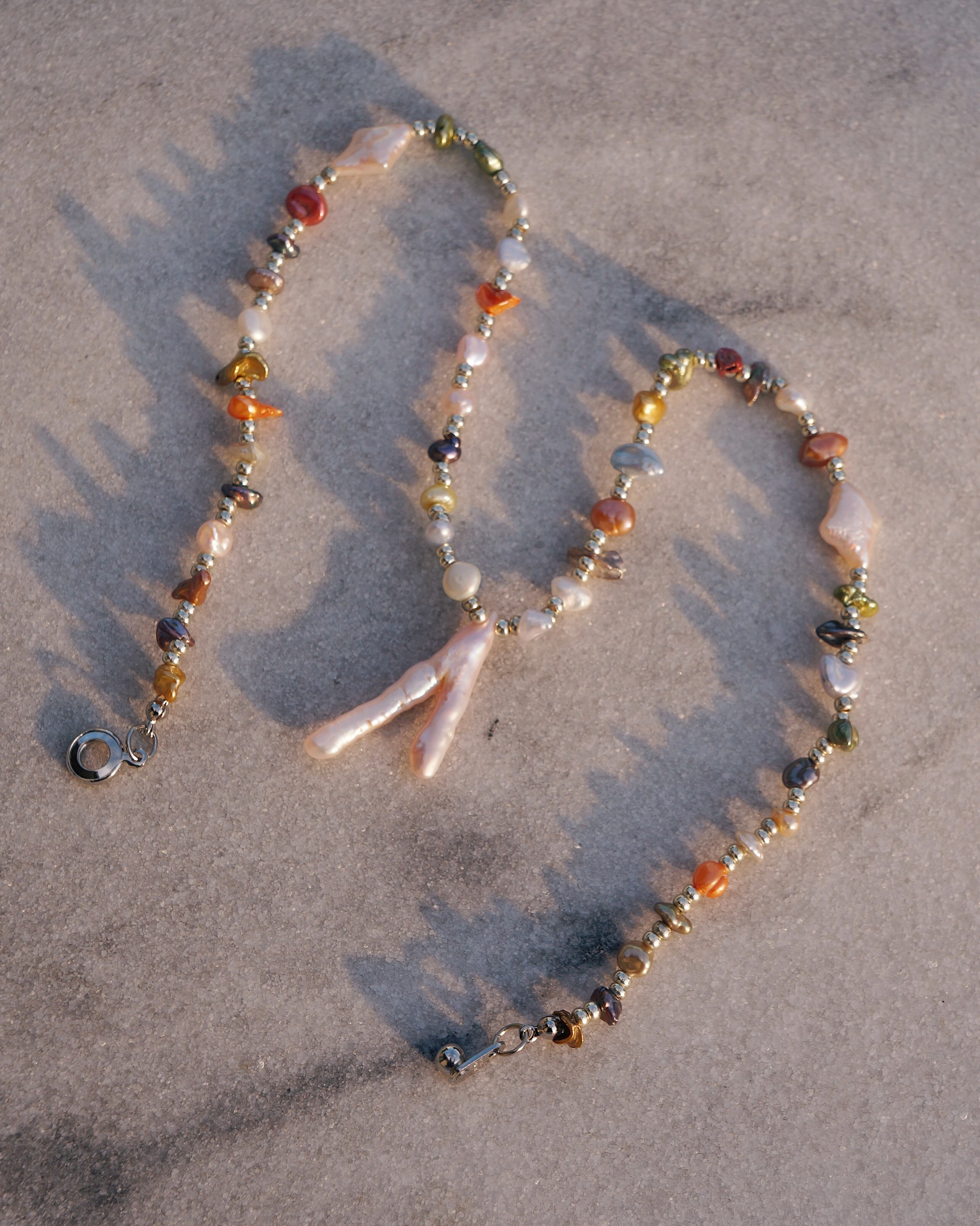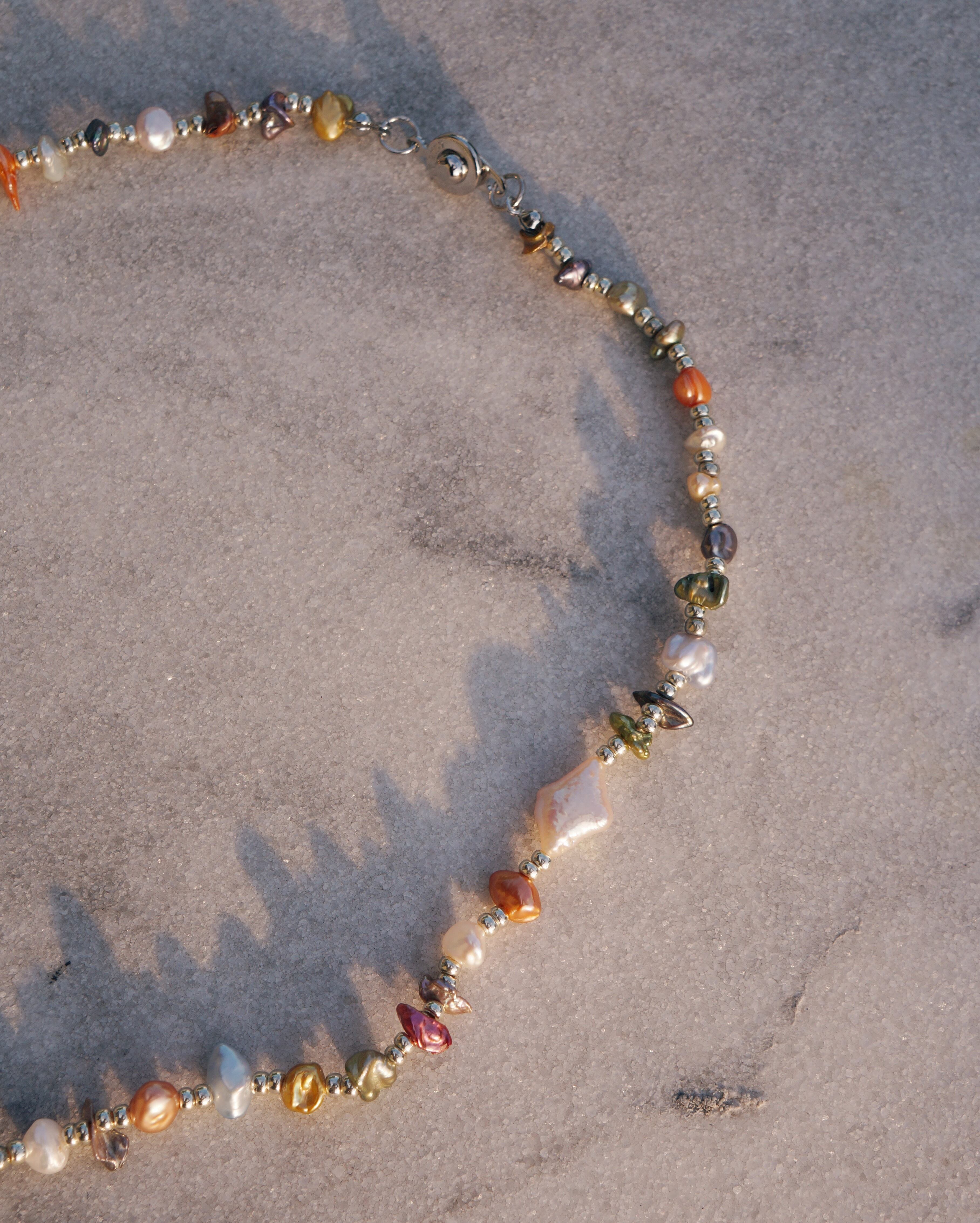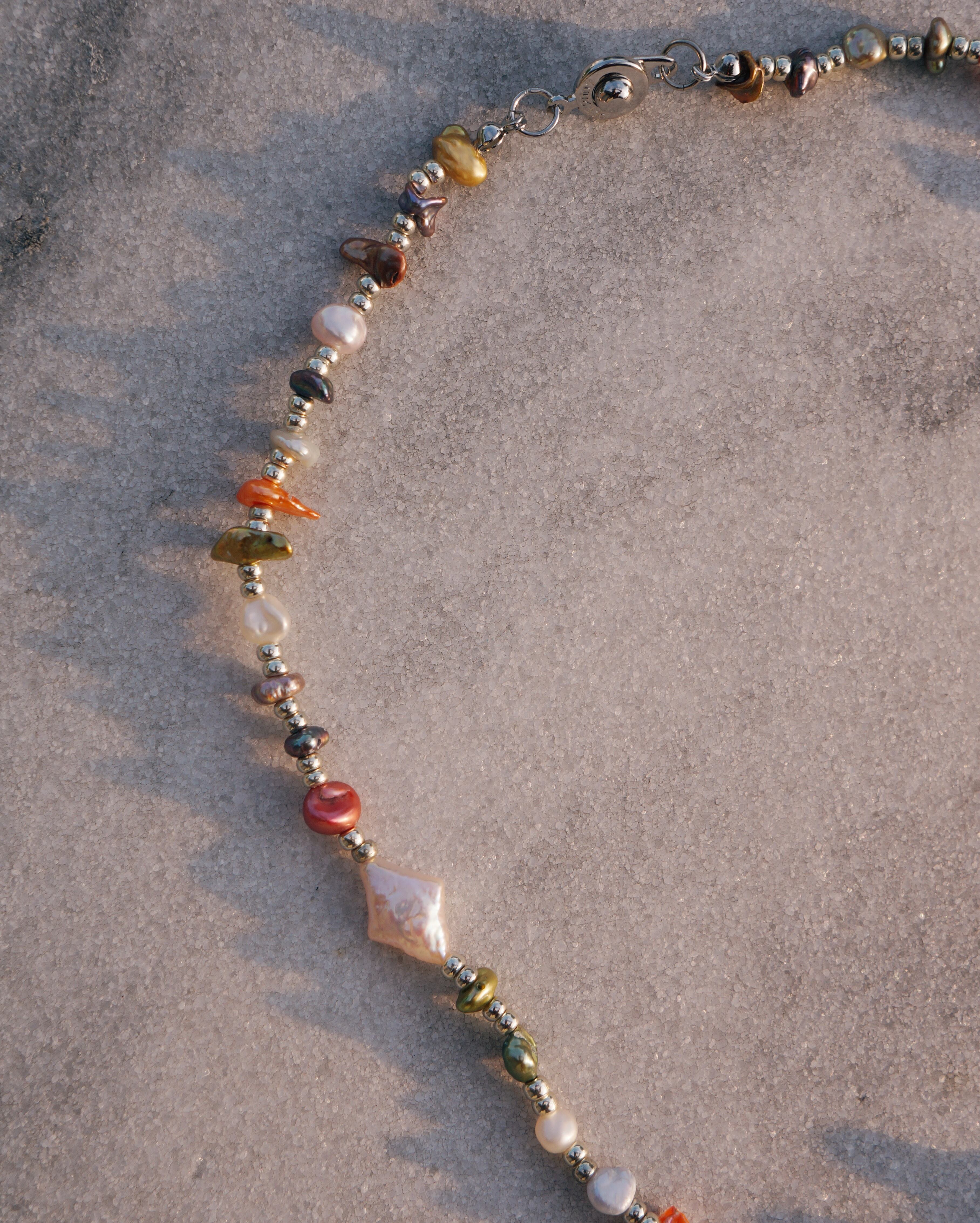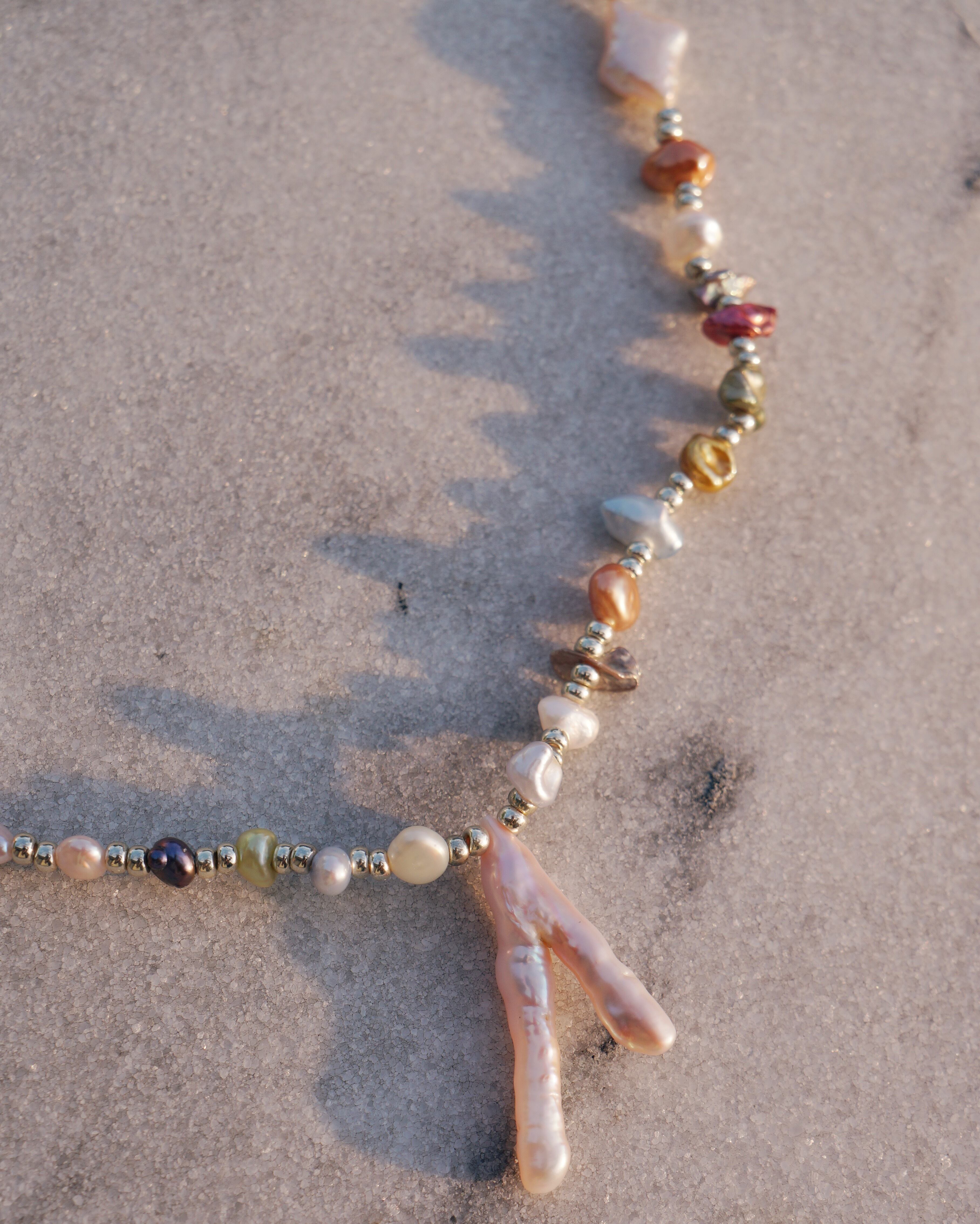 貴重な淡水枝パーツをデザインの中心に使った美しいネックレスです。様々な淡いカラーのケシパールがキュートでさりげなく入っている菱形のケシパールのビーズが絶妙で素敵な一点です。存在感がありながらどのようなスタイリングにも合わせやすいアイテムです。