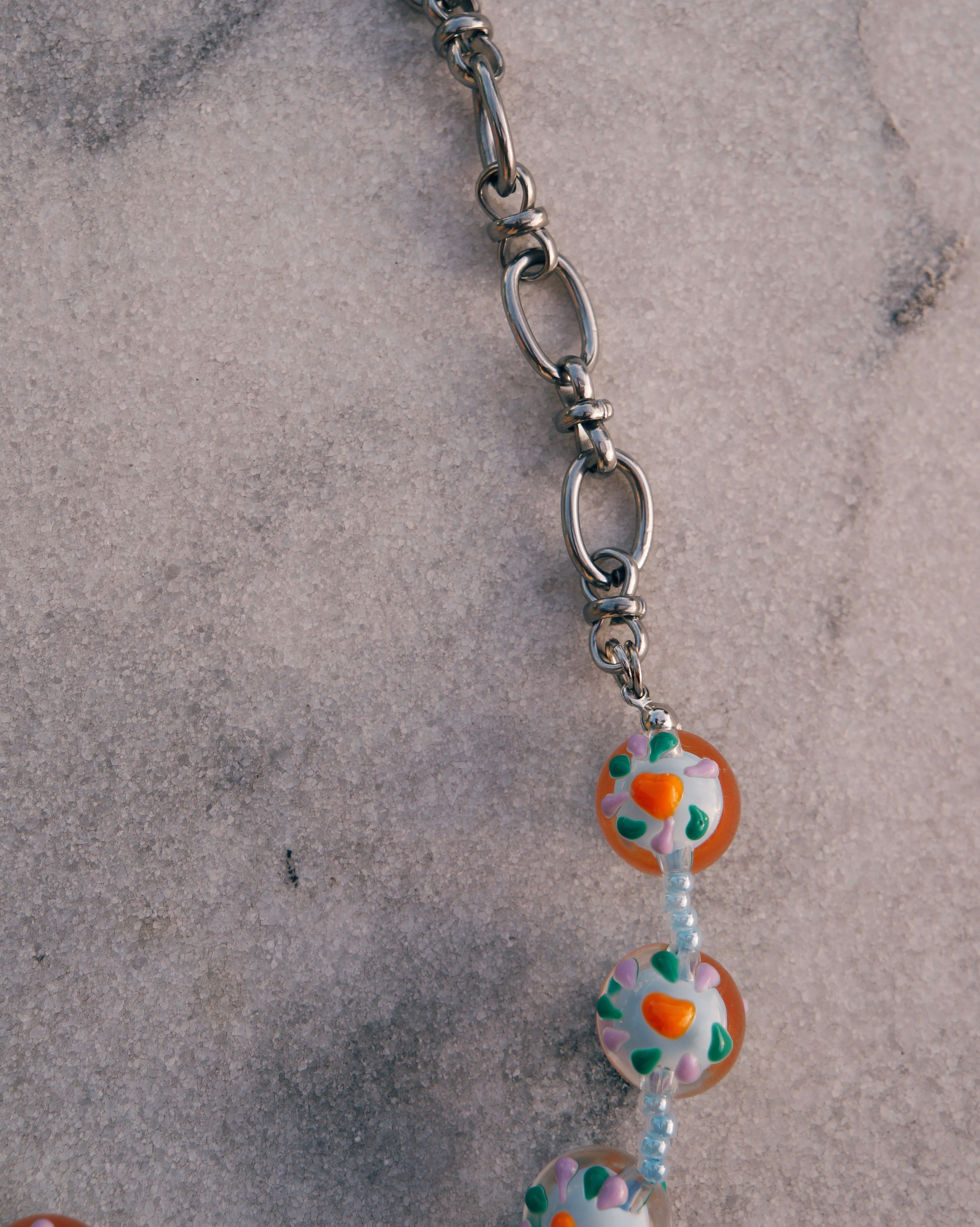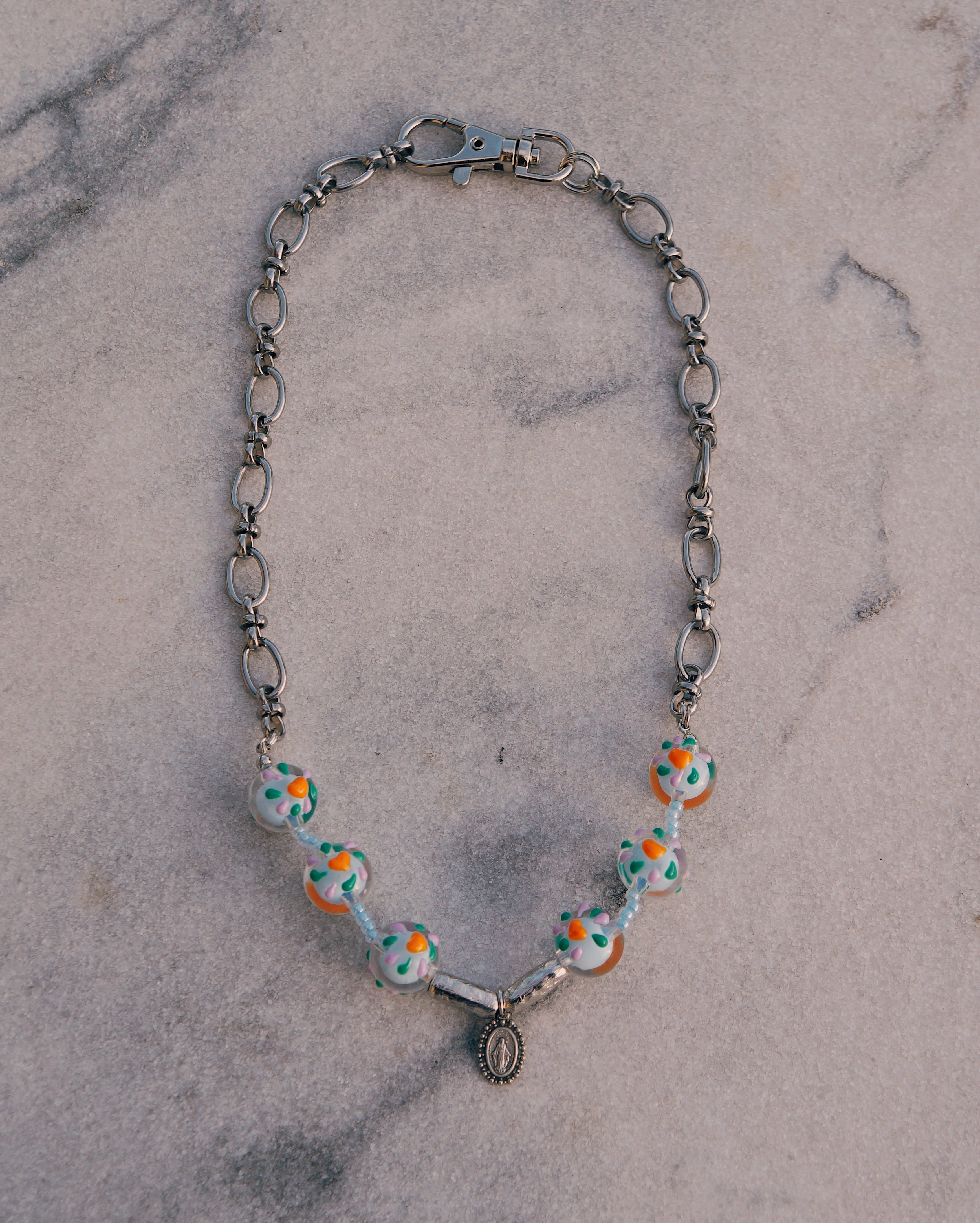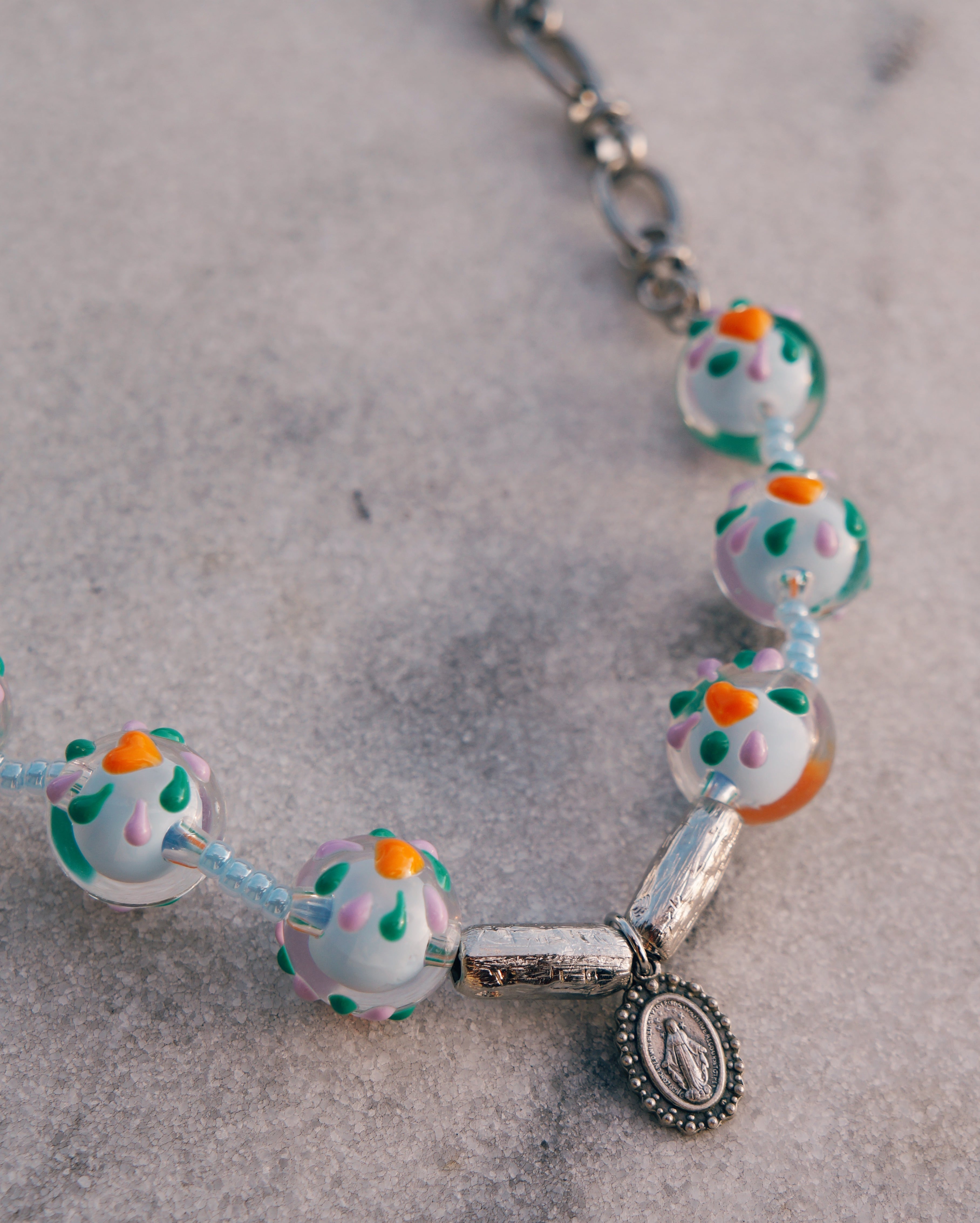 チェーンとカラフルでキュートなとんぼ玉を合わせたネックレスです。どのようなスタイリングにでも合わせすいデザインでありながら、しっかりと存在感はあり沢山のシーンで使っていただける一点です。
