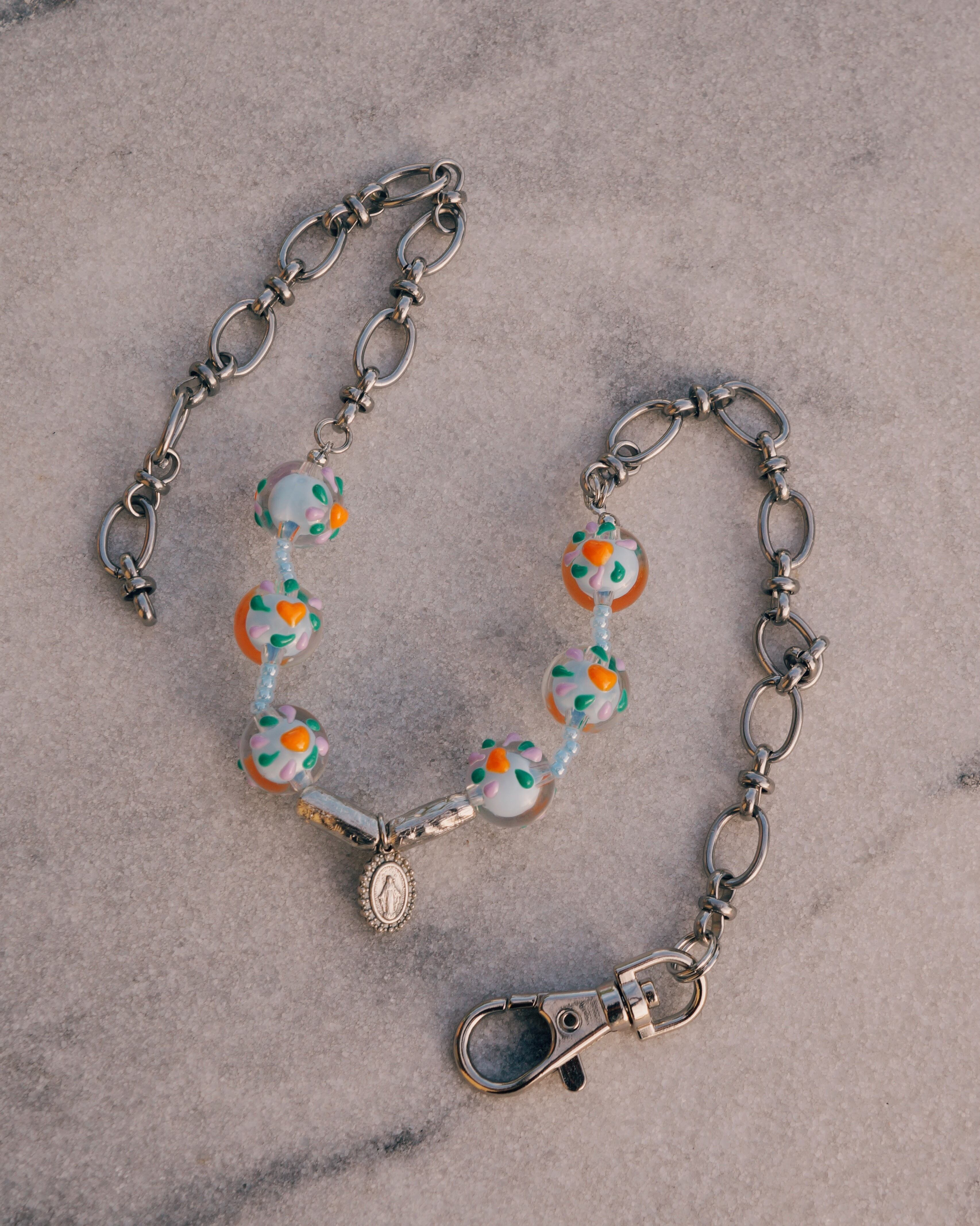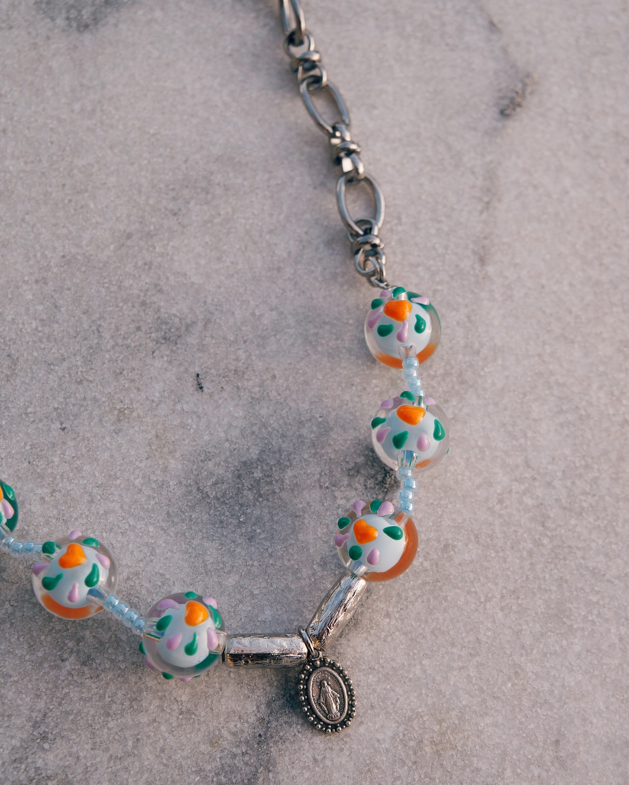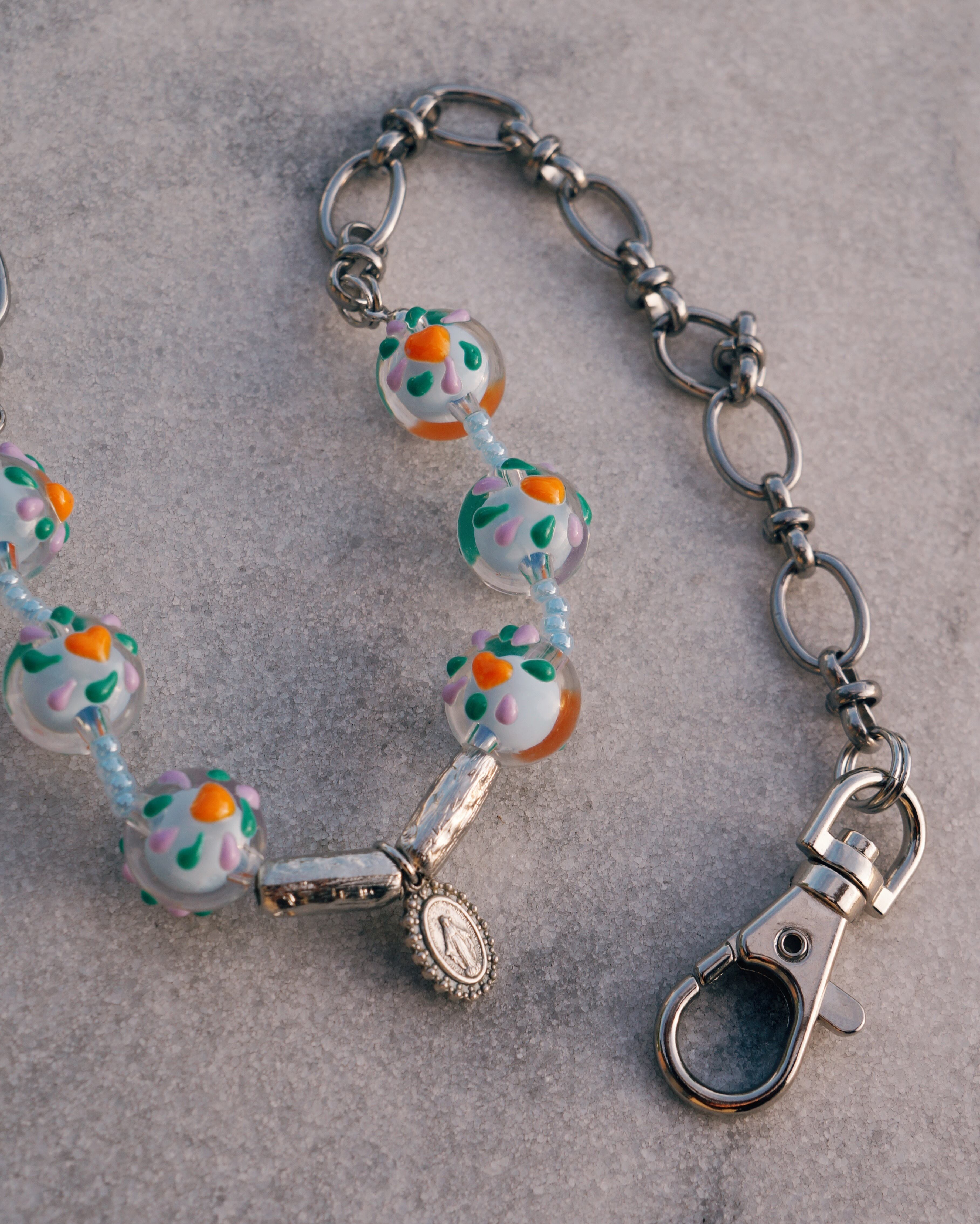 チェーンとカラフルでキュートなとんぼ玉を合わせたネックレスです。どのようなスタイリングにでも合わせすいデザインでありながら、しっかりと存在感はあり沢山のシーンで使っていただける一点です。