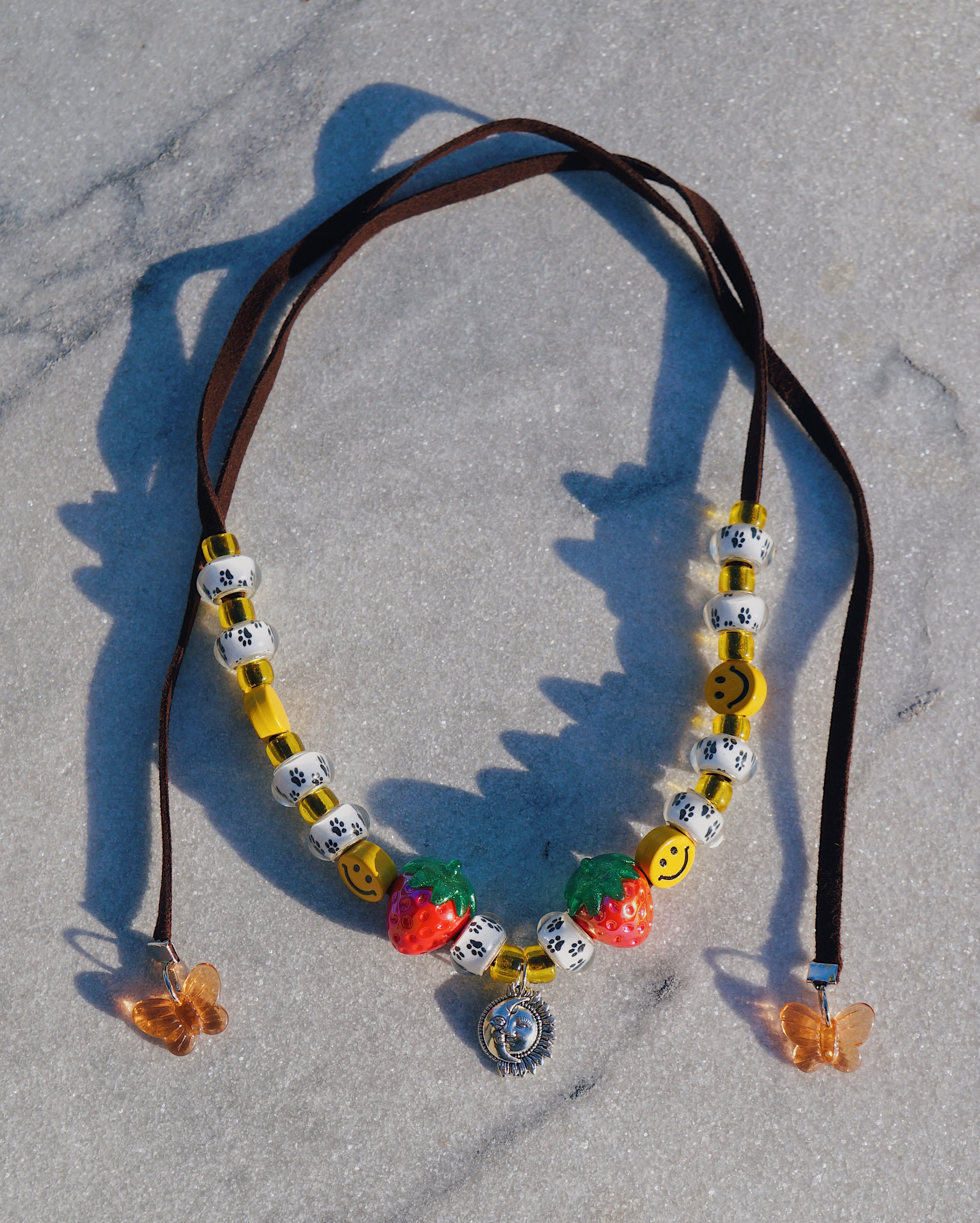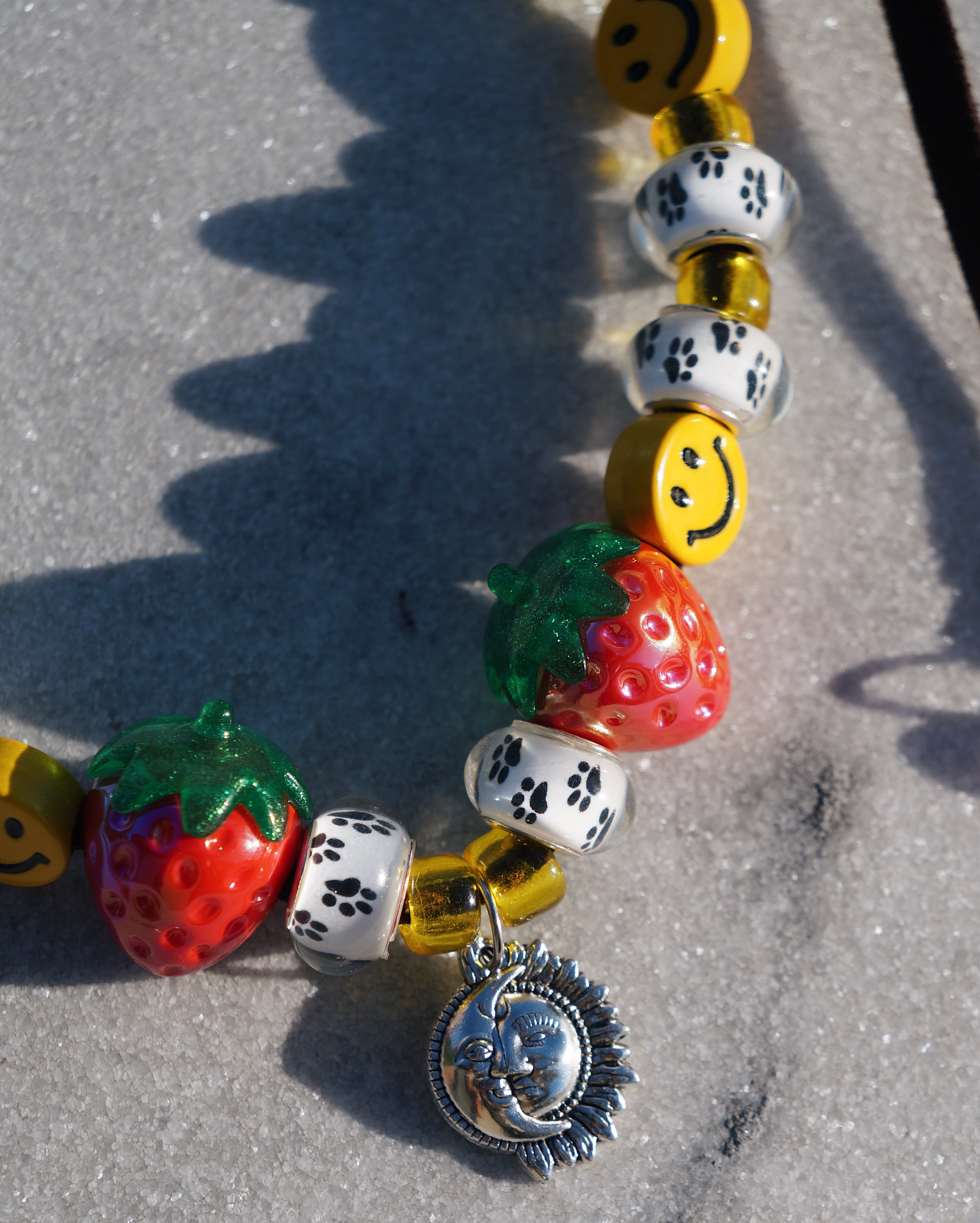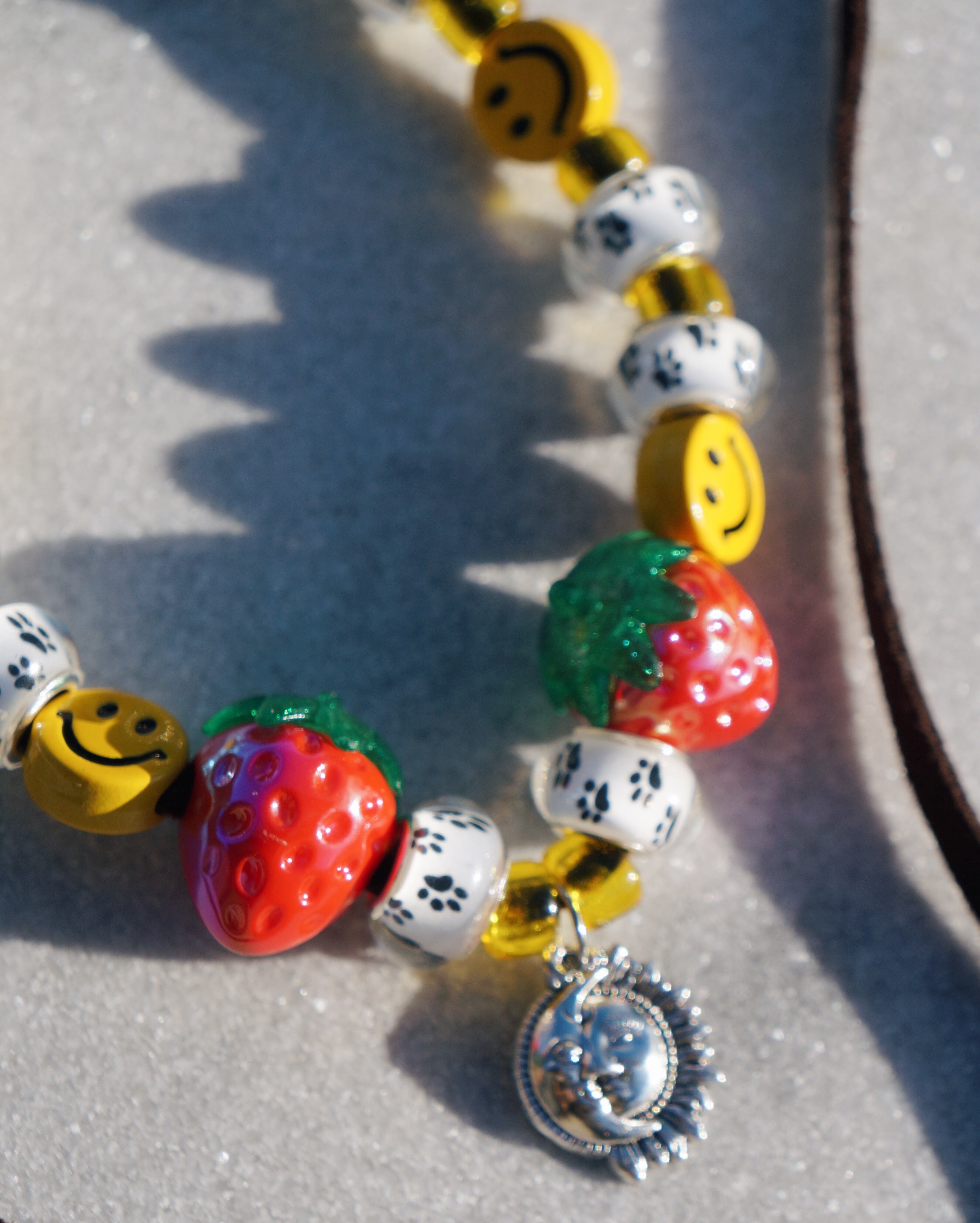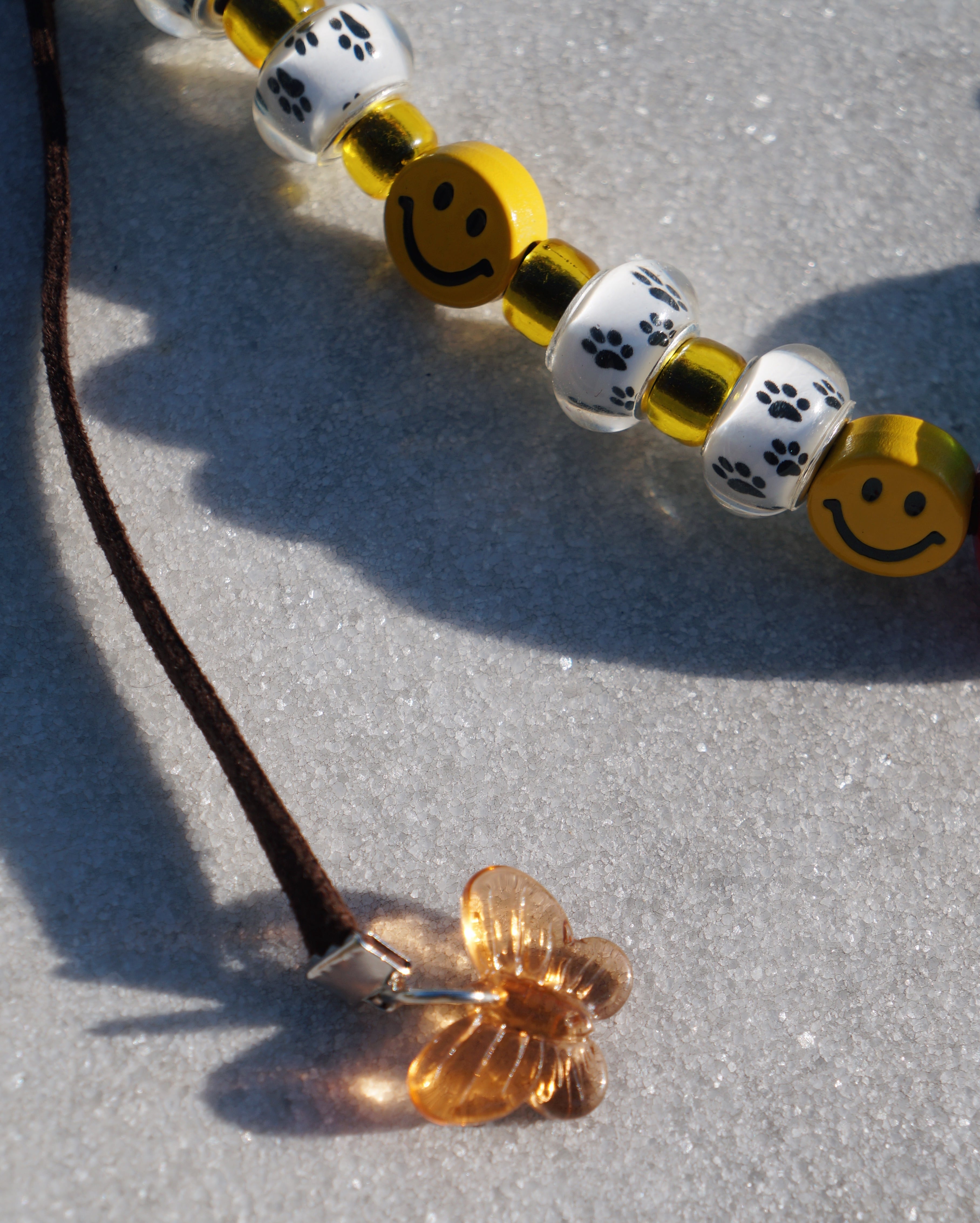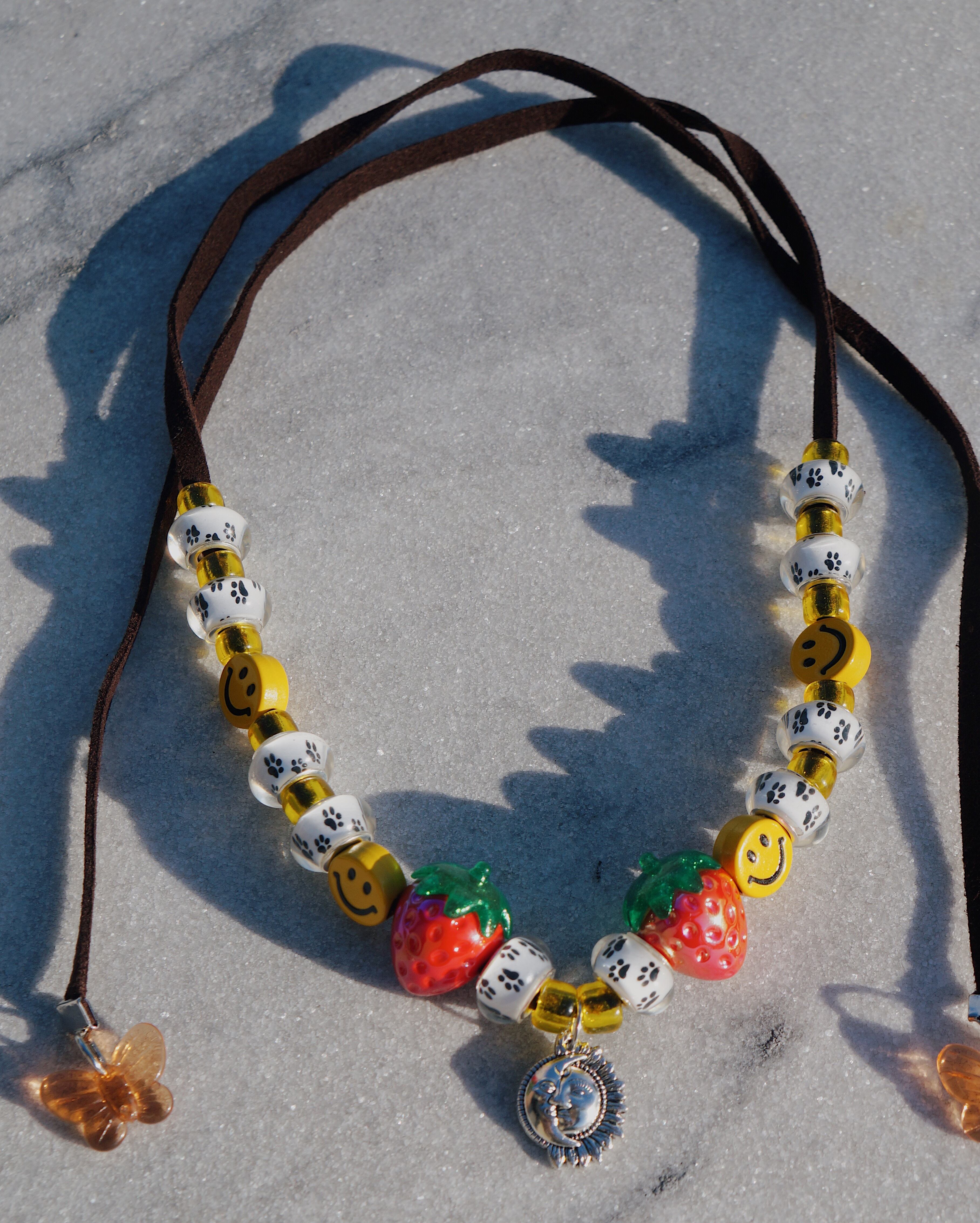 自分が好きな長さで結べるタイプのネックレスです。後ろでリボン結びしても前に垂らしても、またバックや腰ベルドなどに結んでチャームとして使ったりもできる万能な一点です。ニコちゃんにイチゴ、ワンちゃんの足跡、太陽な蝶などチャーミングなものを詰め込み見ているだけで元気になれそうなHAPPYなデザインにしました。