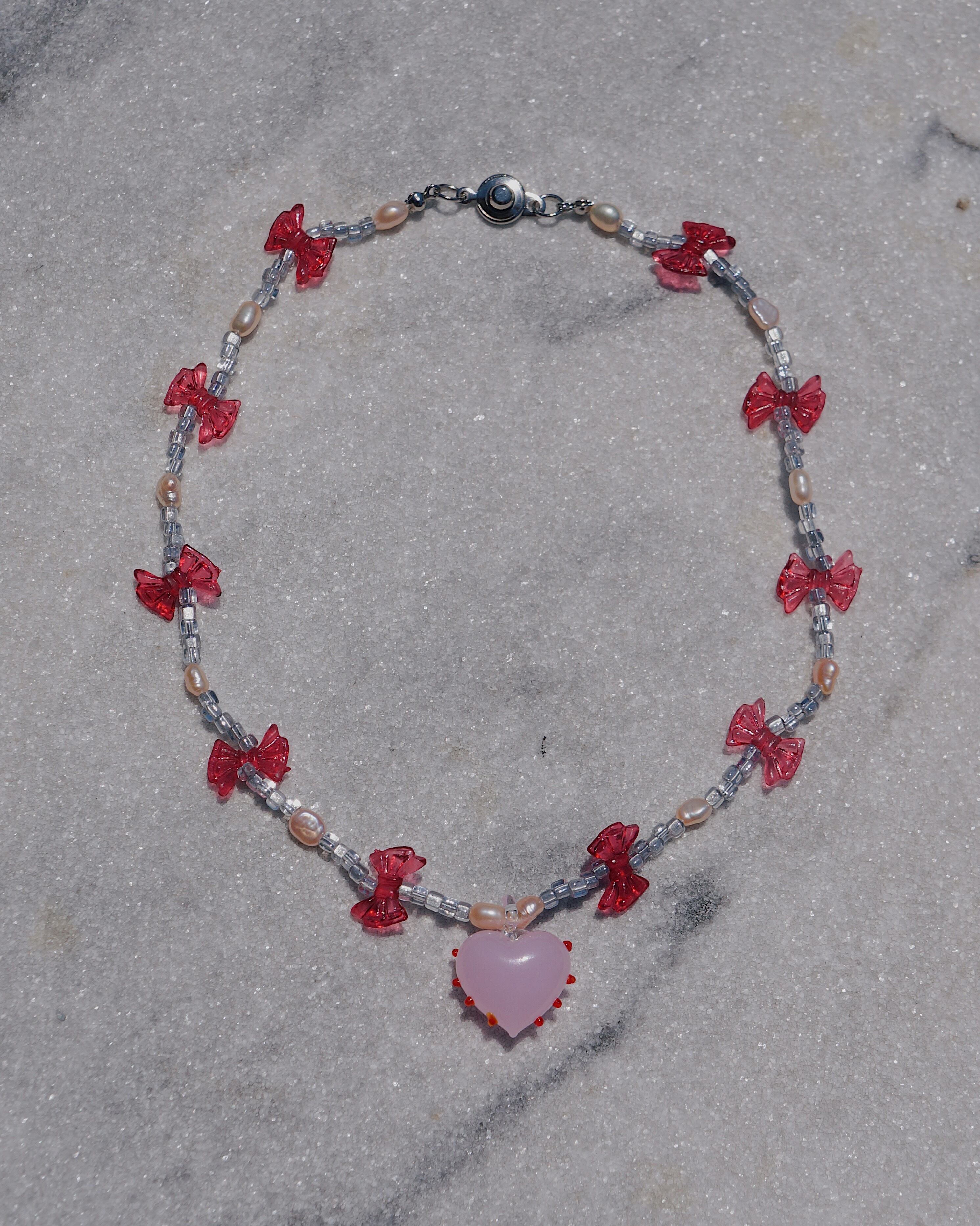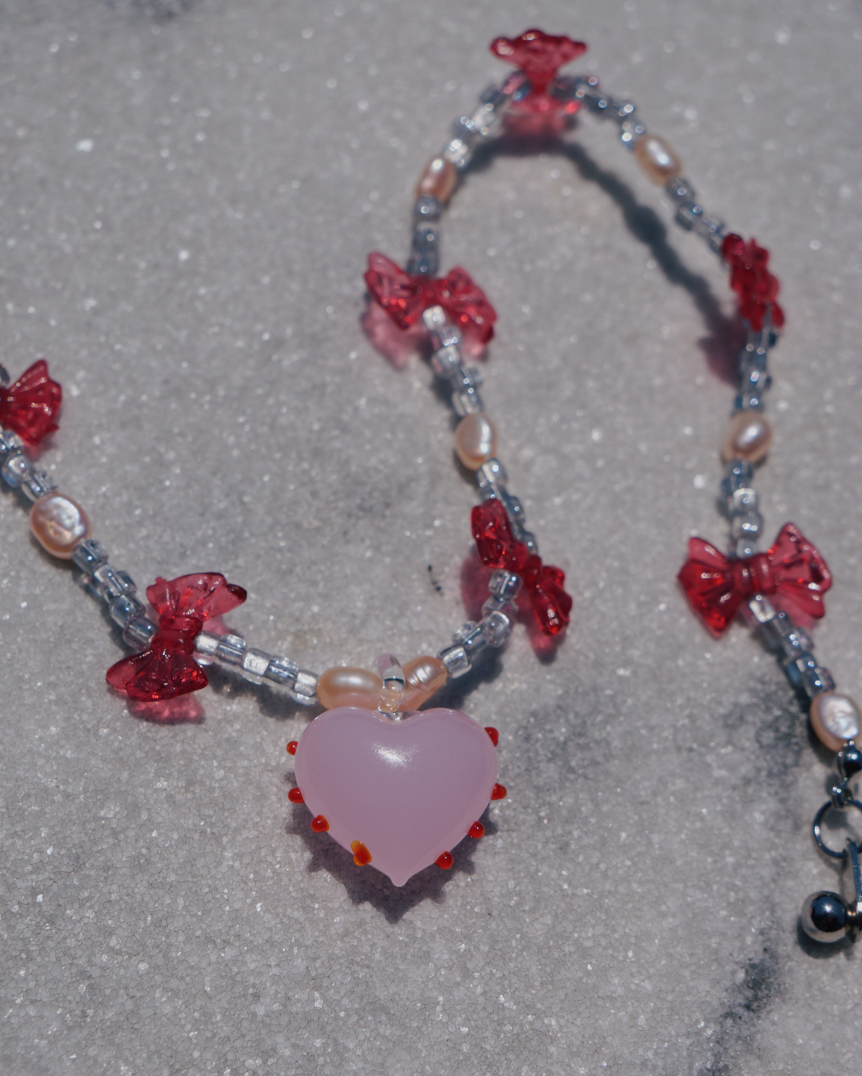 珍しいガラスチャームをデザインのメインにバレエシューズをイメージしてデザインしたとっても可愛らしいネックレスです。長さはデザインに合わせ短めですが、ちょうど鎖骨あたりにくる使いやすい長さです。