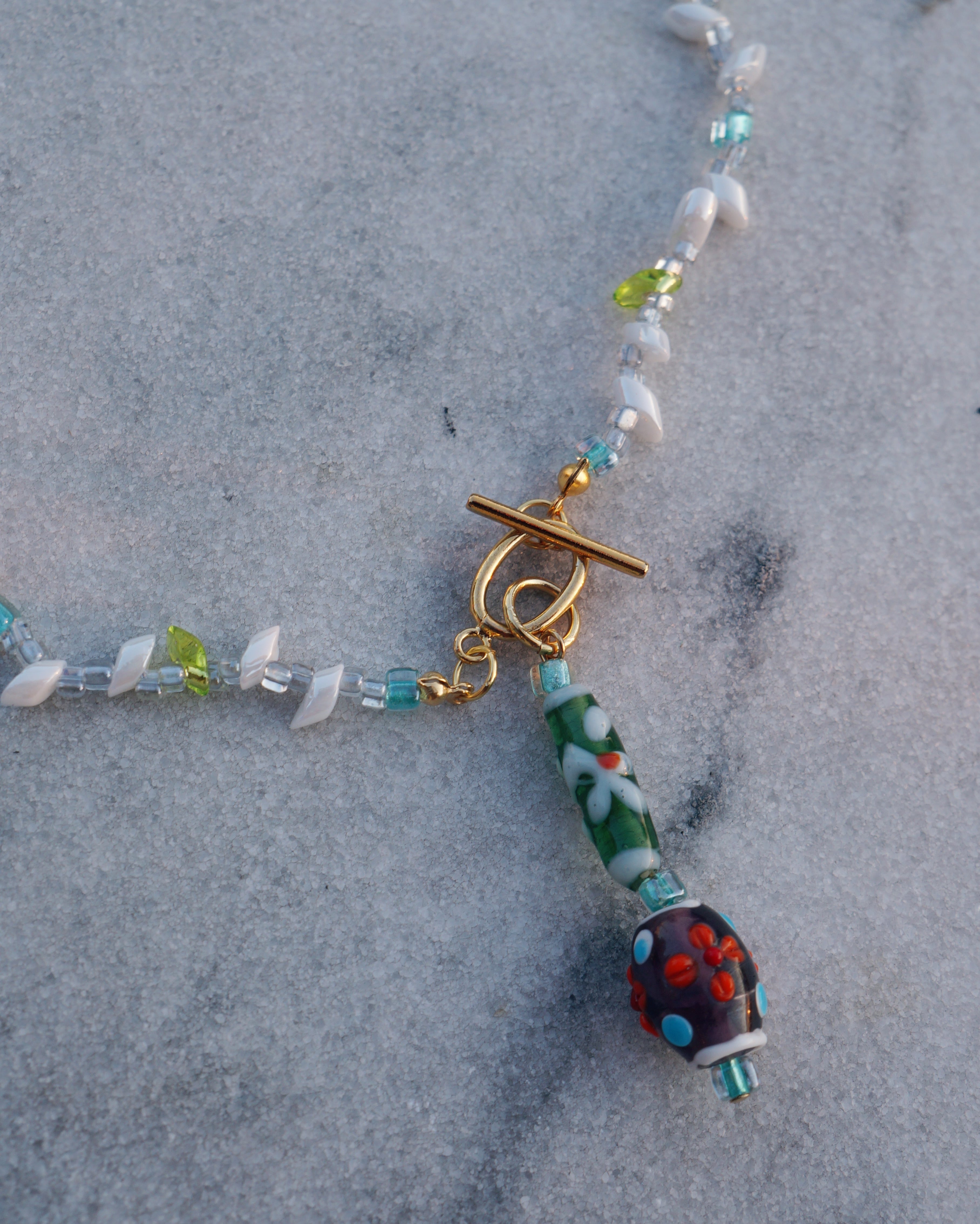 巻貝のモチーフのチェコビーズを前に持ってきても、マンテルについているガラスのビーズチャームを前に垂らしてもいい、お洋服や気分に合わせて使い方を変えれる万能な一点です。他にはない個性的なデザインでありながら色味がまとまっていて、どのようなお洋服にも合わせやすいネックレスです。