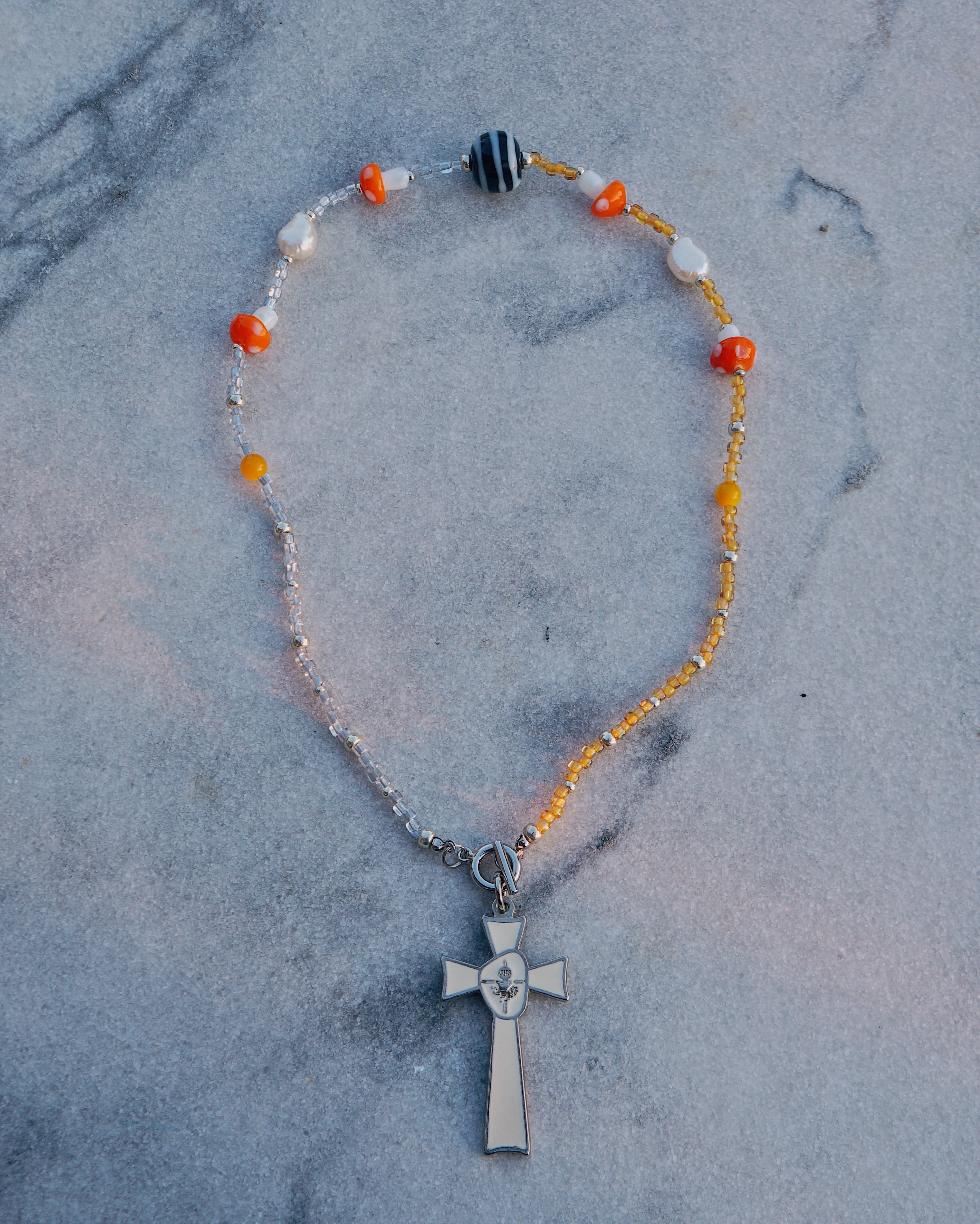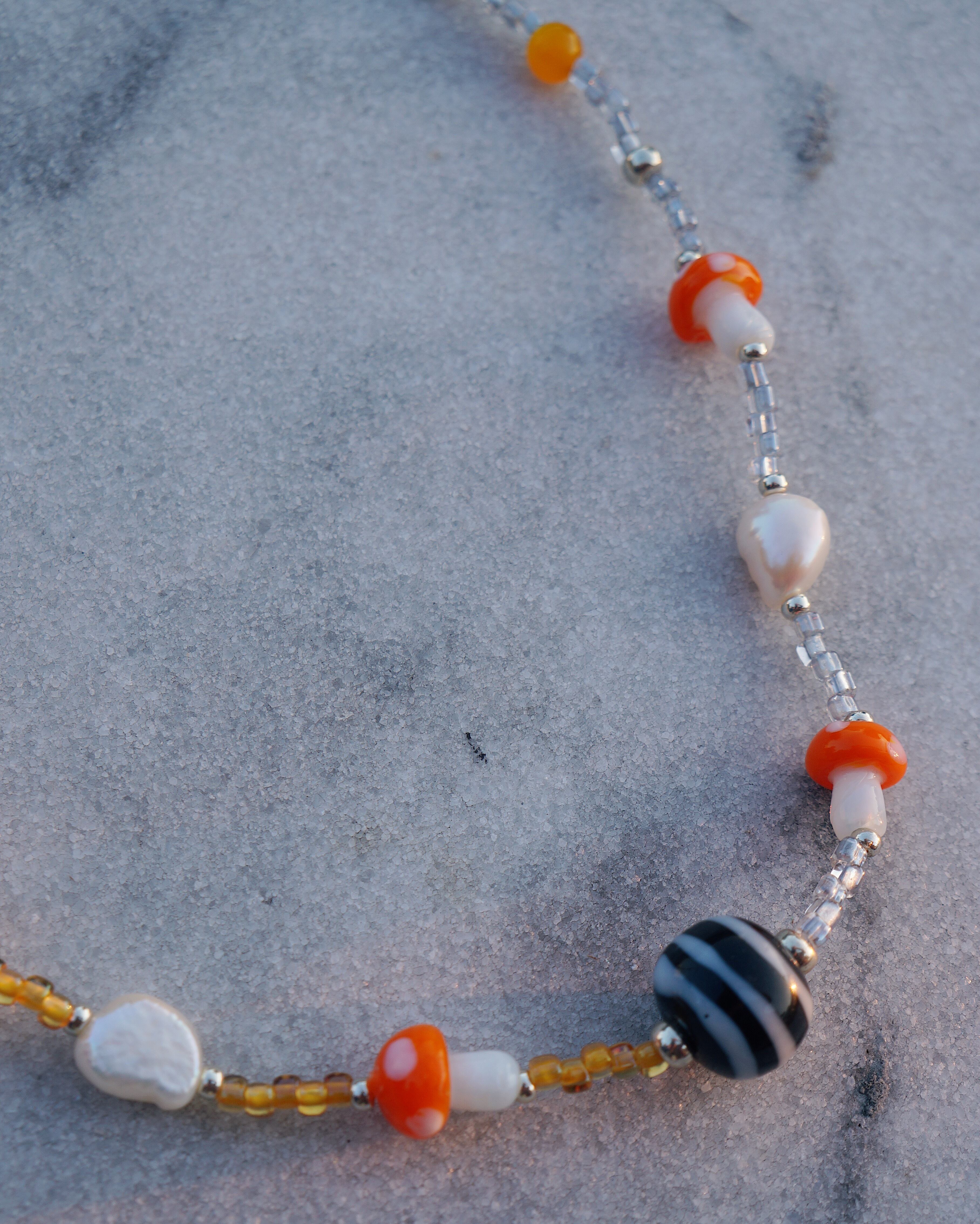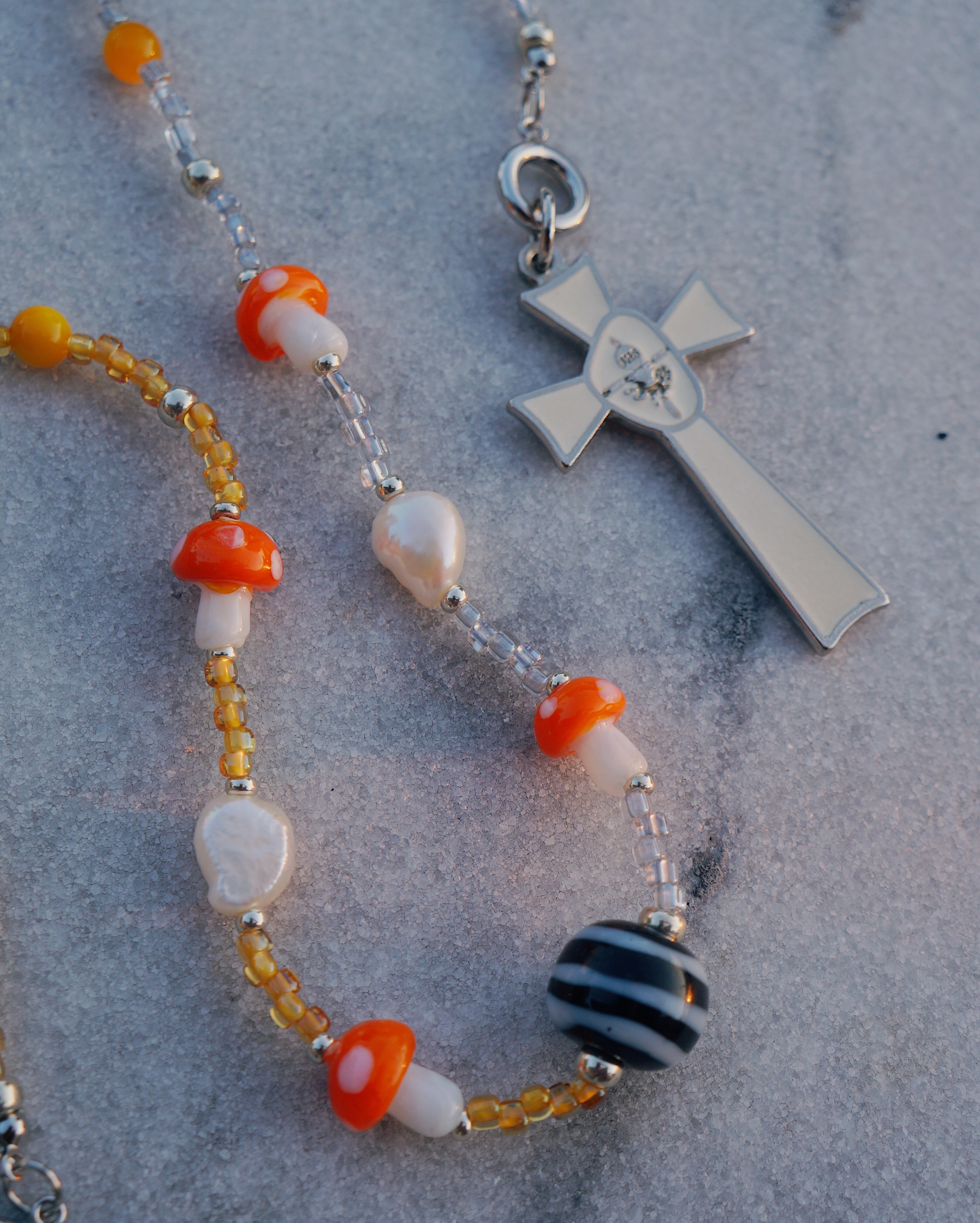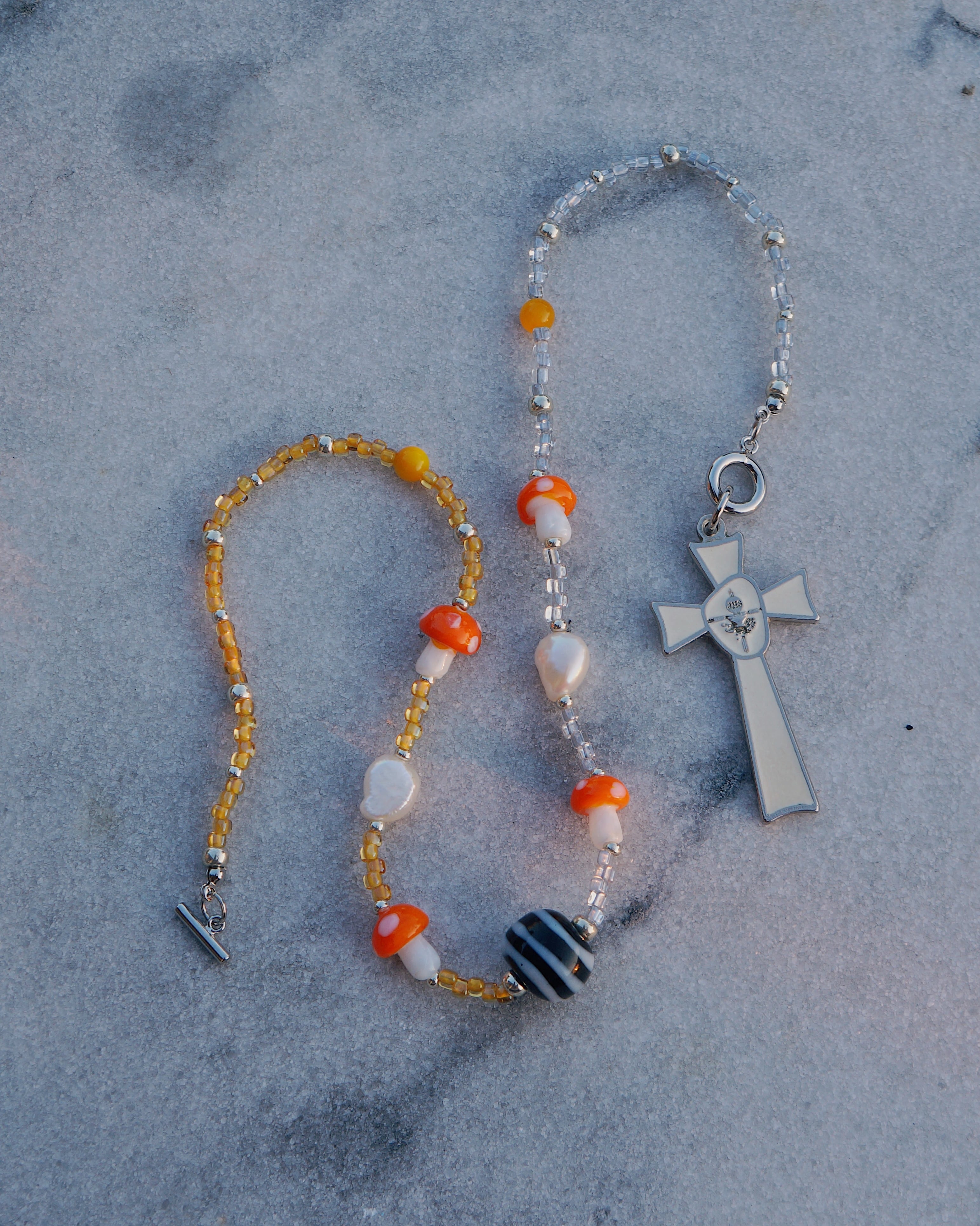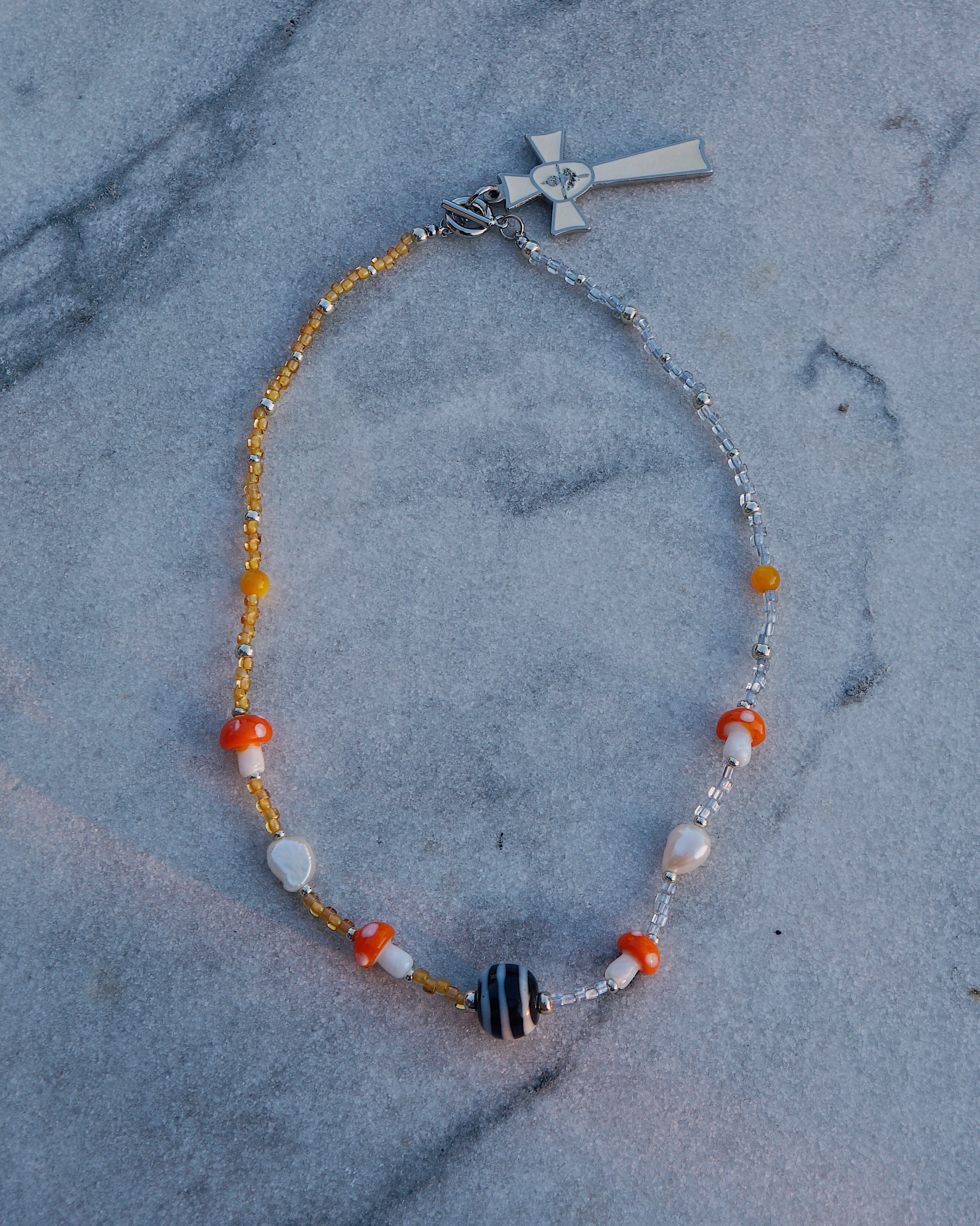 ガラスビーズを前に持ってきても、マンテルについている十字架のチャームを前に垂らしてもいい、お洋服や気分に合わせて使い方を変えれる万能な一点です。左右非対称なデザインやキノコのガラスビーズなど他にはない個性的なデザインでありながら色味がまとまっていて、どのようなお洋服にも合わせやすいネックレスです。