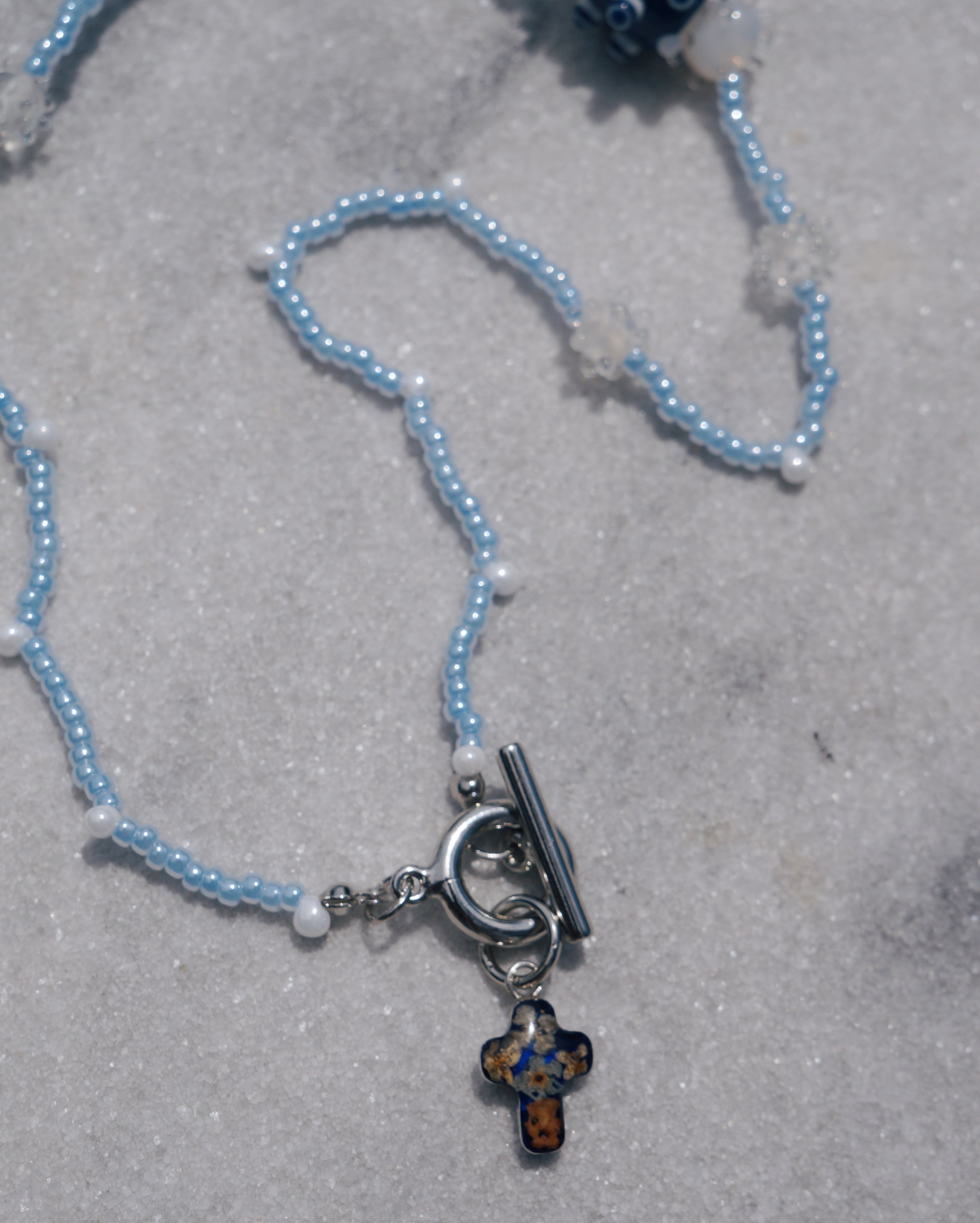 ガラスビーズを前に持ってきても、マンテルについている十字架のチャームを前に垂らしてもいい、お洋服や気分に合わせて使い方を変えれる万能な一点です。ビンテージの十字架チャームや珍しいトゲトゲのデザインが可愛いガラスビーズなどを個性的なデザインでありながら色味がまとまっているので、どのようなお洋服にも合わせやすいネックレスです。他のネックレスとの重ね付けもおすすめです。※トゲトゲがついている硝子のビーズはとても繊細なパーツとなっています。稀少なビンテージビーズのため多少トゲが取れている部分もございますがご了承ください。
