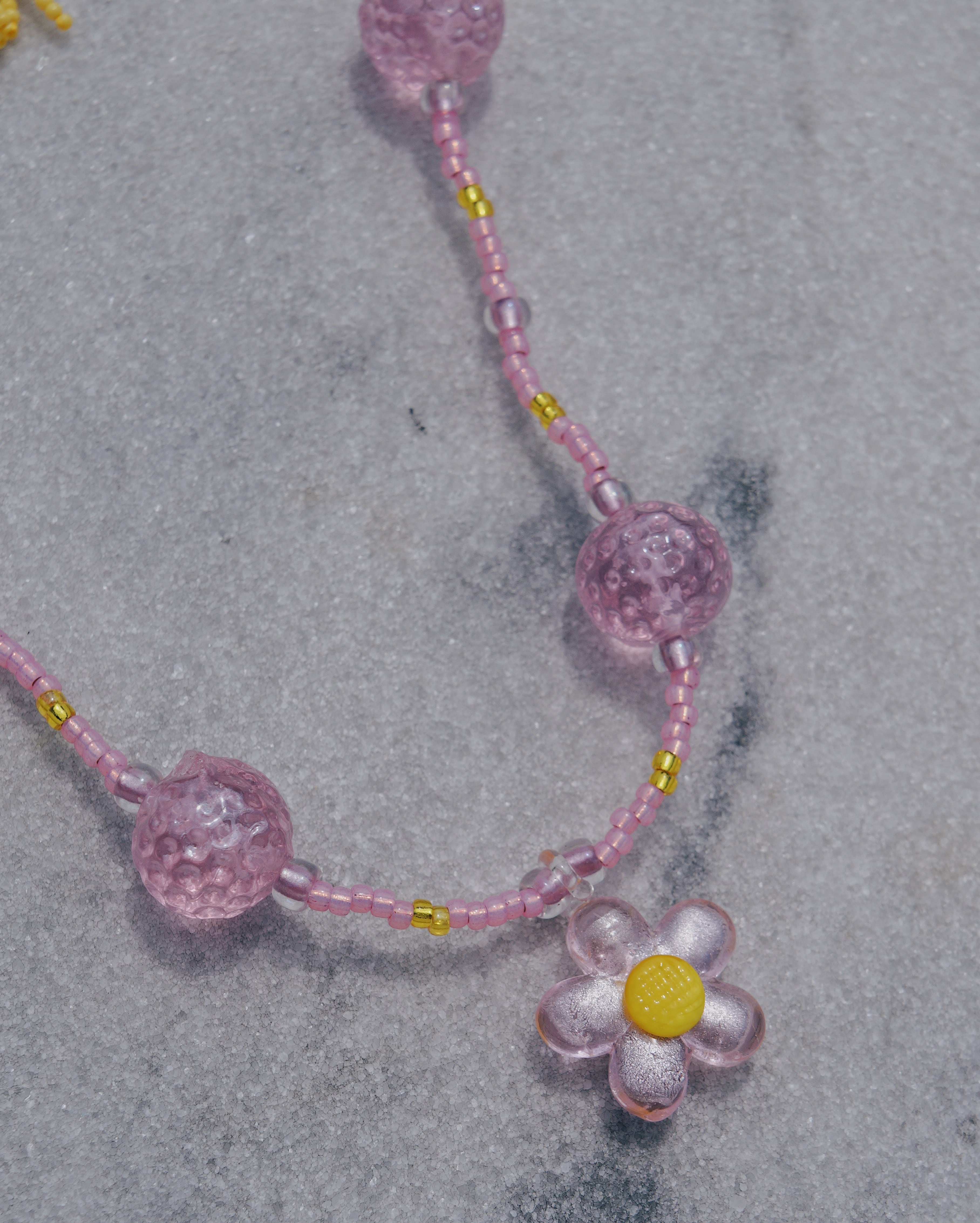 お花のガラスチャームを前に持ってきても、マンテルについているビーズのフリンジチャームを前に垂らしてもいい、お洋服や気分に合わせて使い方を変えれる万能な一点です。個性的で存在感があり、コーディネートの主役になるようなネックレスです。希少なガラスのチャームに、ビーズのフリンジ、ピンクと黄色のカラーコンビネーションと全てがキュートで見ているだけでうっとりしてしまいます。※硝子のチャームはとても繊細なパーツとなっていますのでお取り扱いにご注意下さい。