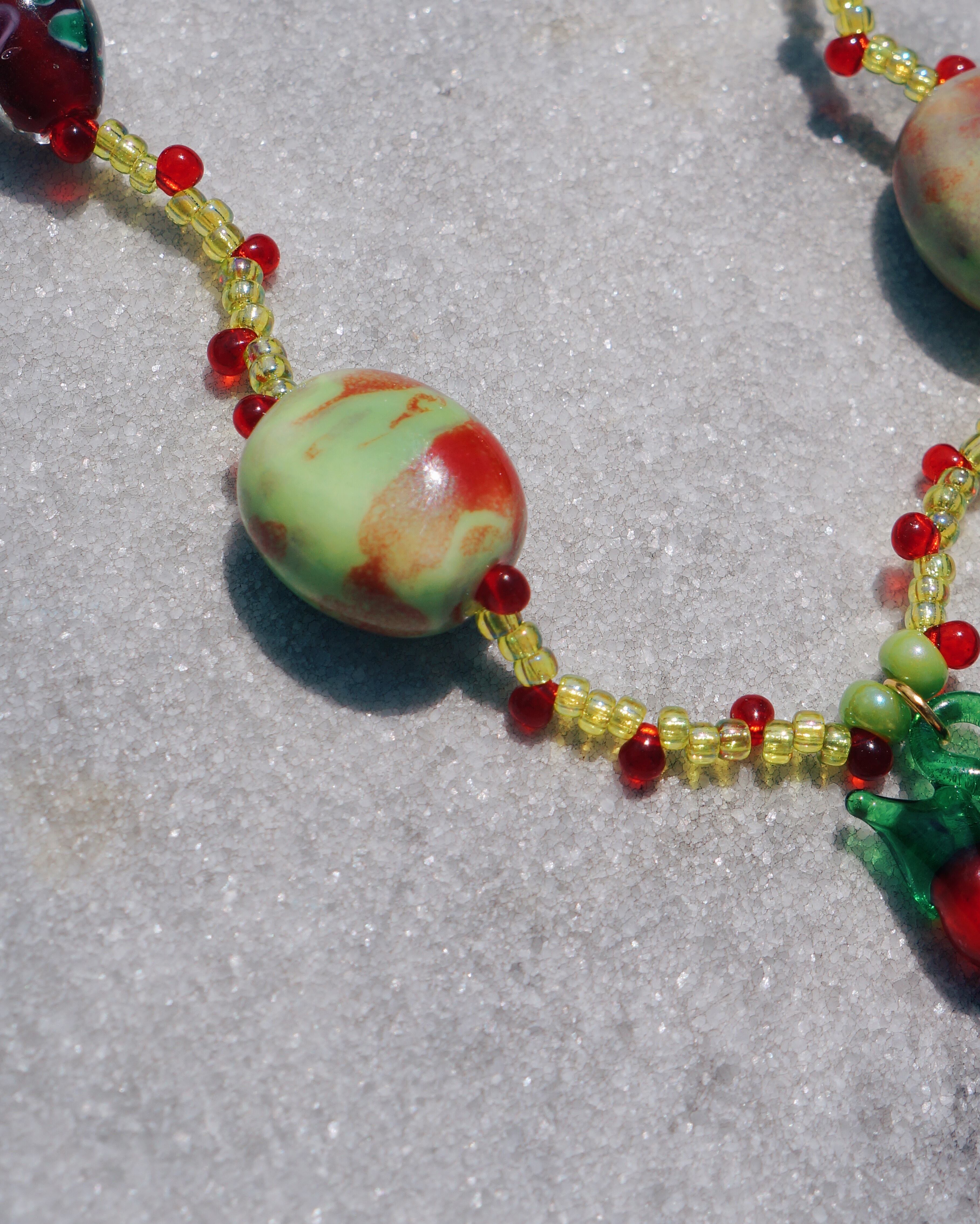 ピアスとネックレスの美しいセットアイテムです。緑と赤のカラーコンビネーションにガラスのチェリーのチャームがとってもキュートで、個性的でJBCGらしいコーディネートの主役になるような素敵な一点です。カジュアルなスタイルだけでなくドレッシーなスタイリングにもとても合います。※硝子のチャームはとても繊細なパーツとなっていますのでお取り扱いにご注意下さい。