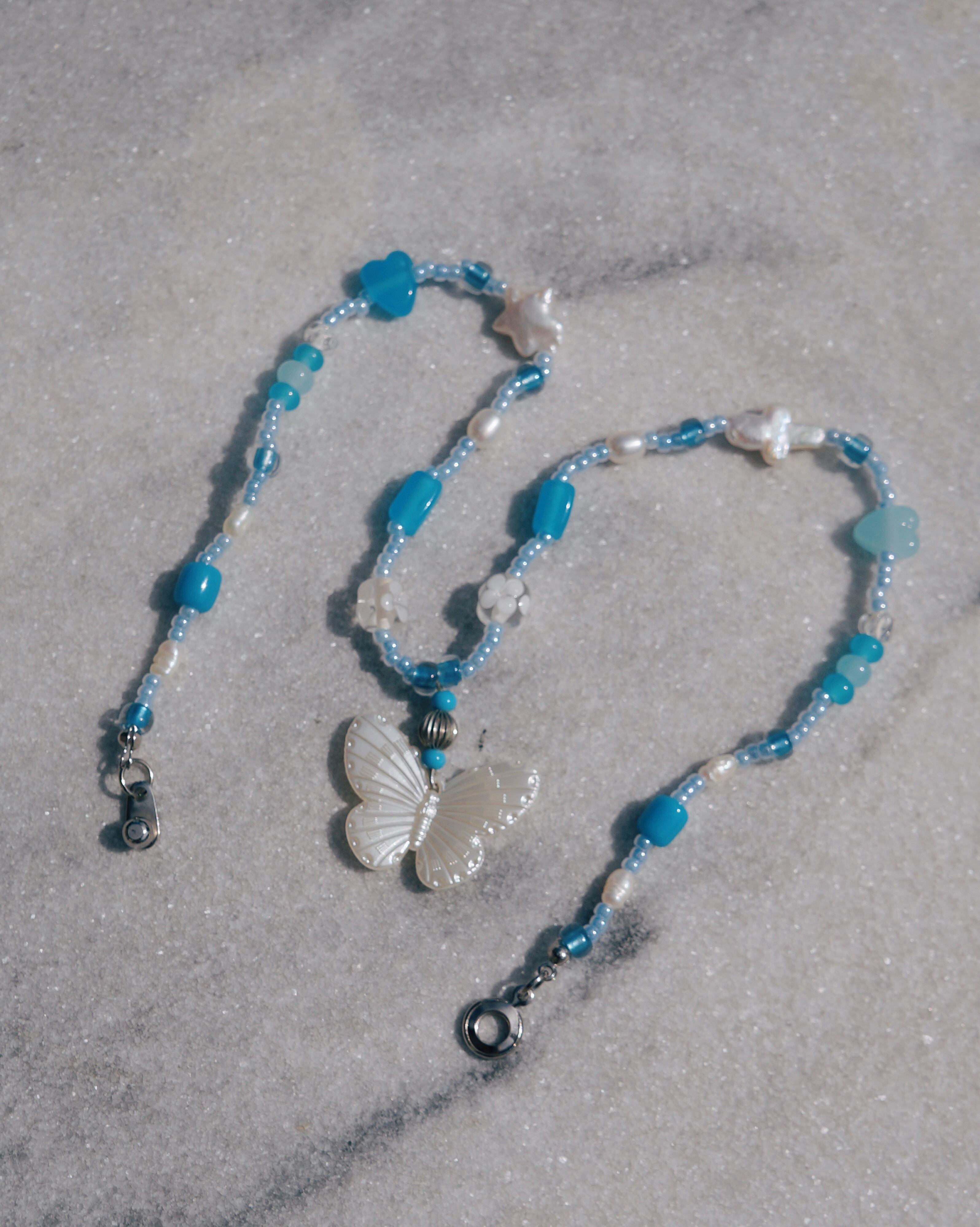 透き通った青空に蝶が舞うような素敵な瞬間をデザインに落とし込んだ一点です。希少なケシパールやガラスビーズを使い美しいネックレスに仕上げました。個性的でJBCGらしいデザインでありながら色味がまとまっているので、どのようなお洋服にも合わせやすいネックレスです。