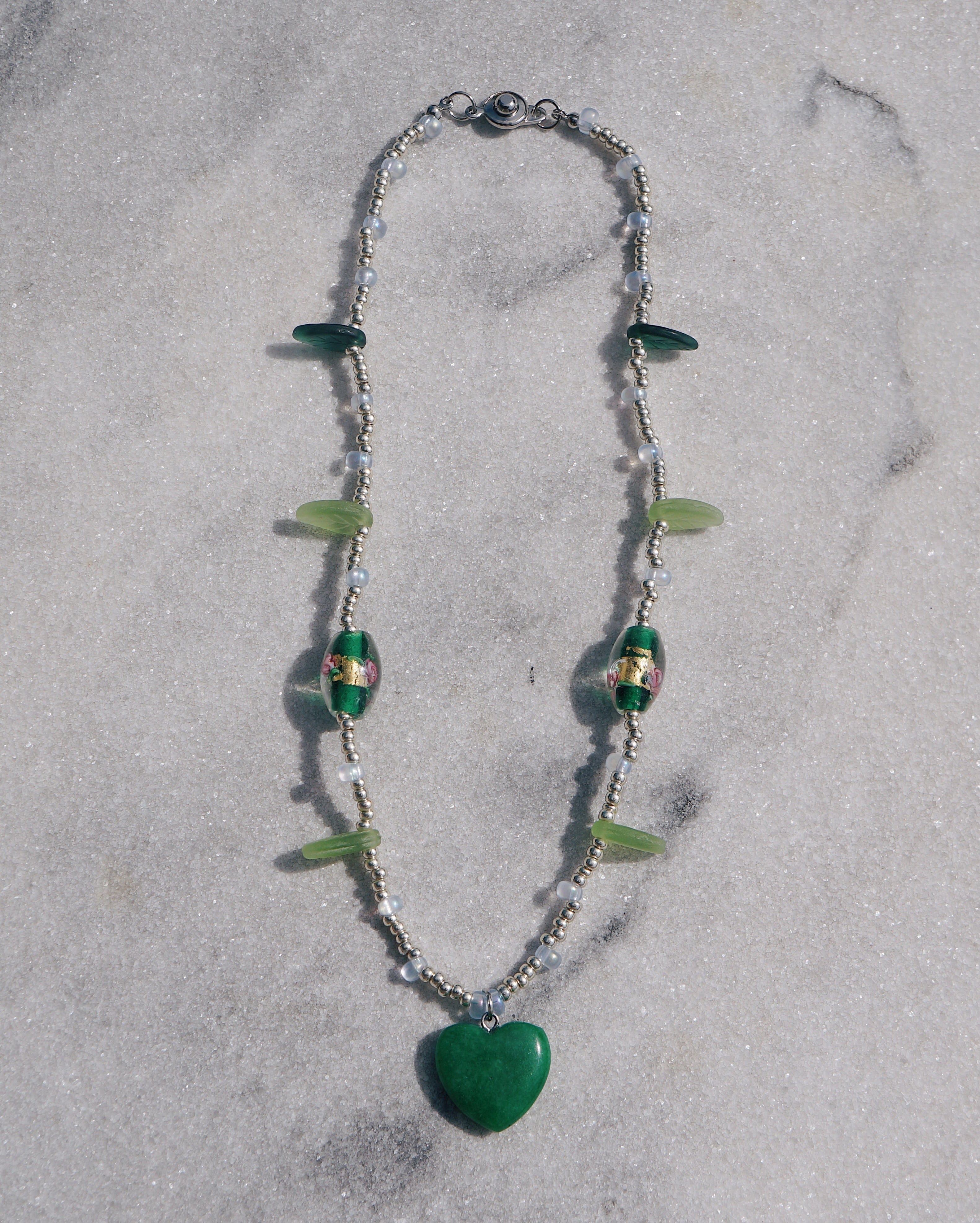 天然石のハートチャームや、葉っぱのビーズ、お花が描かれているガラスビーズなどを使った美しい一点です。個性的でJBCGらしいデザインでありながら色味がまとまっているので、どのようなお洋服にも合わせやすいネックレスです。