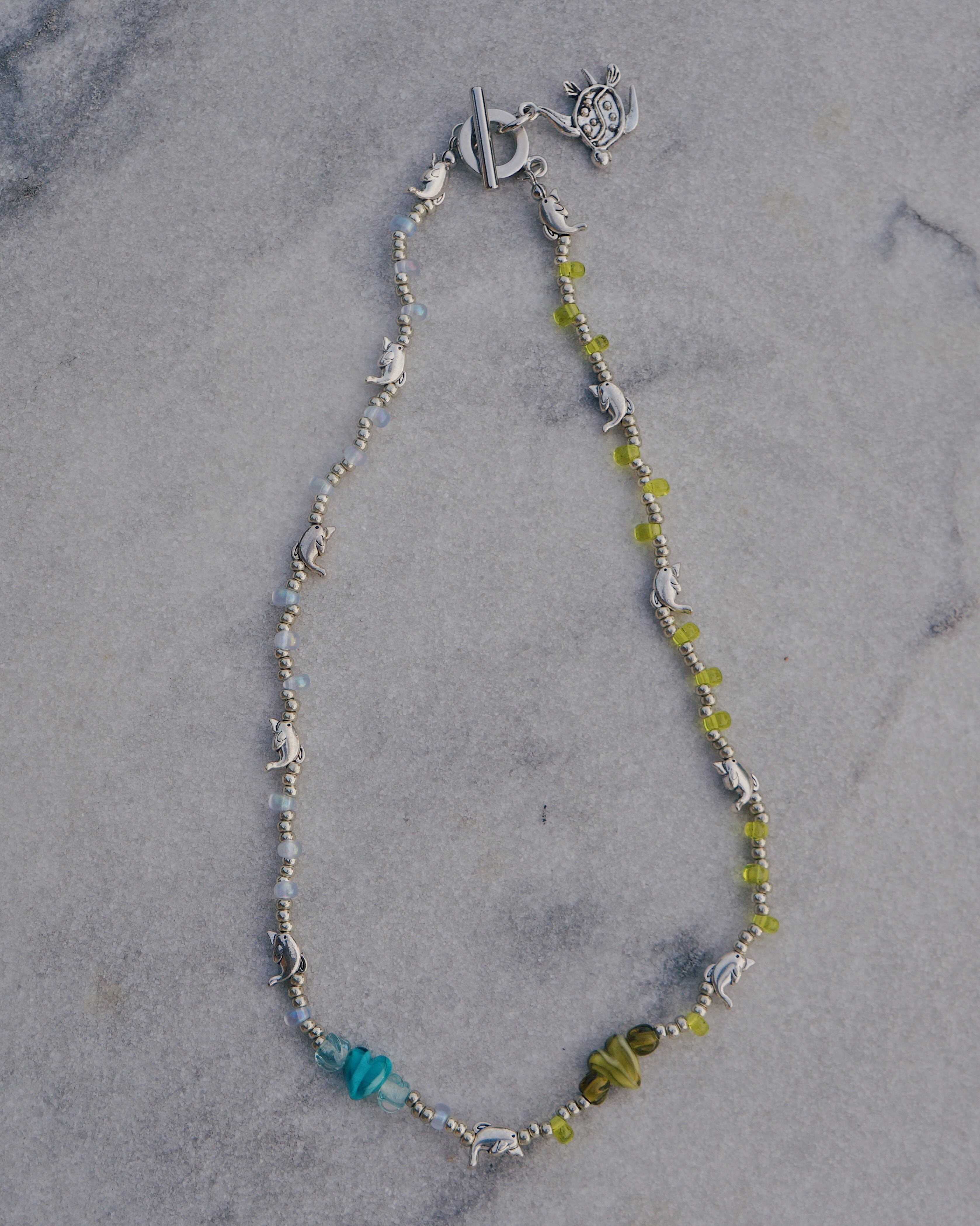 ビーズネックレスとしても、マンテルについている亀のチャームを前に垂らしてもいい、お洋服や気分に合わせて使い方を変えれる万能な一点です。敢えて左右非対称の色味にしてあるデザインやドルフィンのビーズ、ハートのガラスビーズや、亀のチャーム、全てのパーツやデザインが拘ってあり一見シンプルでどのようなスタイルにも合せやすいネックレスでありながら、ユニークさも兼ね備えています。