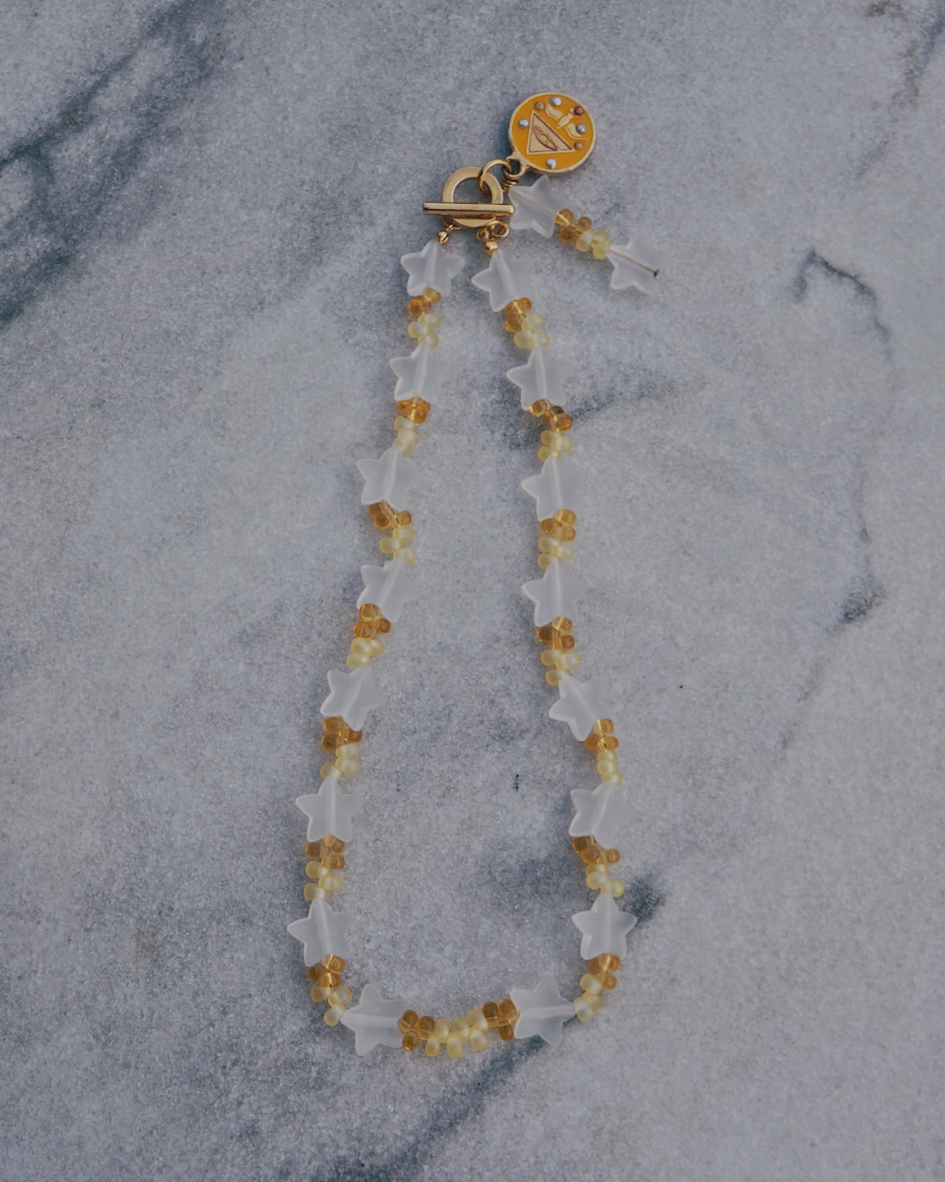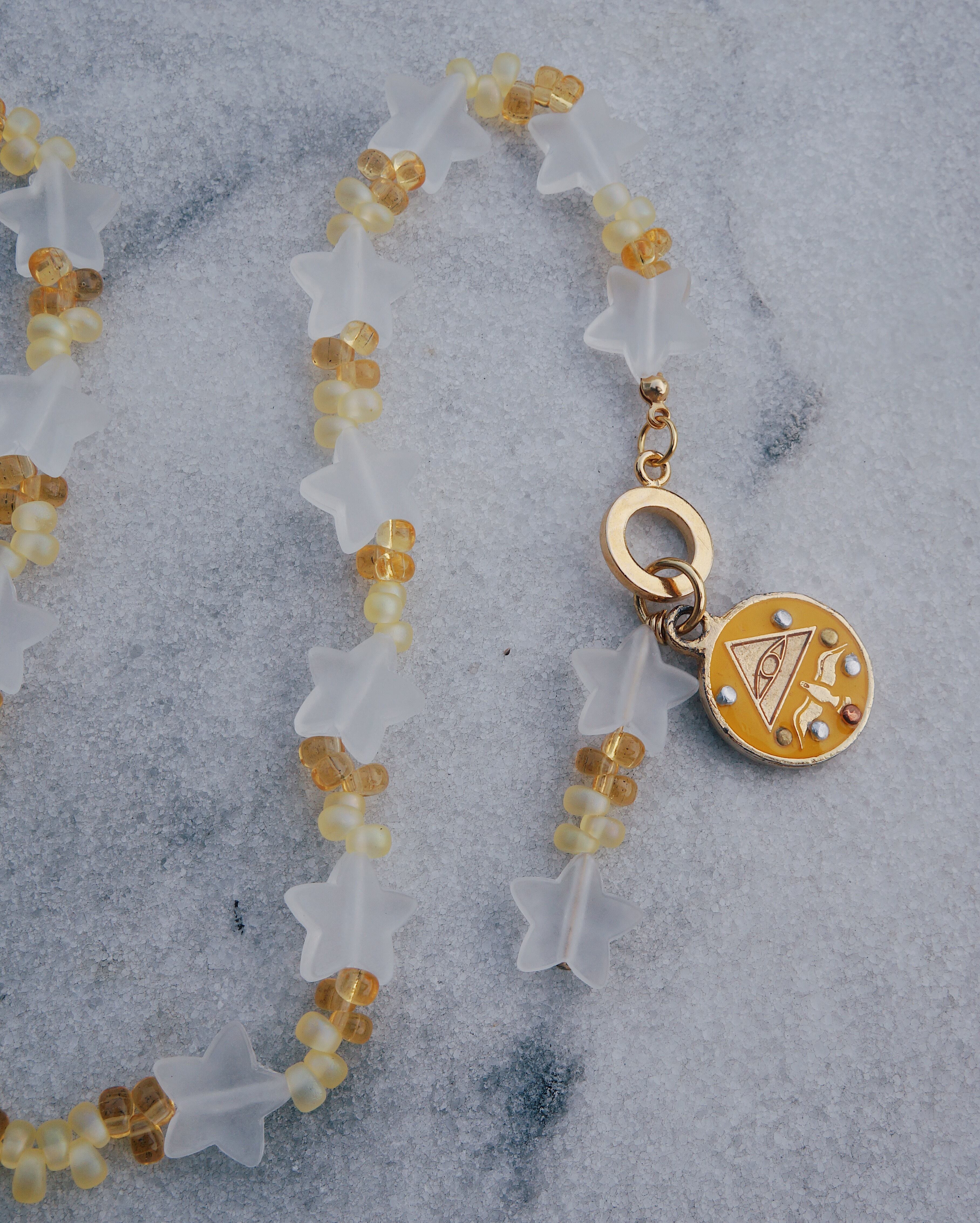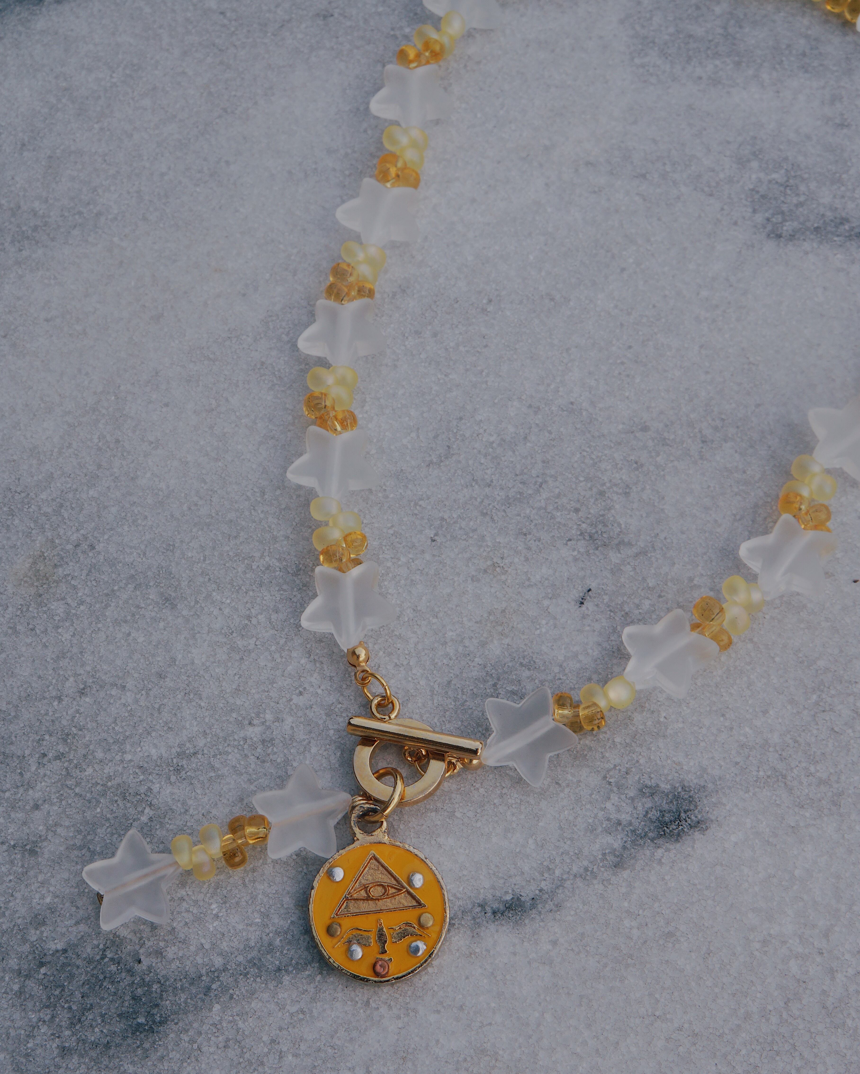ビーズネックレスとしても、マンテルについているチャームを前に垂らしてもいい、お洋服や気分に合わせて使い方を変えれる万能な一点です。に合わせて使い方を変えれる万能な一点です。星のビーズと、とても希少なメキシコ製のアンティークのチャームが可愛いネックレスです。