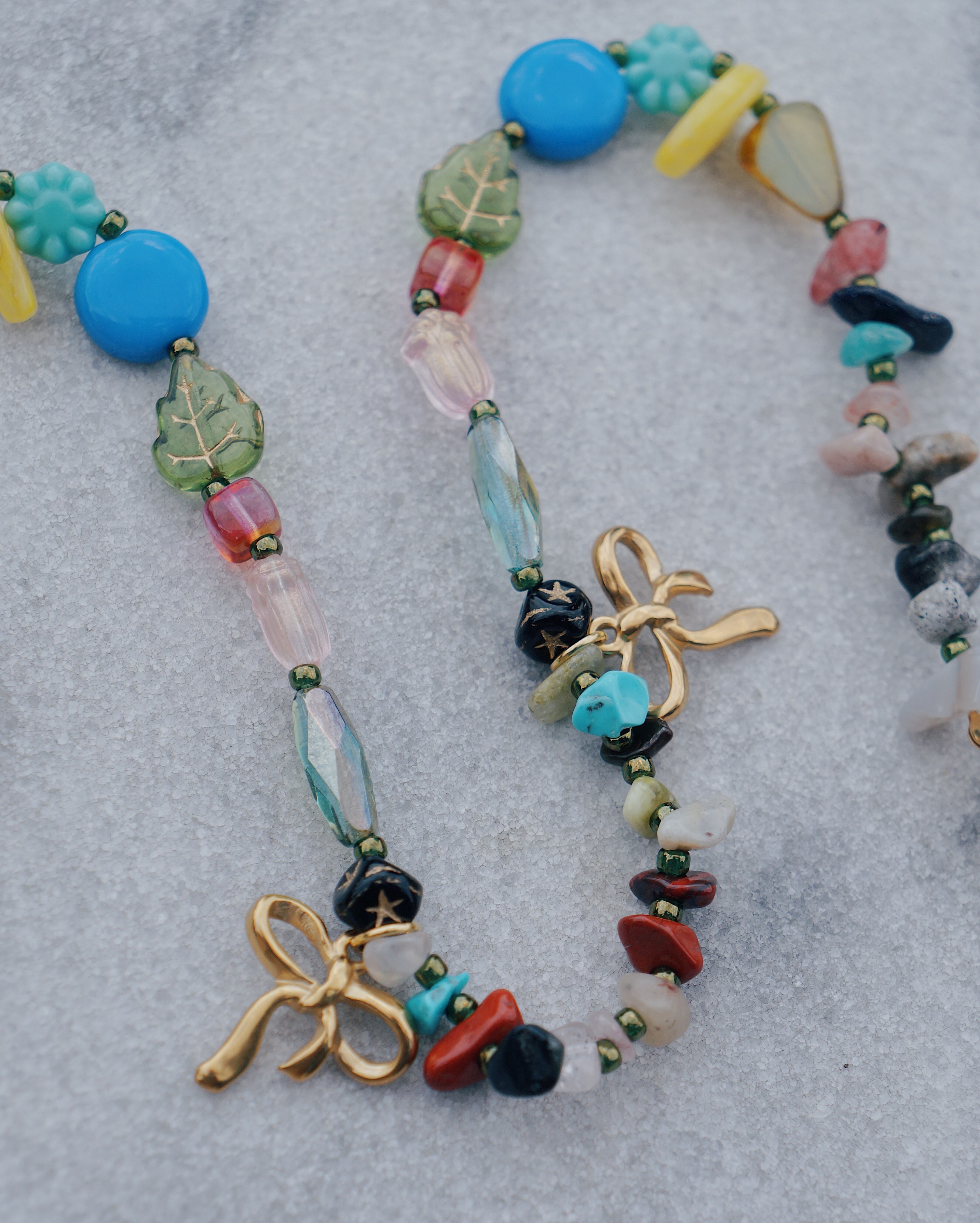 様々なカラーの石のビーズと、沢山のモチーフのチェコビーズを使ったカラフルでHAPPYな一点です。そこにリボンのチャームをつけチャーミングなプレゼントの包み紙を開ける時のワクワク感をイメージしたネックレスにデザインしました。少しアンティークのような雰囲気も詰め込んだJBCGらしいユニークなネックレスです。