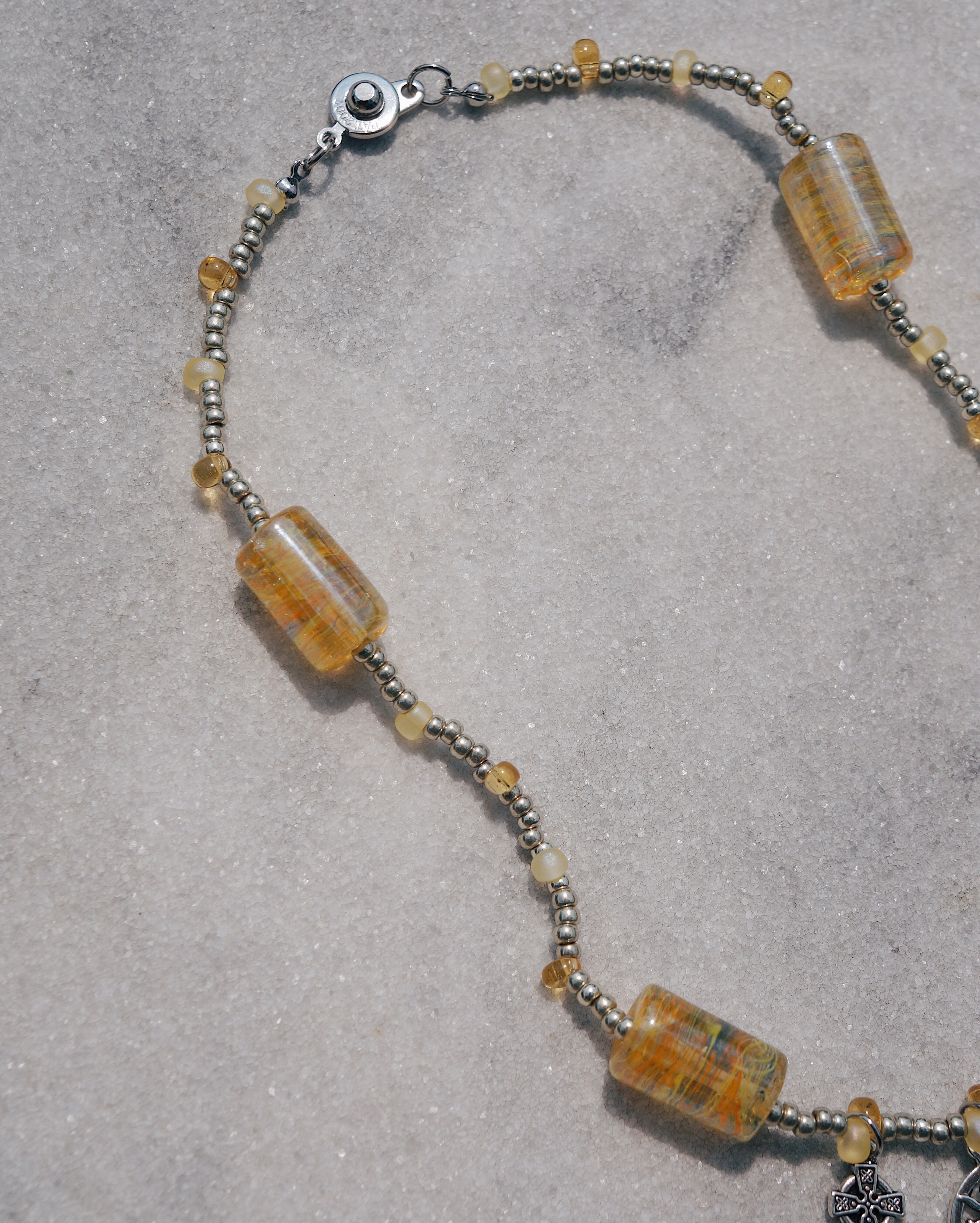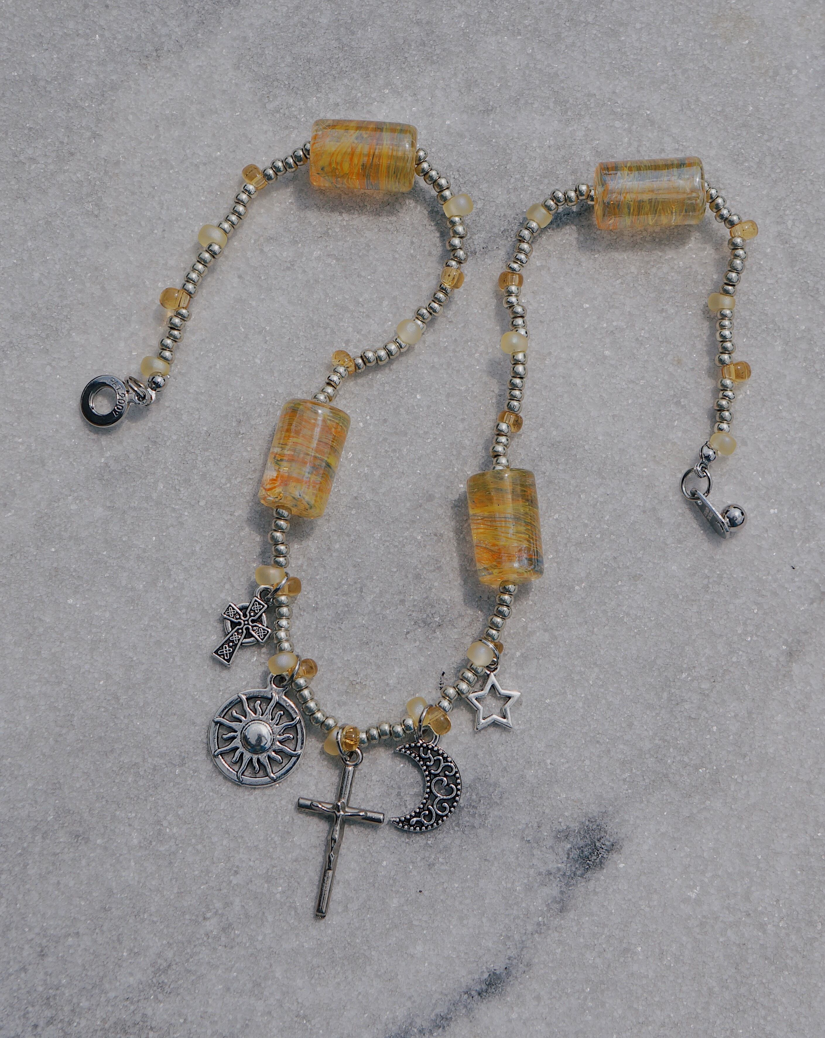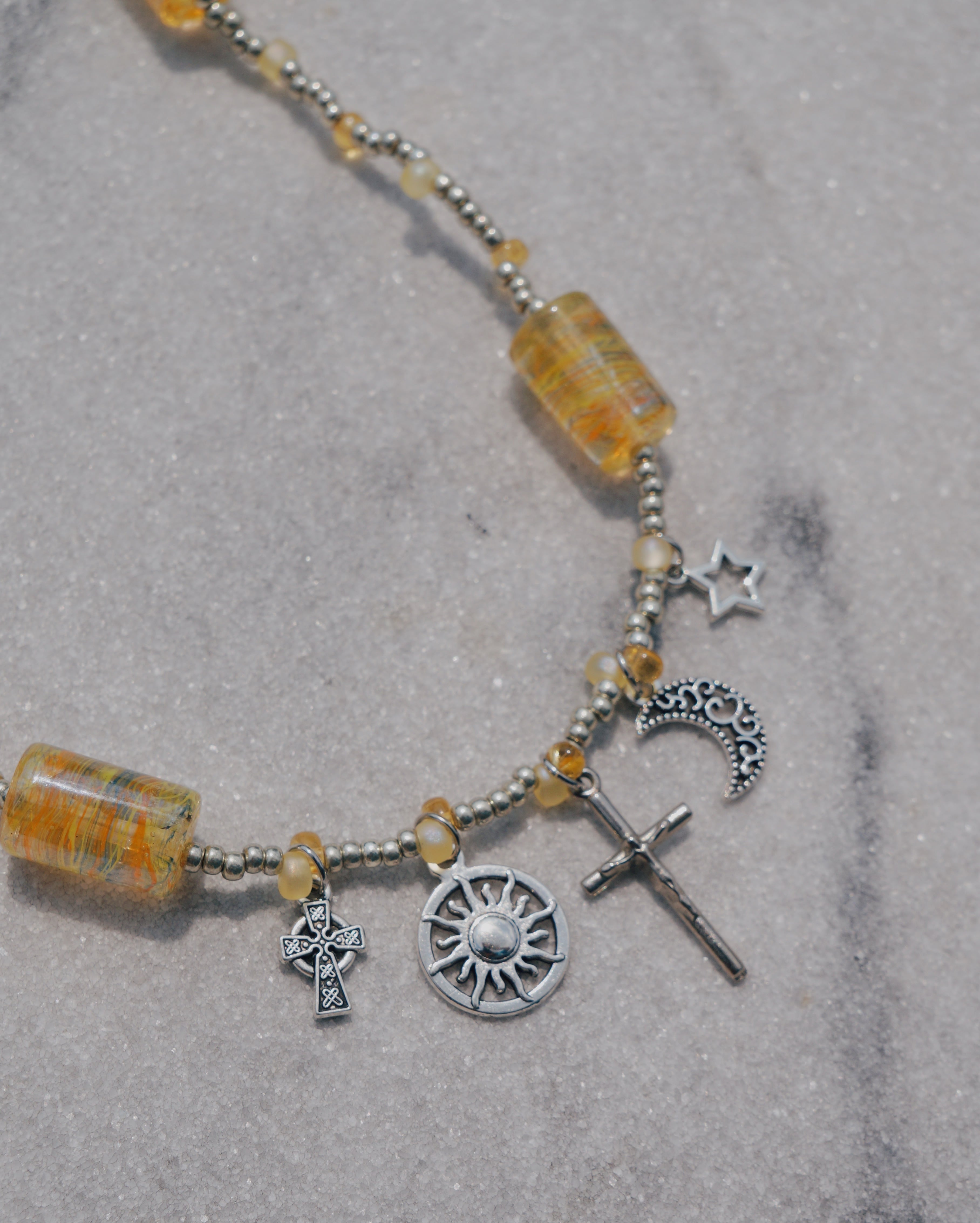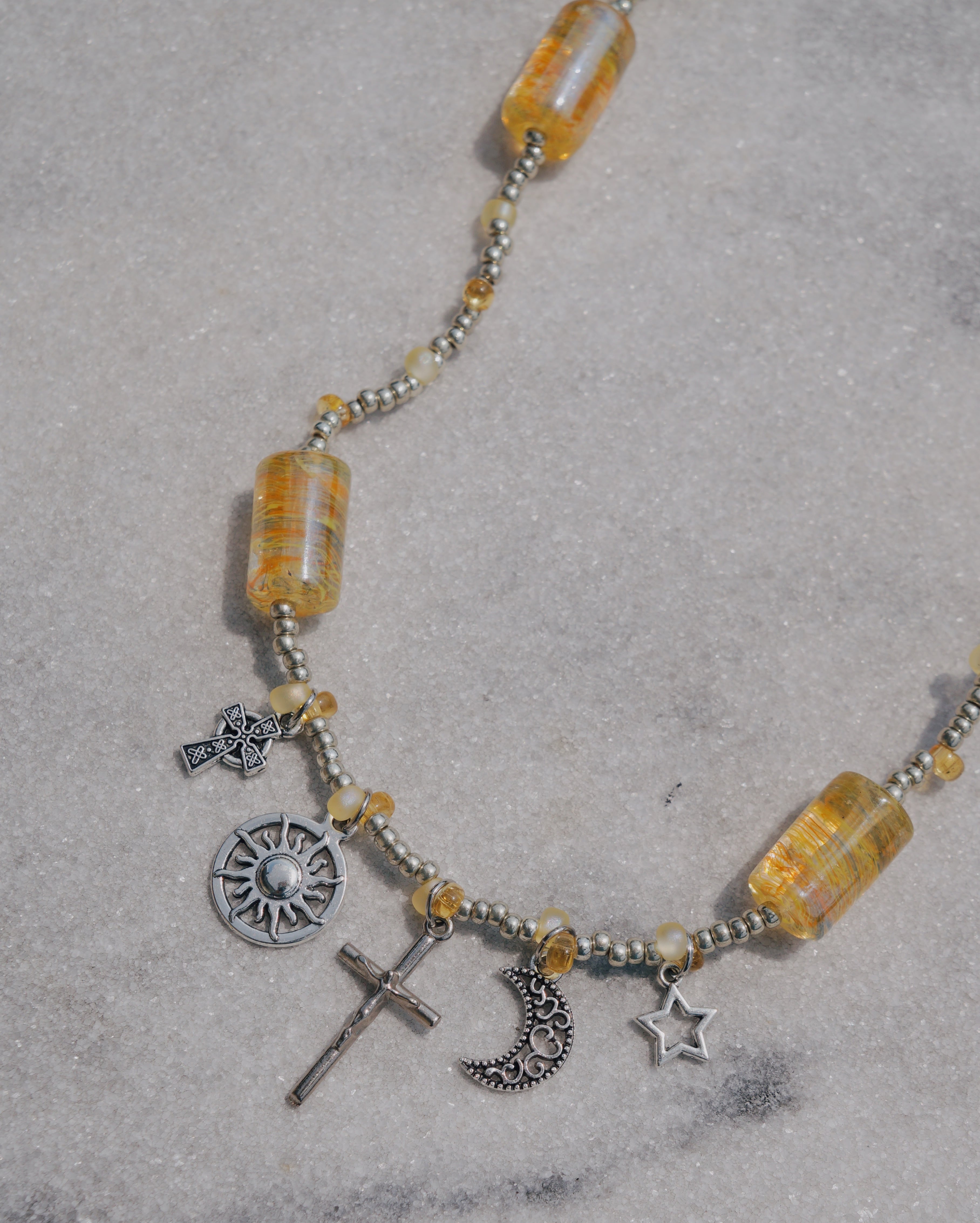 じゃらじゃらと沢山ぶら下がっているチャームが美しく可愛いネックレスです。首元を華やかにしてくれて、スタイリングの主役になるような一点です