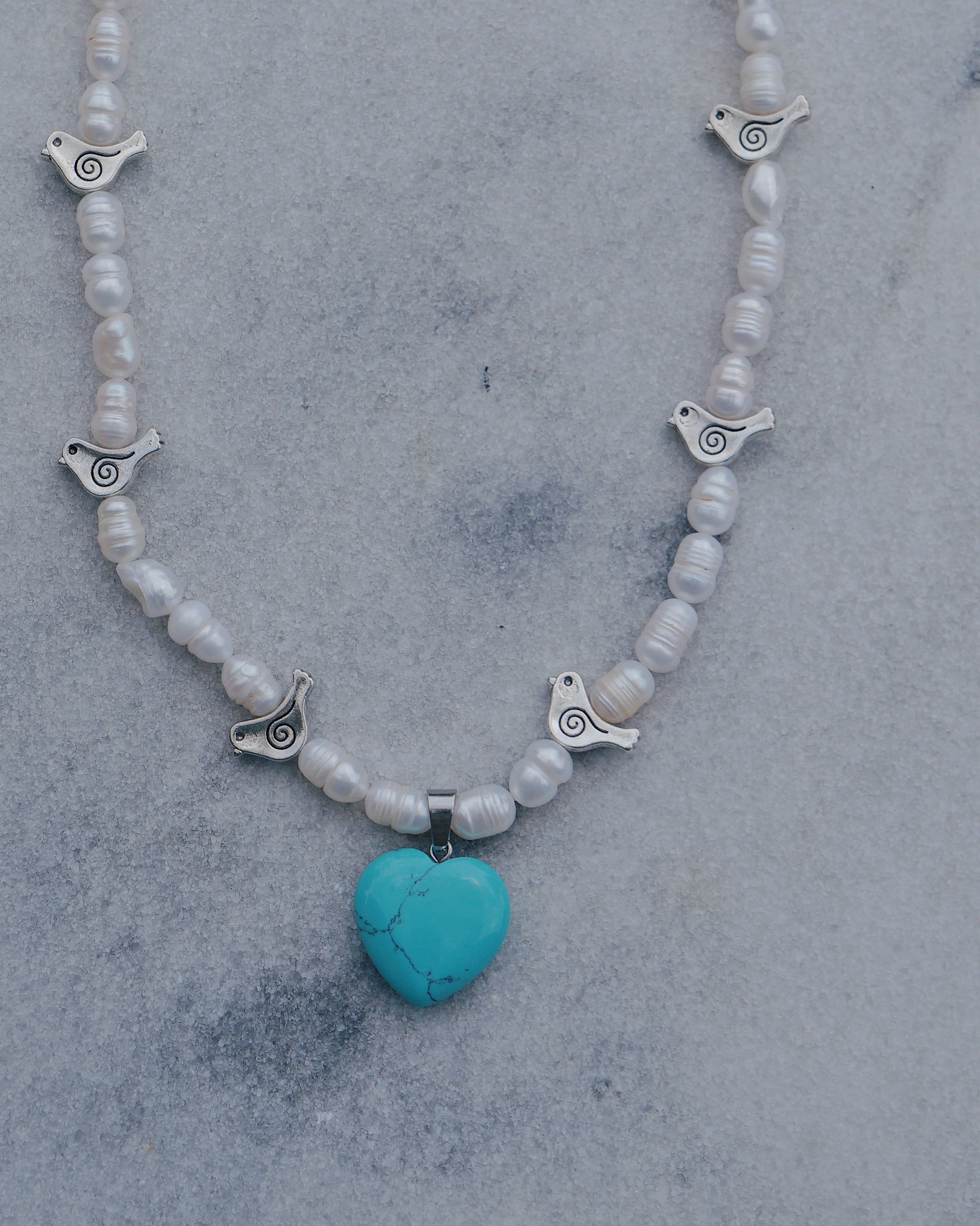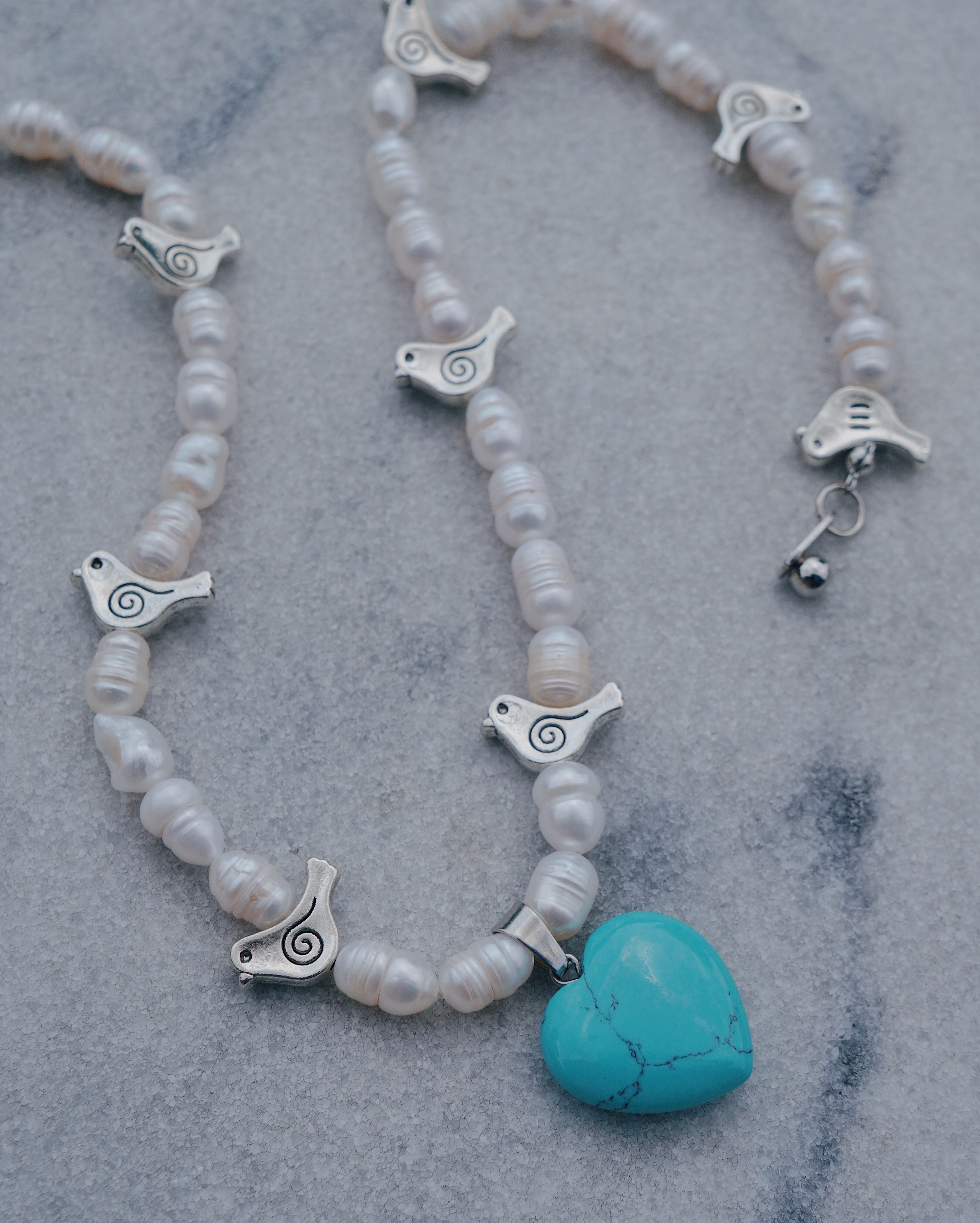 小鳥のビーズと、ターコイズのハートチャーム、淡水パールを使った可愛らしいネックレスです。カジュアルなスタイリングにはもちろん、ドレッシーなスタイリングにもぴったりな一点です。