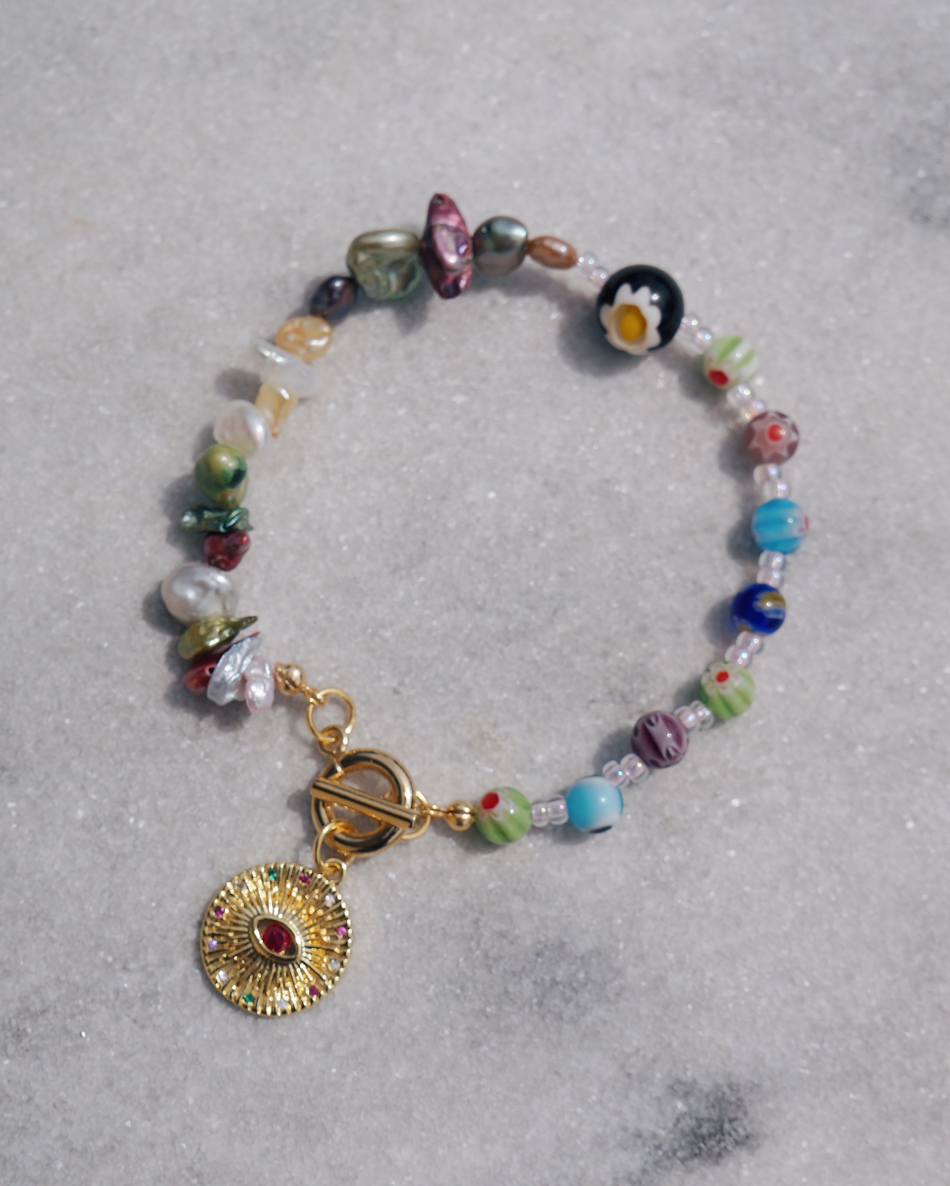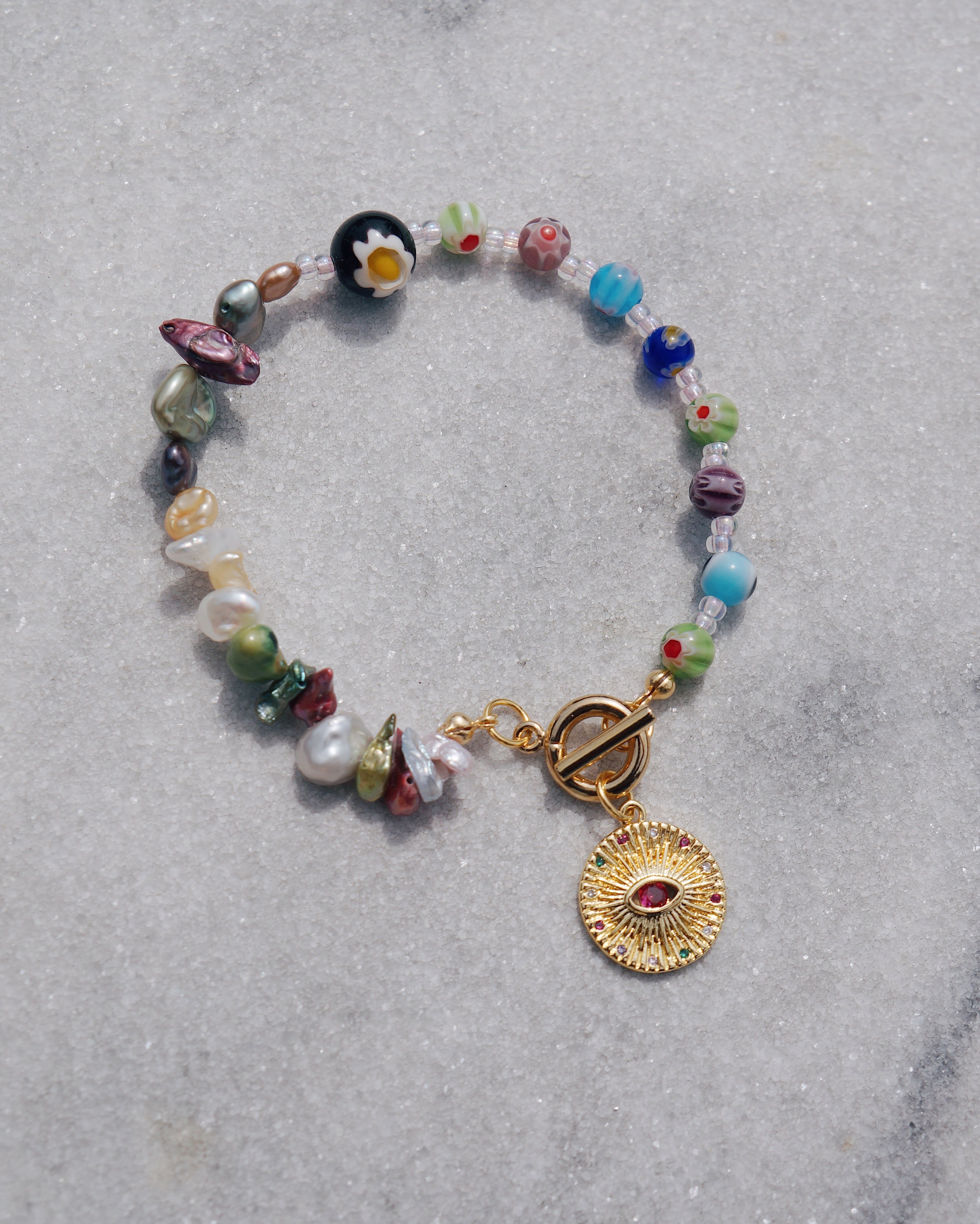 淡いカラーの淡水パールとミルフィオリのガラスビーズを使ったブレスレットです。これだけで手元が一気に華やかになり、コーディネートのポイントになるようなアイテムです。