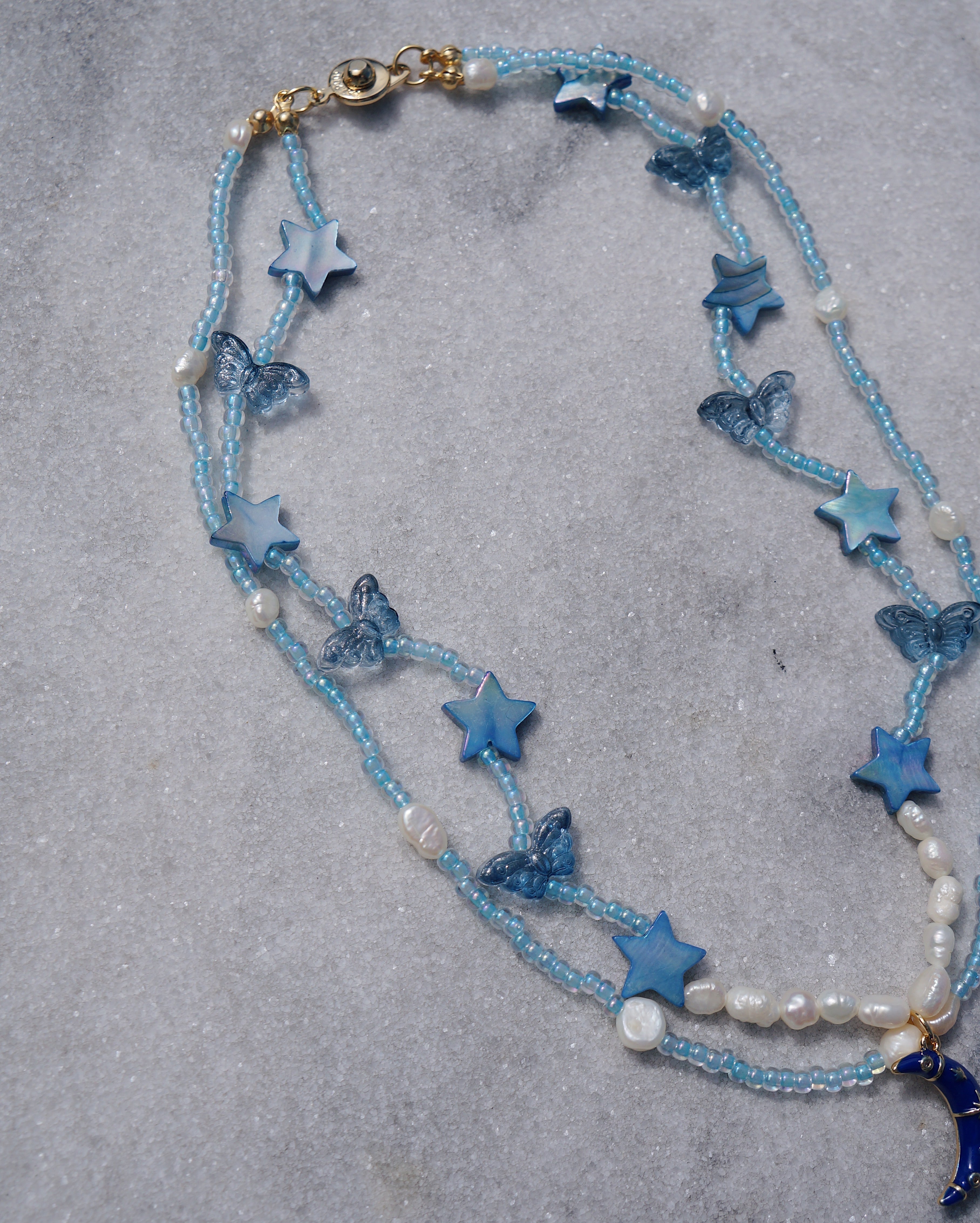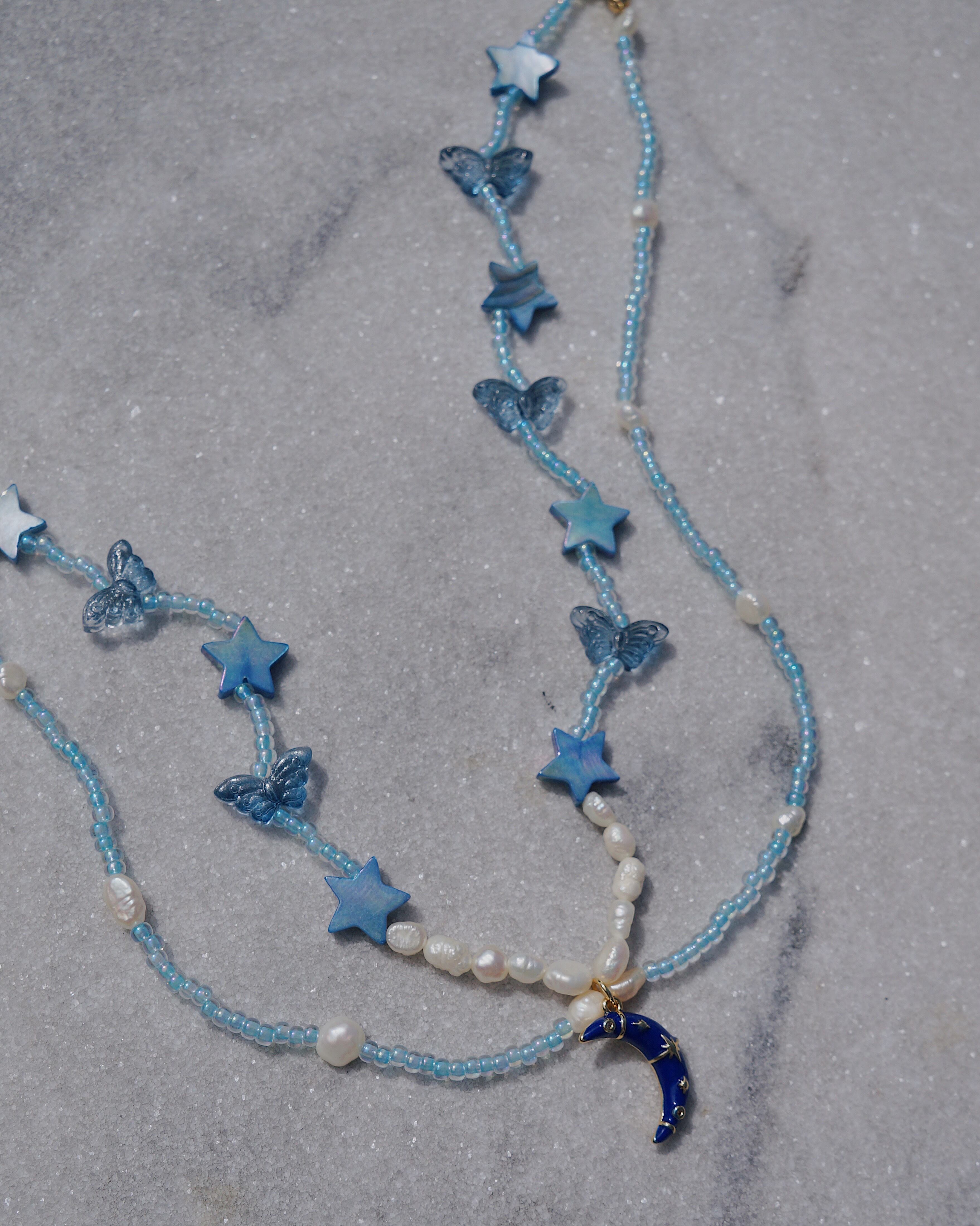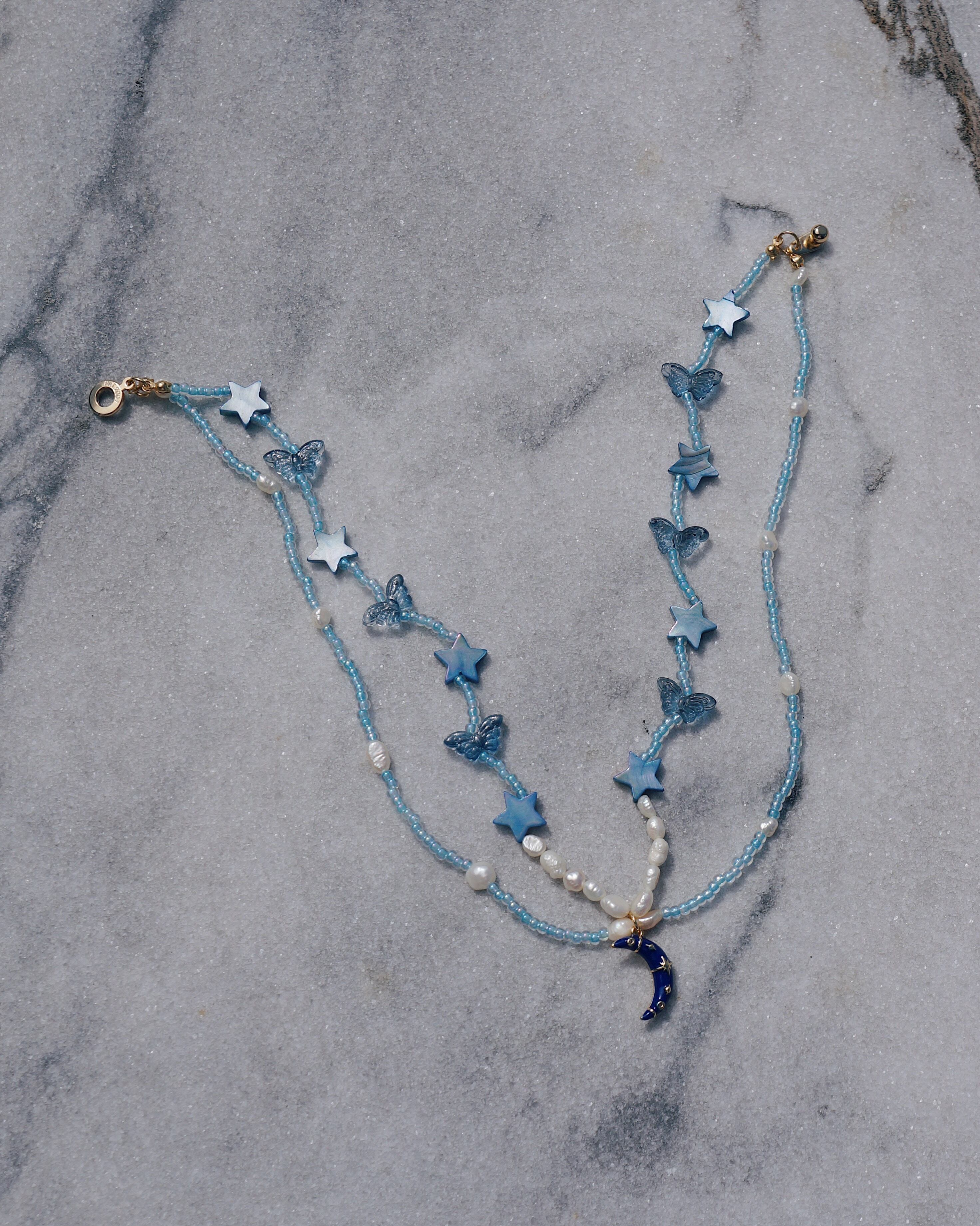 蝶のビーズや淡水シェルの星のビーズ、淡水パールなどを使い儚く美しい夜空をイメージしてデザインしたネックレスです。どのようなスタイルにも合せやすいカラーコンビネーションにまとめてありますが、2連のデザインにした事で、これ一つで存在感のあるアイテムに仕上げました。