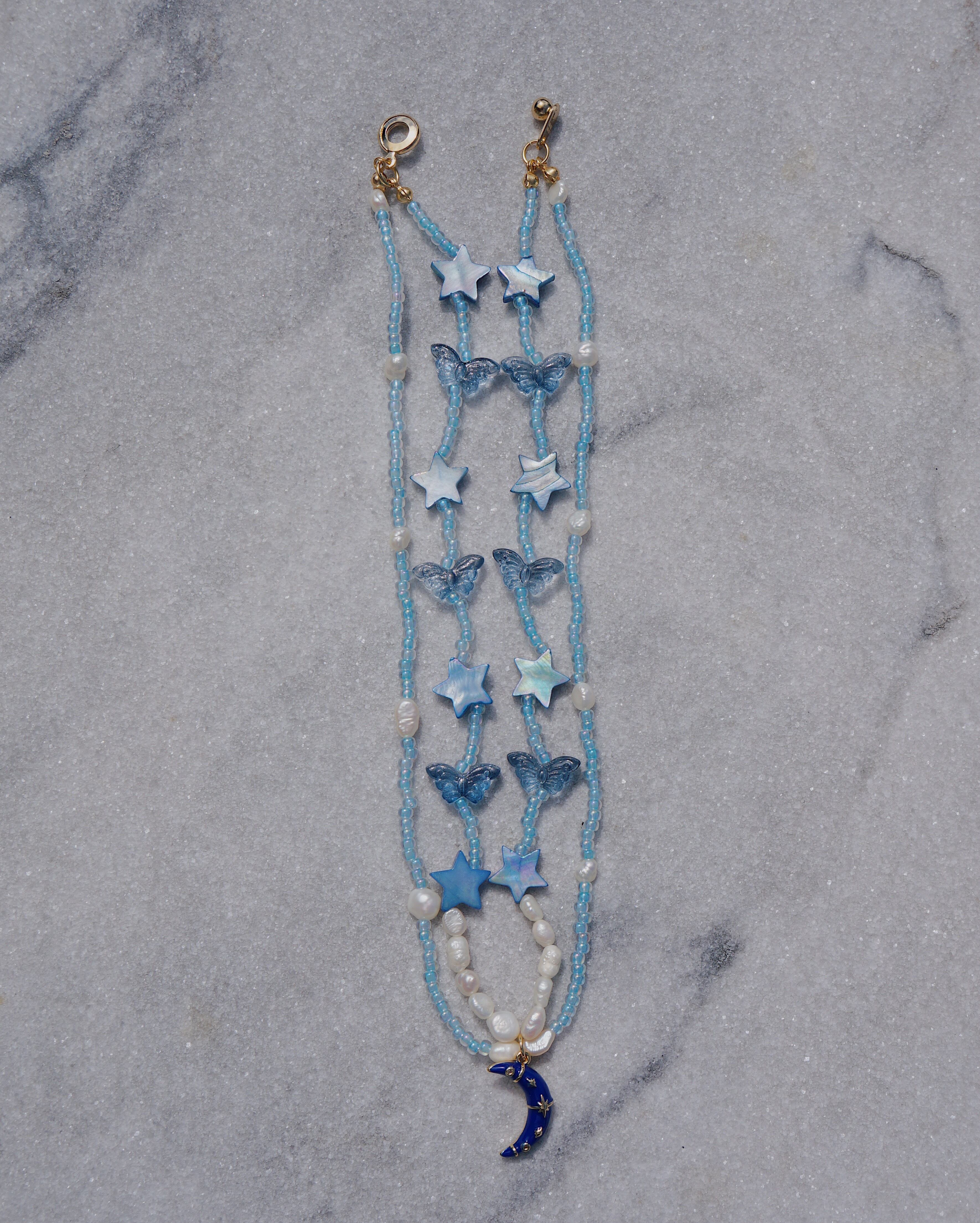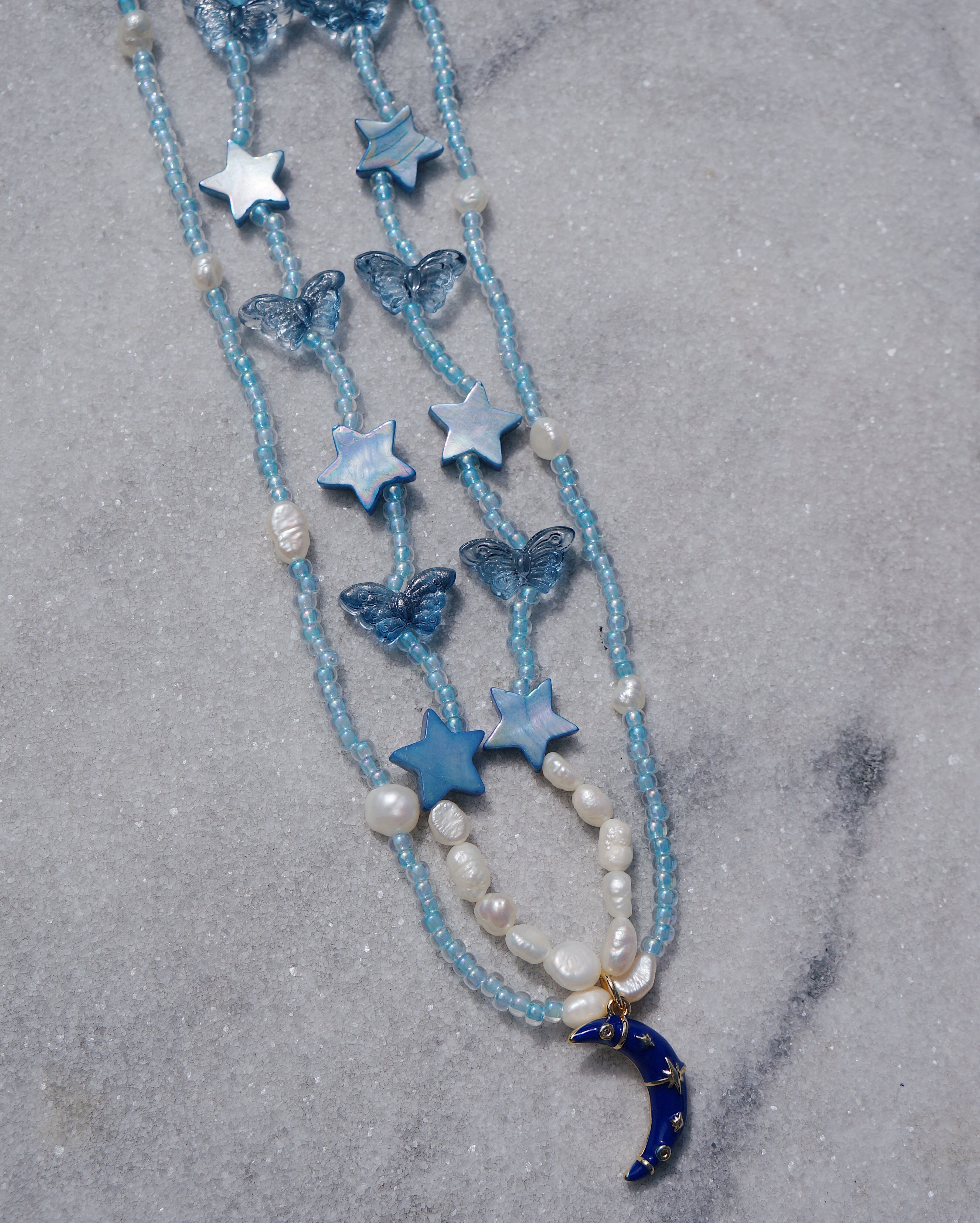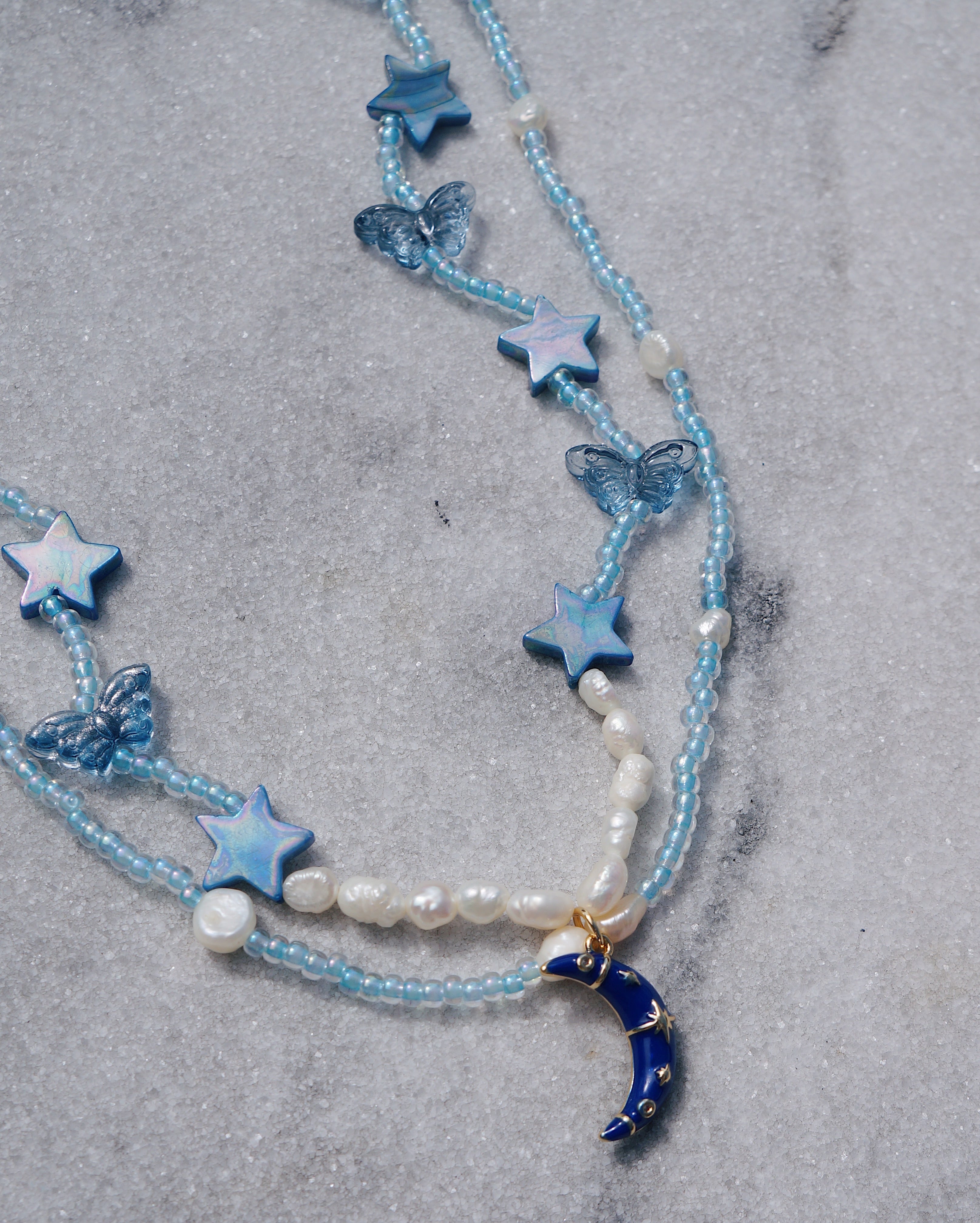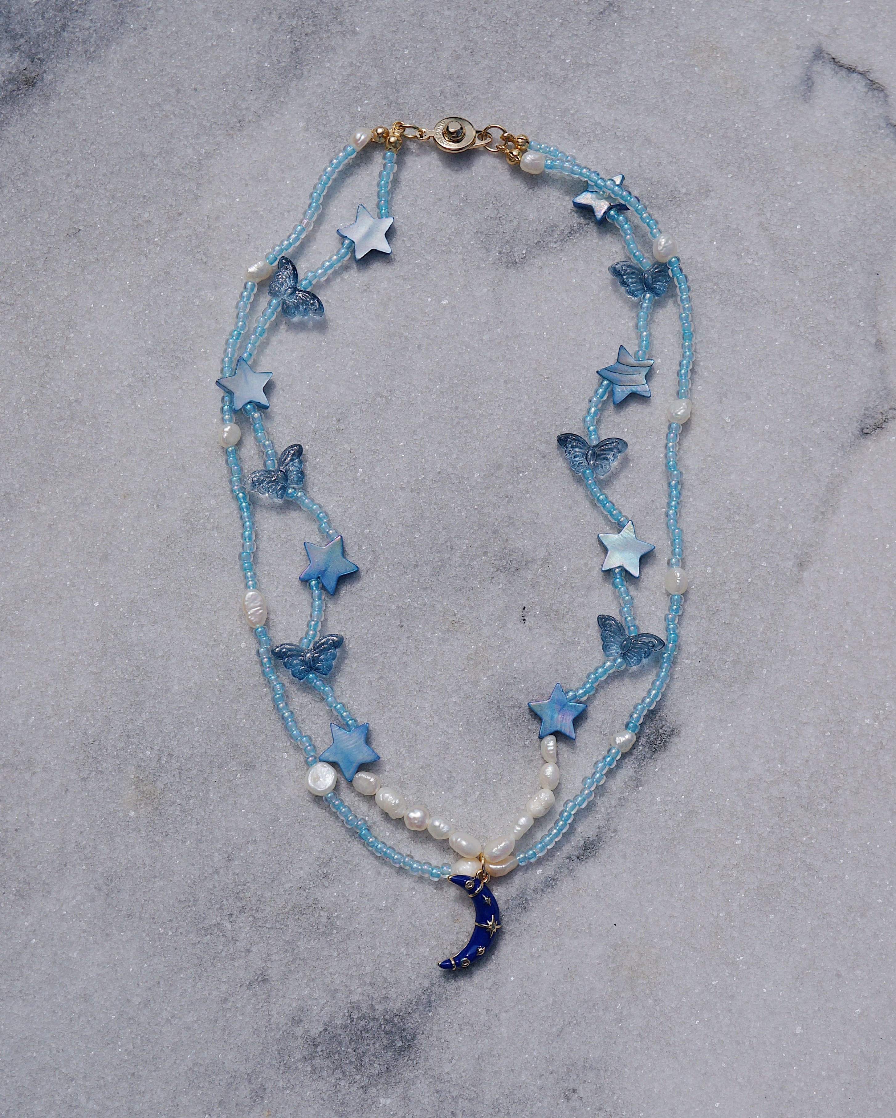 蝶のビーズや淡水シェルの星のビーズ、淡水パールなどを使い儚く美しい夜空をイメージしてデザインしたネックレスです。どのようなスタイルにも合せやすいカラーコンビネーションにまとめてありますが、2連のデザインにした事で、これ一つで存在感のあるアイテムに仕上げました。