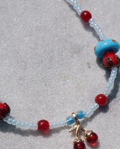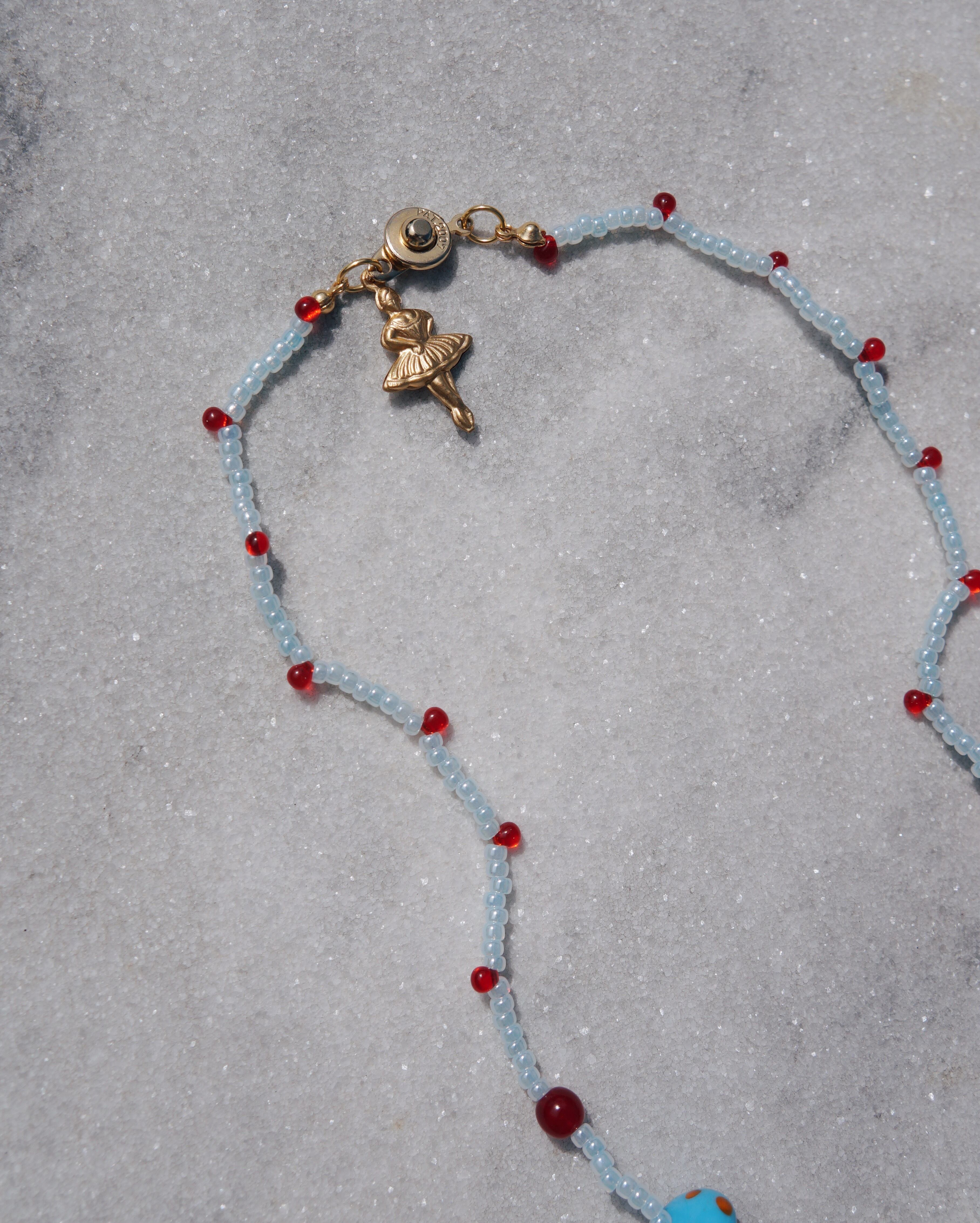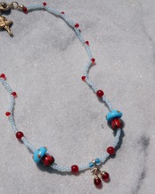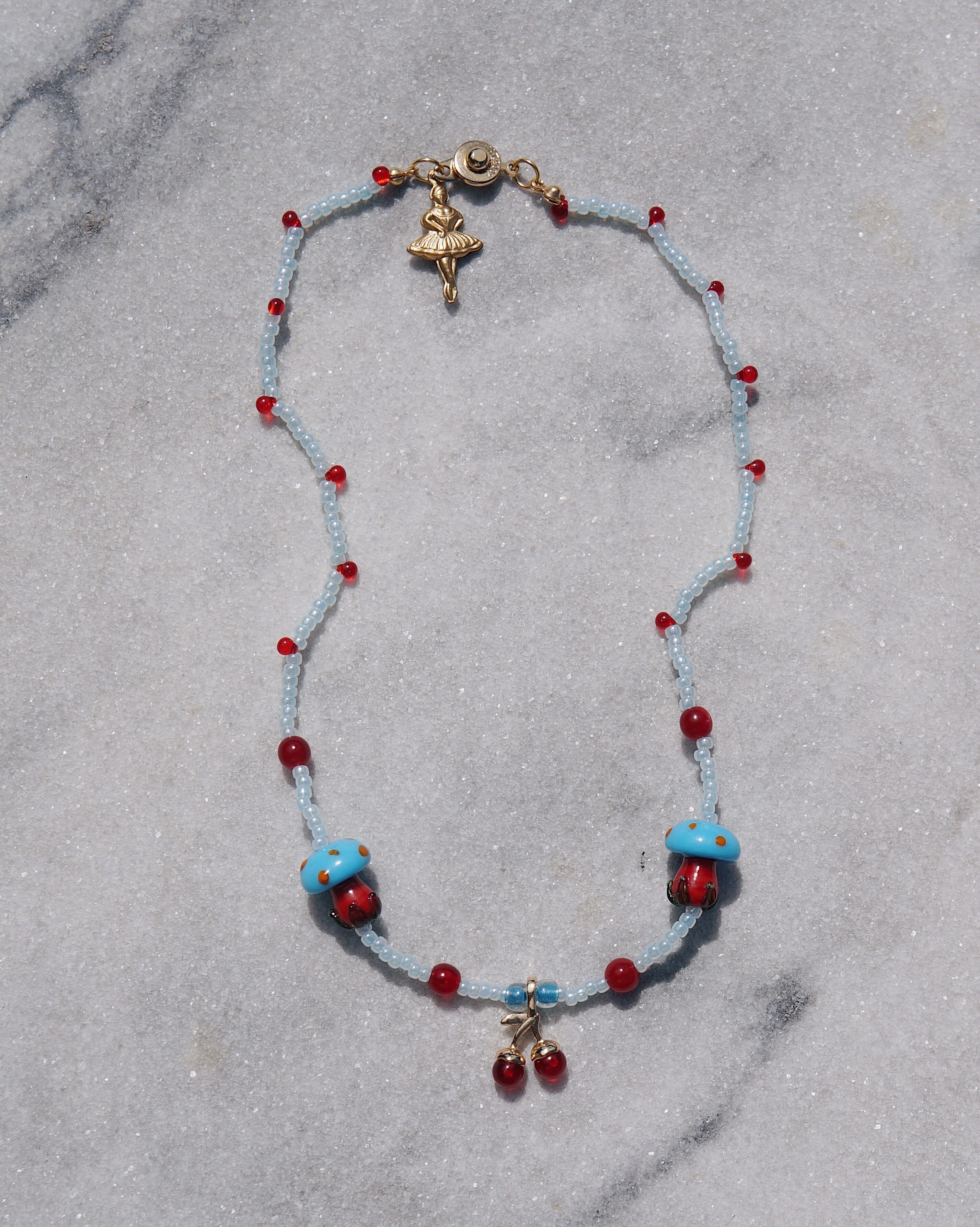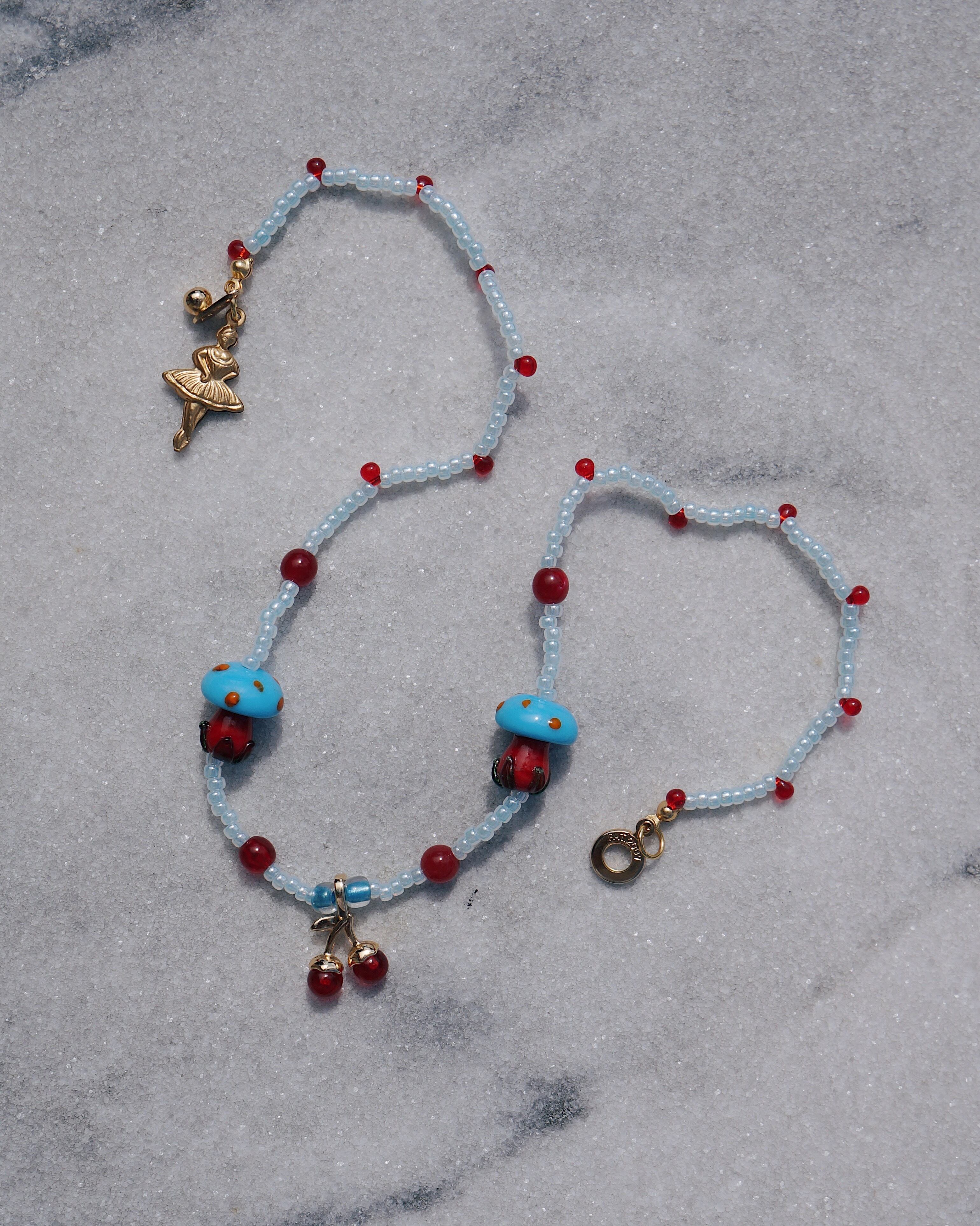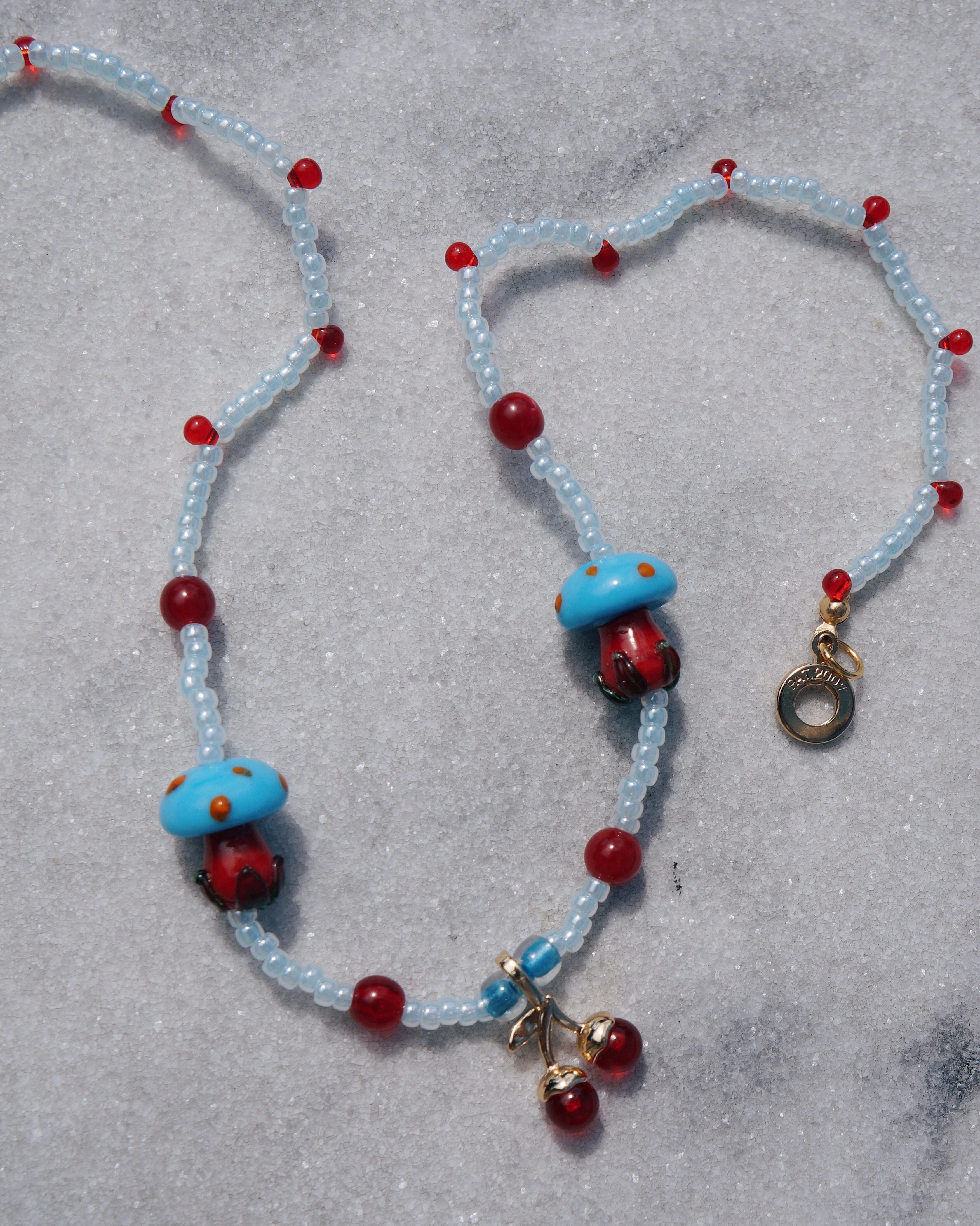水色と赤という絶妙で心くすぐられるキュートなカラーコンビネーションと、ガラスビーズのキノコとチェリーのチャームが目を惹く個性的な一点です。少し毒々しいようなデザインの中にどこか美しさもあるJBCGらしいネックレスです。