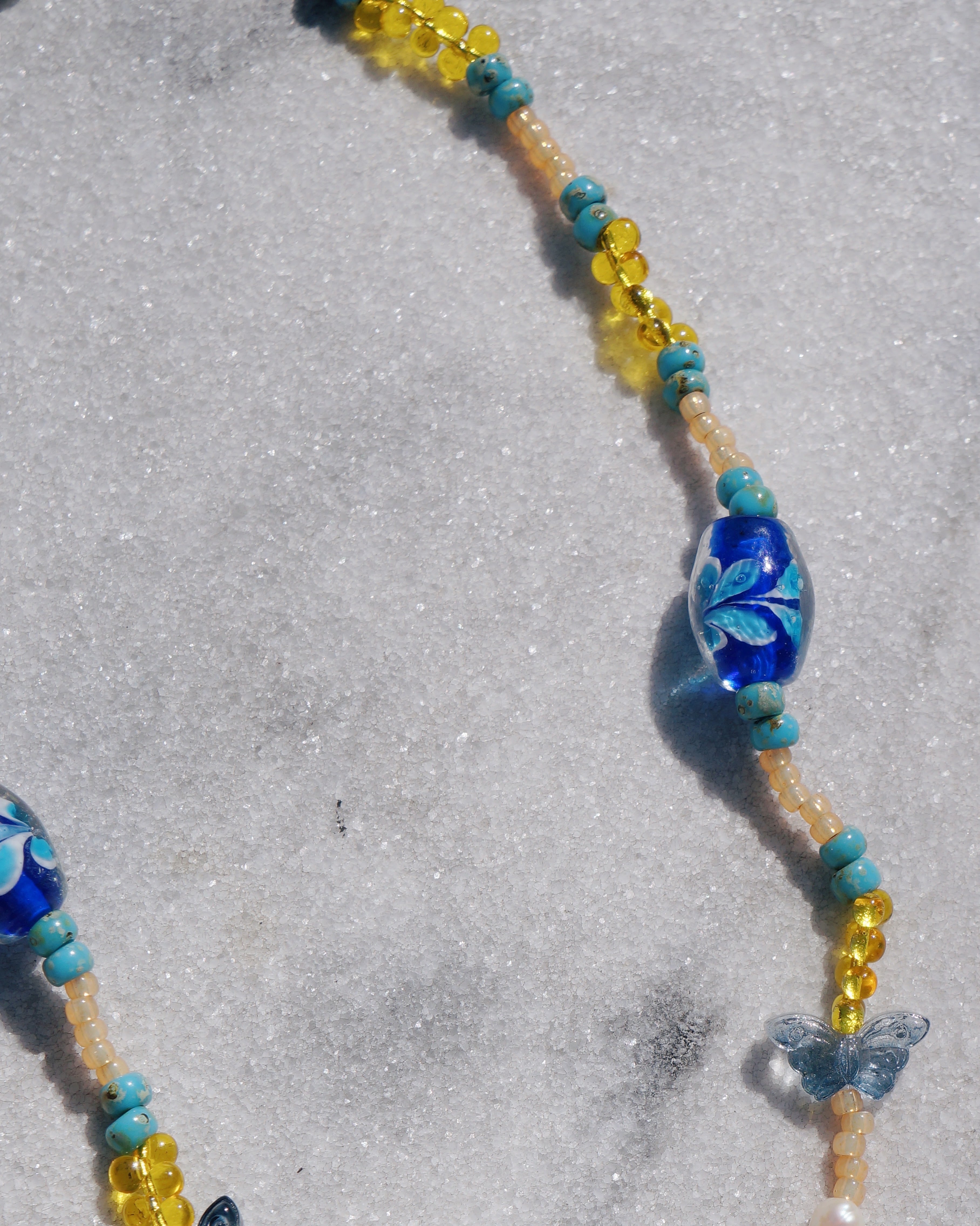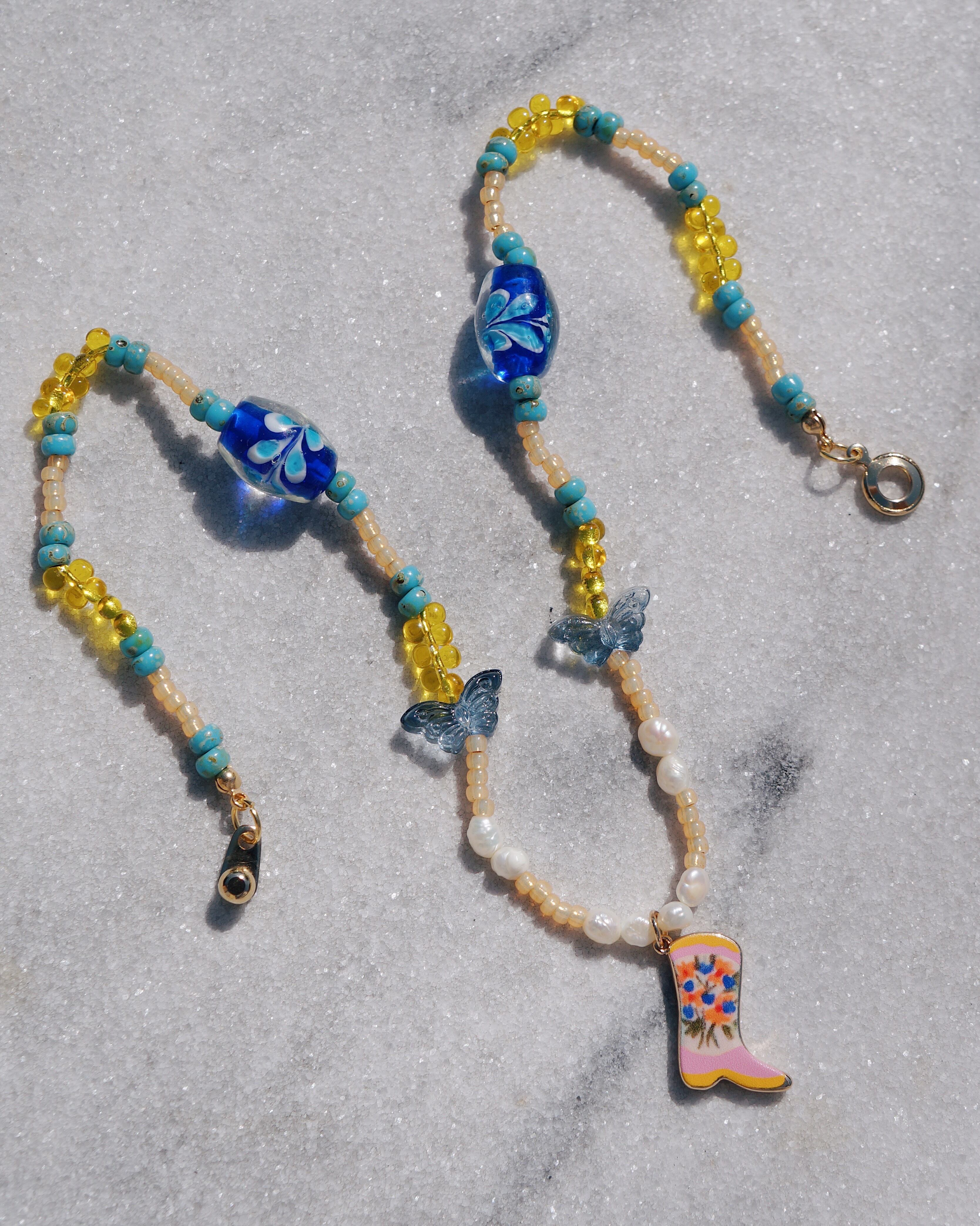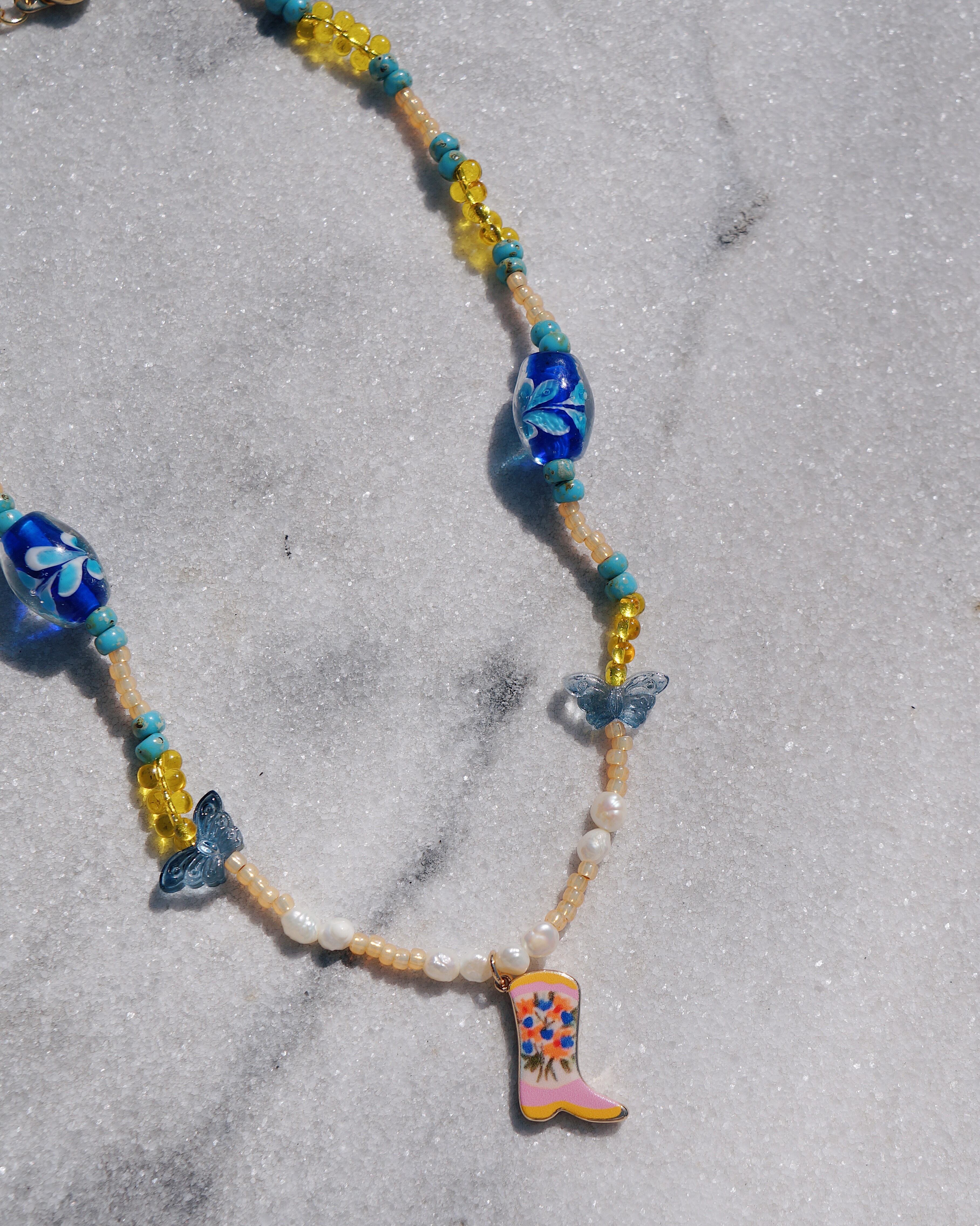 絶妙で心くすぐられるキュートなカラーコンビネーションと、ガラスビーズや蝶のビーズ、ウェスタンブーツのチャームが目を惹く個性的な一点です。25232のピアスとセットで一緒に使っていただくと相性が良く素敵だと思います。